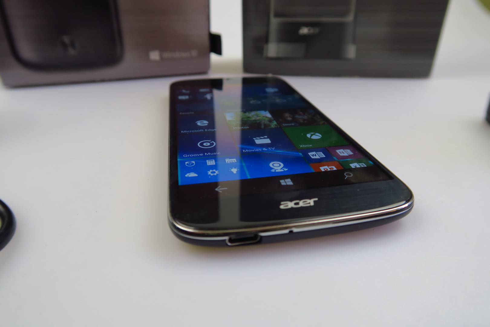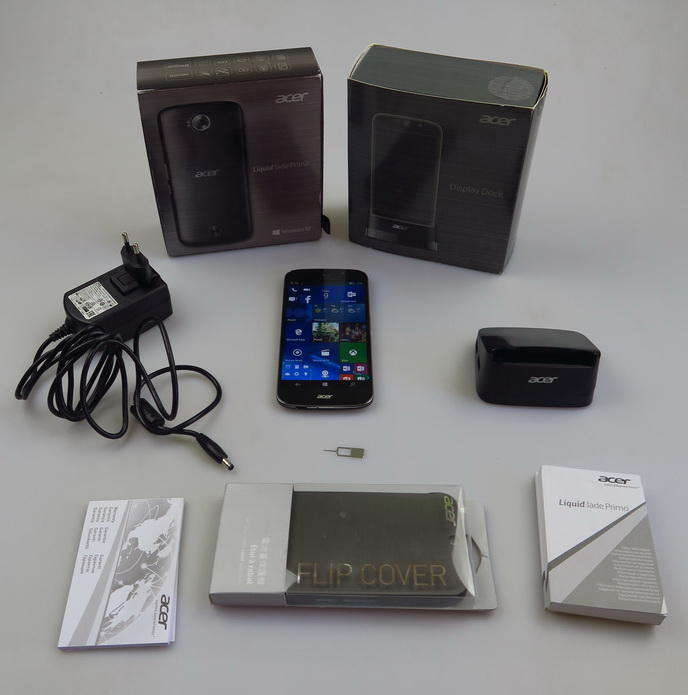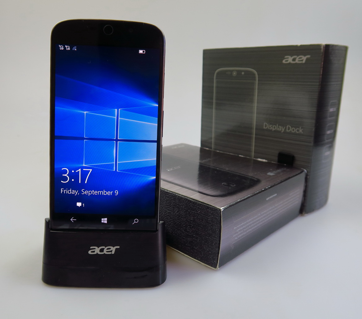 The handset itself is a Windows 10 Mobile upper midranger, with a Snapdragon 808 CPU and 5.5 inch screen. Inside its own box there’s a manual, metal key to open the slots, a set of headphones, USB Type C cable and there should also be a charger, that out test unit lacked. Then there’s the special Acer Display Dock, that connects to the phone, a monitor, keyboard and mouse, offering a sort of PC replacement.