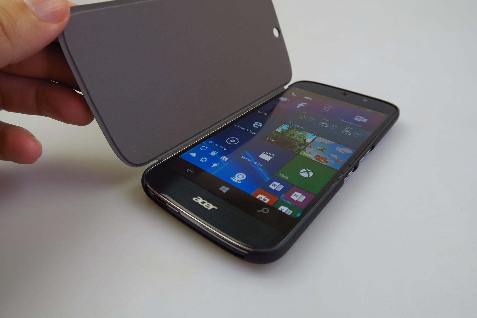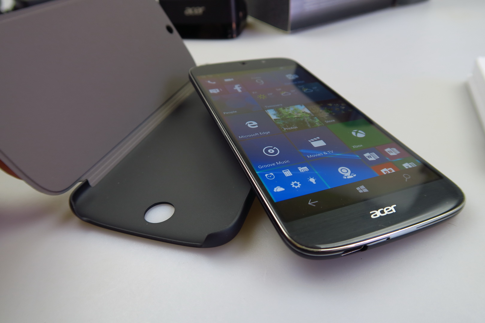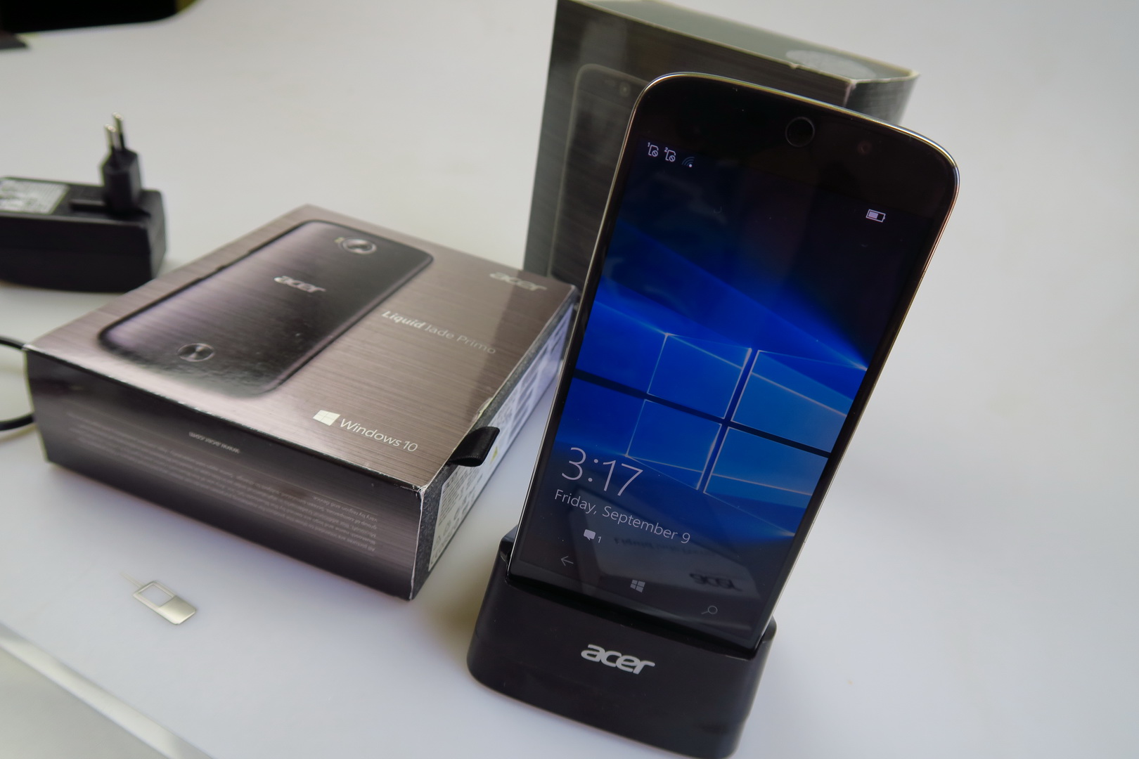 The handset itself is a Windows 10 Mobile upper midranger, with a Snapdragon 808 CPU and 5.5 inch screen. Inside its own box there’s a manual, metal key to open the slots, a set of headphones, USB Type C cable and there should also be a charger, that out test unit lacked. Then there’s the special Acer Display Dock, that connects to the phone, a monitor, keyboard and mouse, offering a sort of PC replacement.