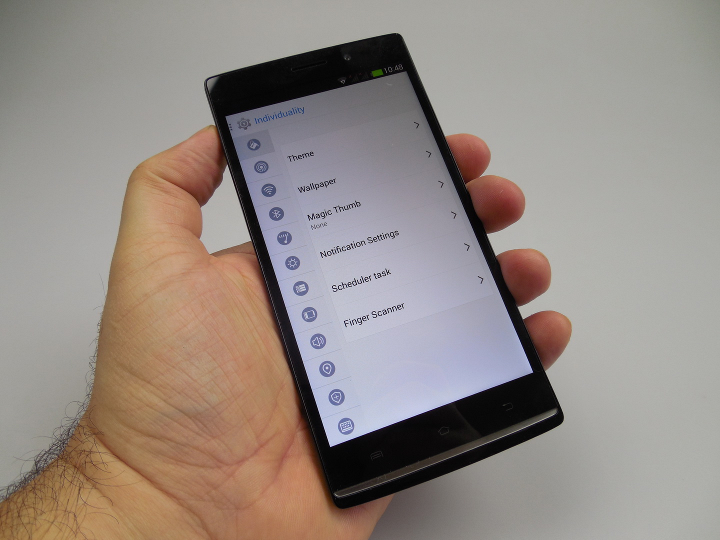 The dropdown area has a minimalistic UI, shows Quick Settings and notifications. The Settings offer a new design compared to what we’re used to on an Allview. There’s a left side list and the core options on the right New and interesting features are found here, like Magic Cursor, with a variety of shapes used as pointers, custom notification area, show network speed, schedule activities and finally the selling point: fingerprint scanner.