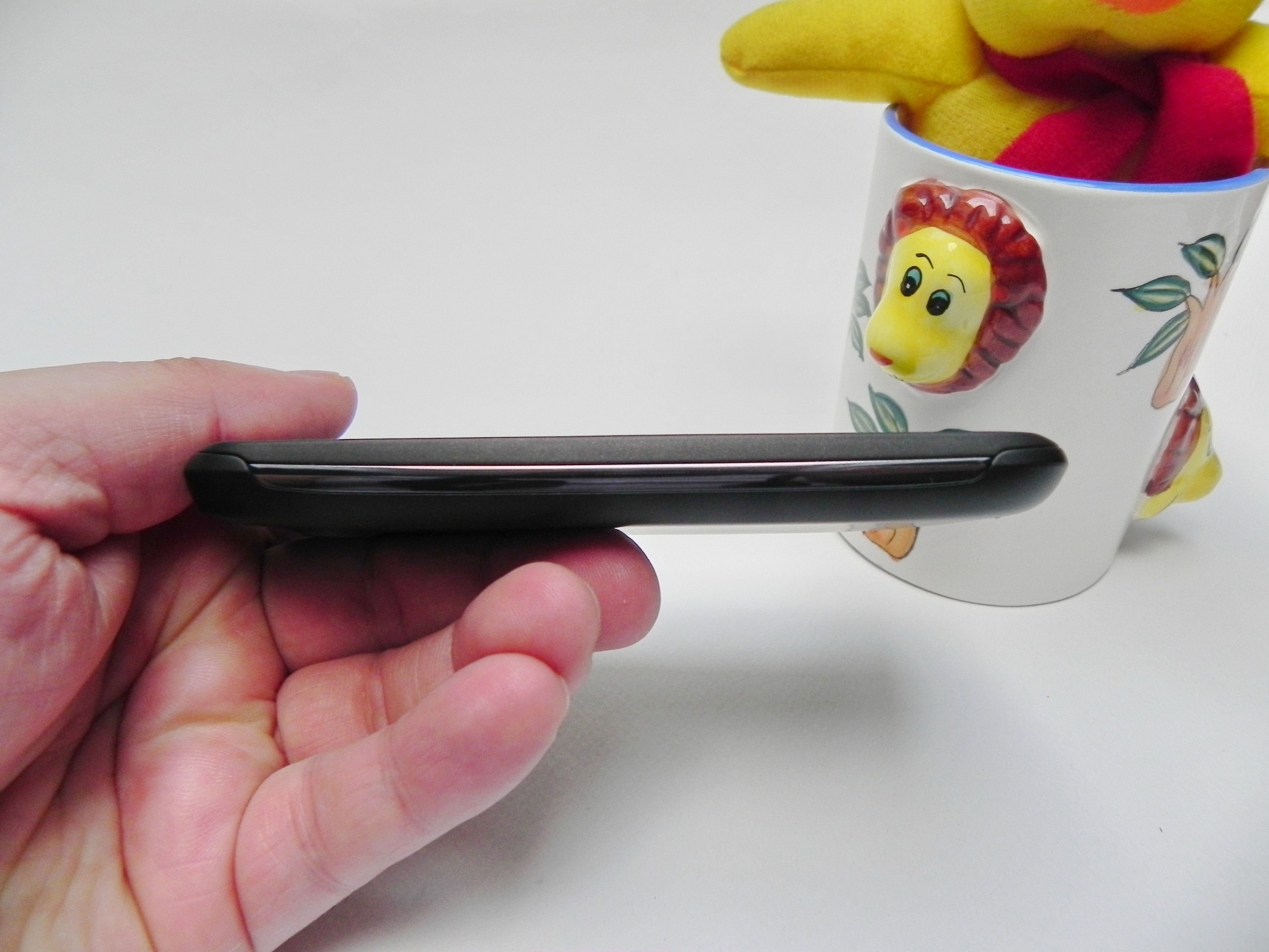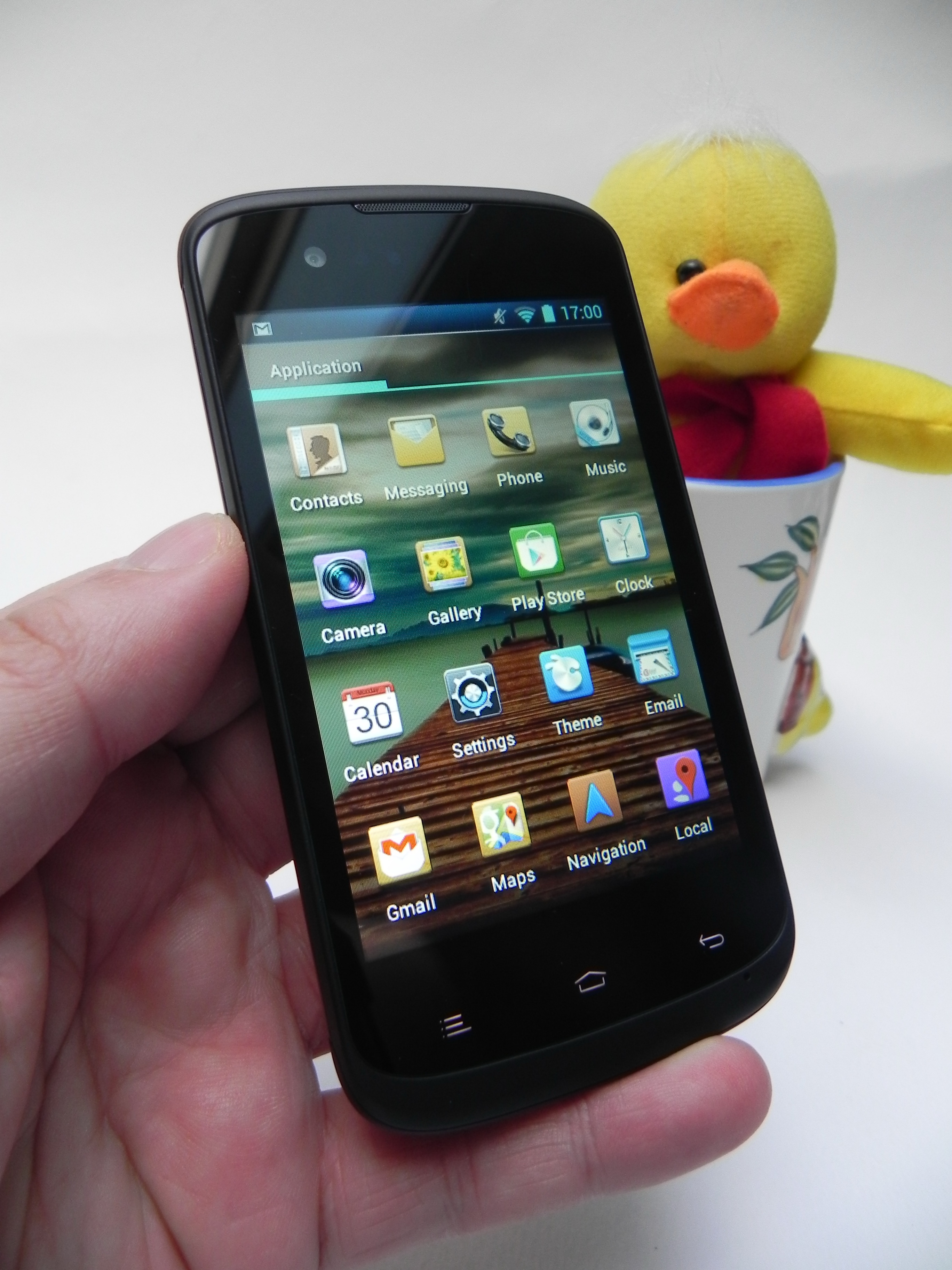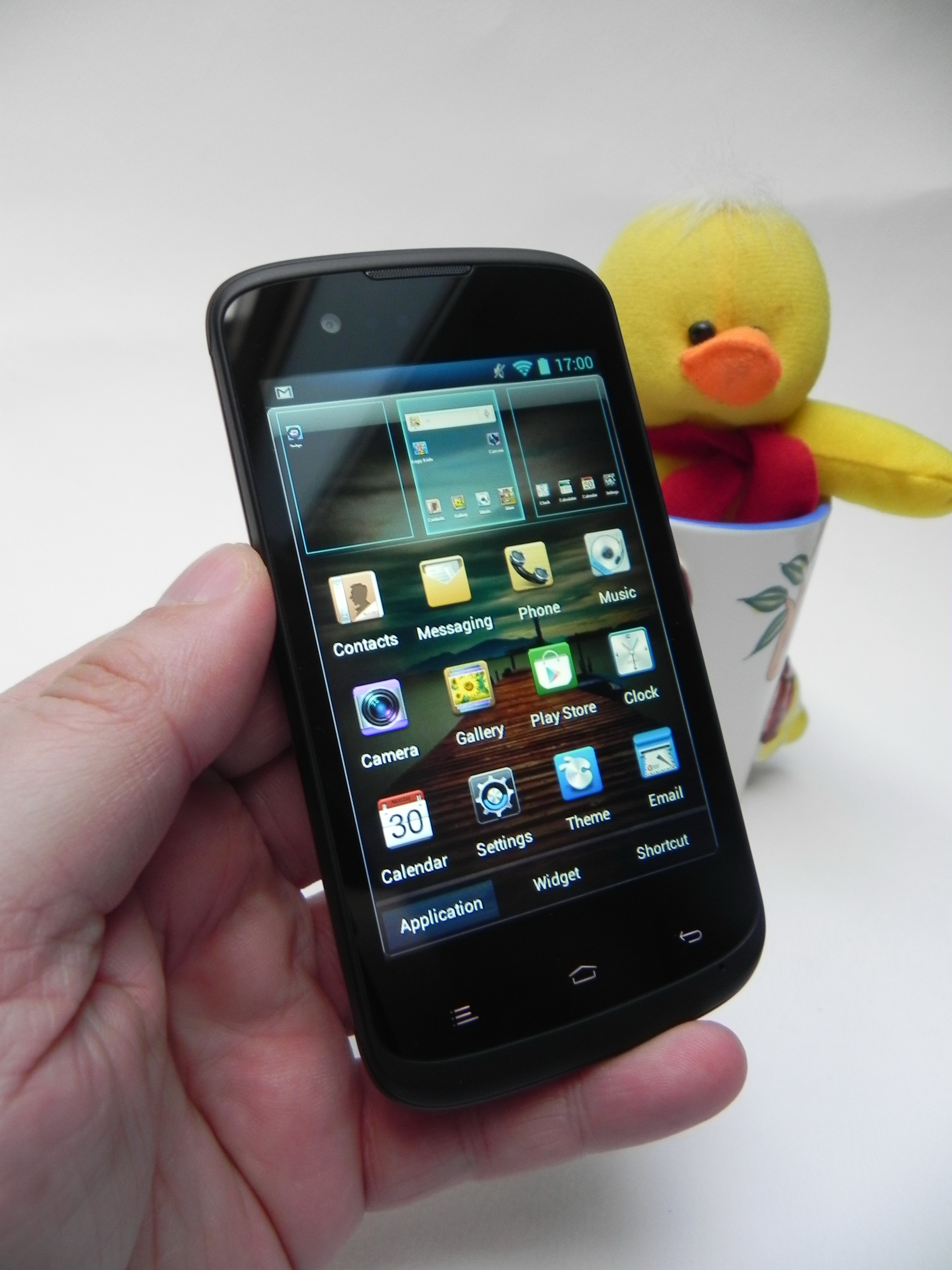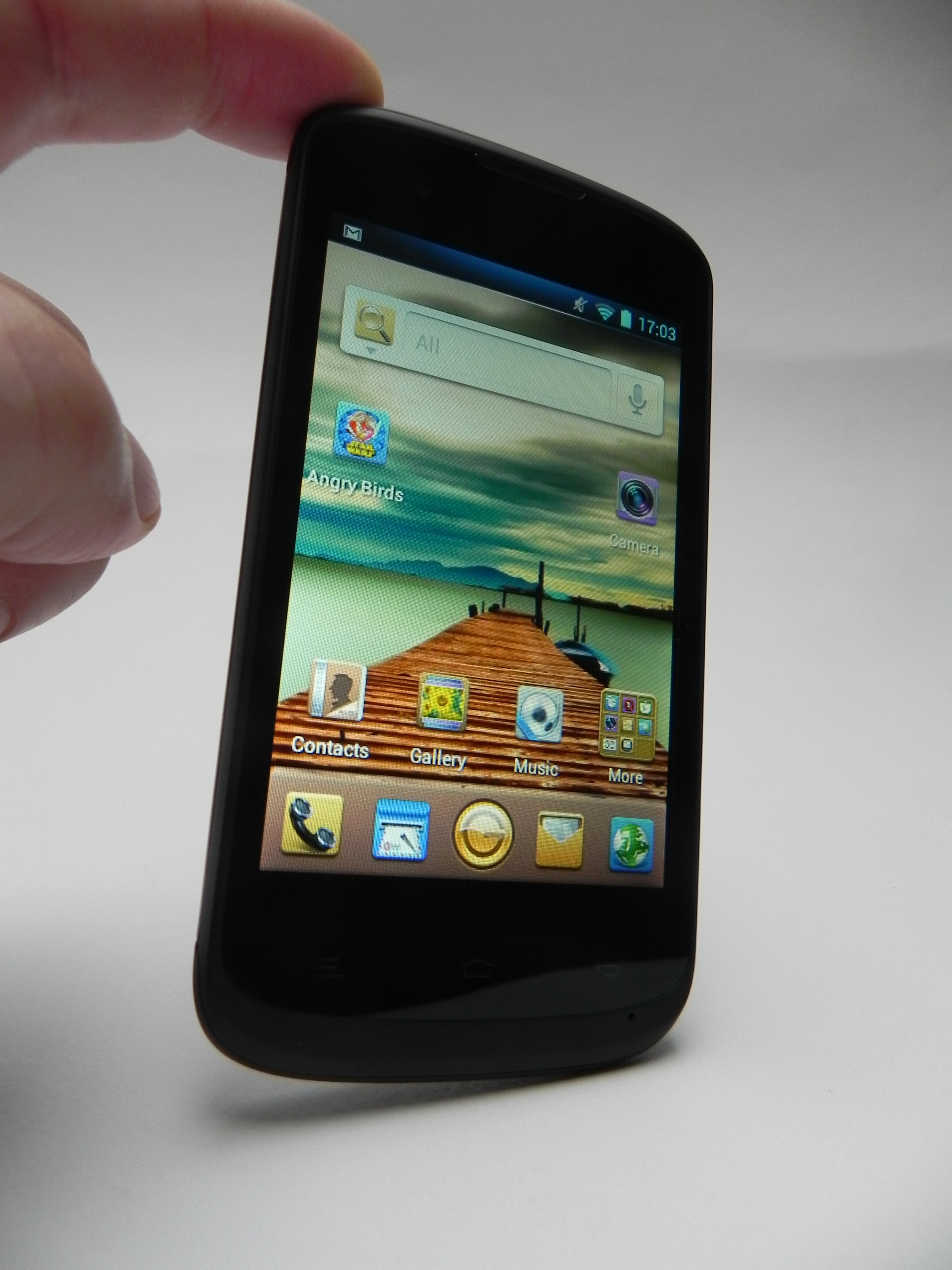 This is a dual SIM budget phone with a 3.95 inch diagonal and a design that may feel like a combo between a HTC model and an Alcatel device. The handset incorporates comfortable side physical buttons, capacitive buttons below the display and a texture just like rubber at the back. We’re dealing with a pretty bulky unit, that measures 11.2 mm in thickness and weighs 162.2 grams, so once again massive.