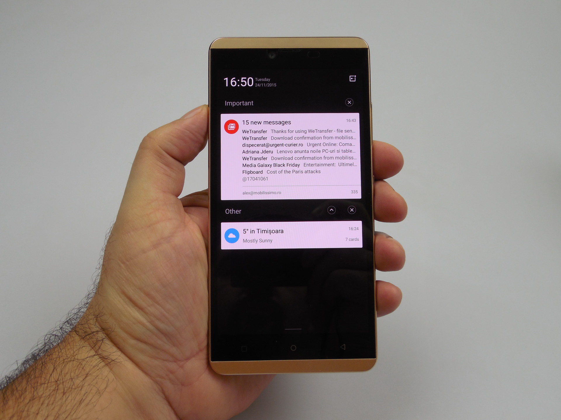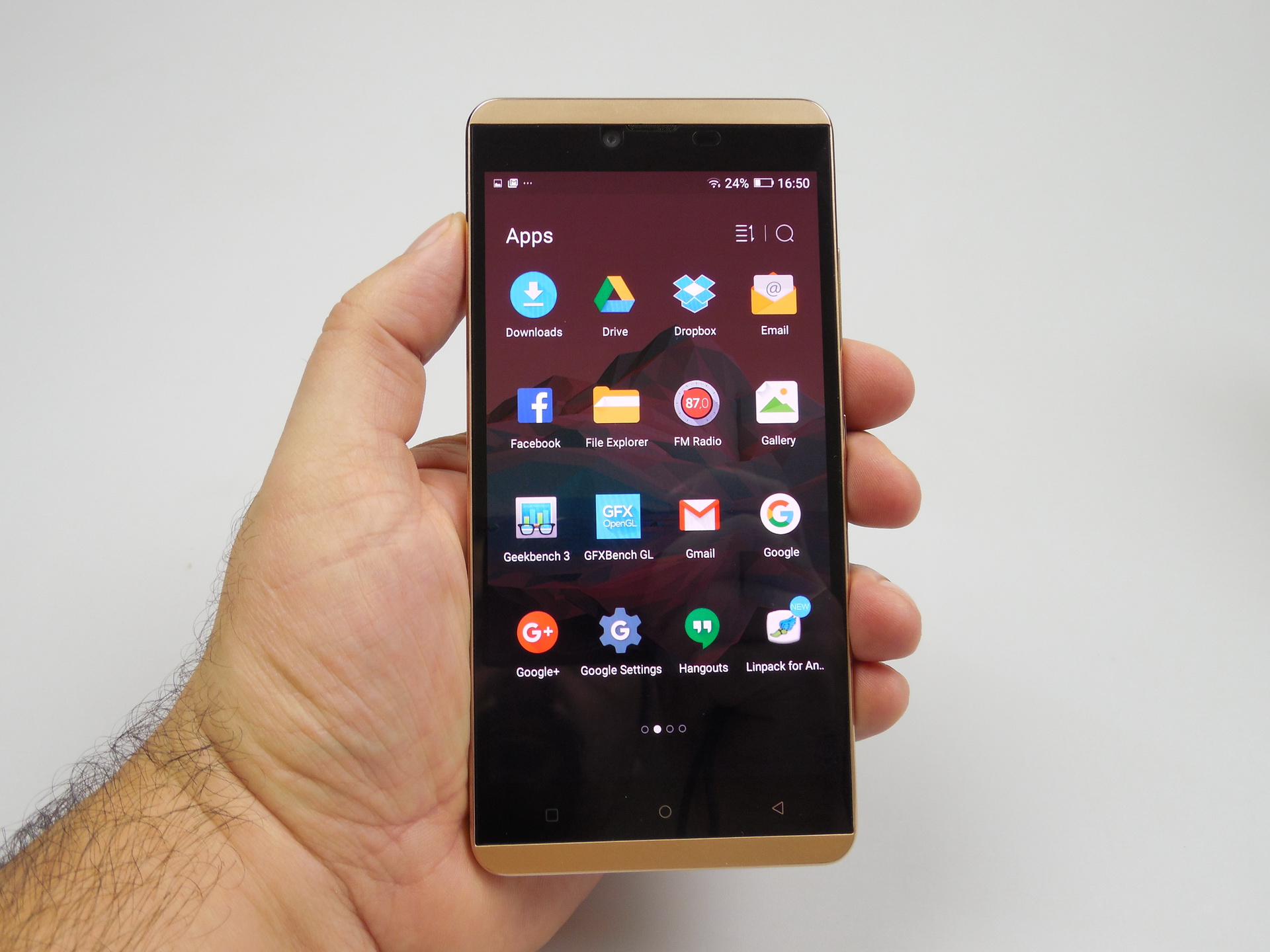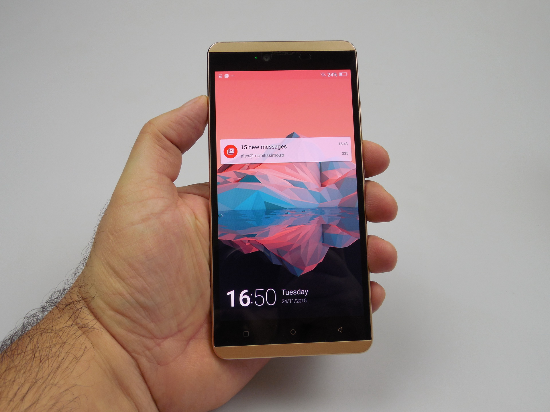 Priced at $252, the Elife S Plus is a midrange youthful phone and its Romanian version came to us in a prism shaped box. It’s the first USB Type C handset for Allview and I’m willing to be that the same applies to Gionee. Available in white, dark blue and gold, this model was tested by us in the gold hue. It’s a 5.5 inch phablet with a 7.2 mm waistline and it’s thus 0.1 mm thicker than the iPhone 6S, which is not bad.