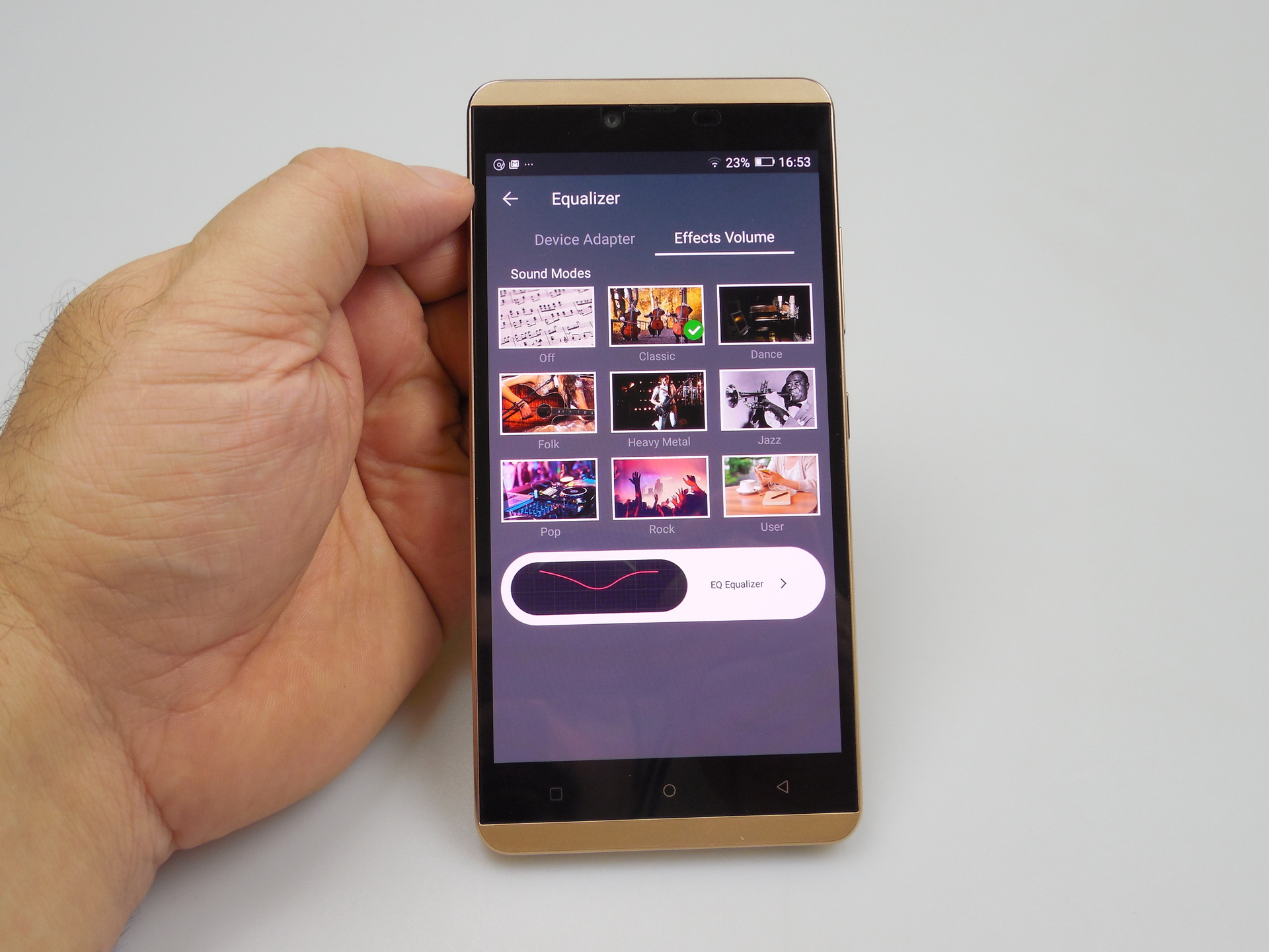 Other battery options include Intelligent Power Saving at Night, Intelligent Memory Cleanup and Standby Intelligent Power Saving. This is a good battery overall, so there’s nothing to complain about here. Let’s move on to acoustics, where we get a small speaker and an app simply called Music as the player. Options here include Shake to Change Song, an equalizer with DTS options and effects volume with the following presets: off, classic, dance, folk, heavy metal, user and 5 custom channels.