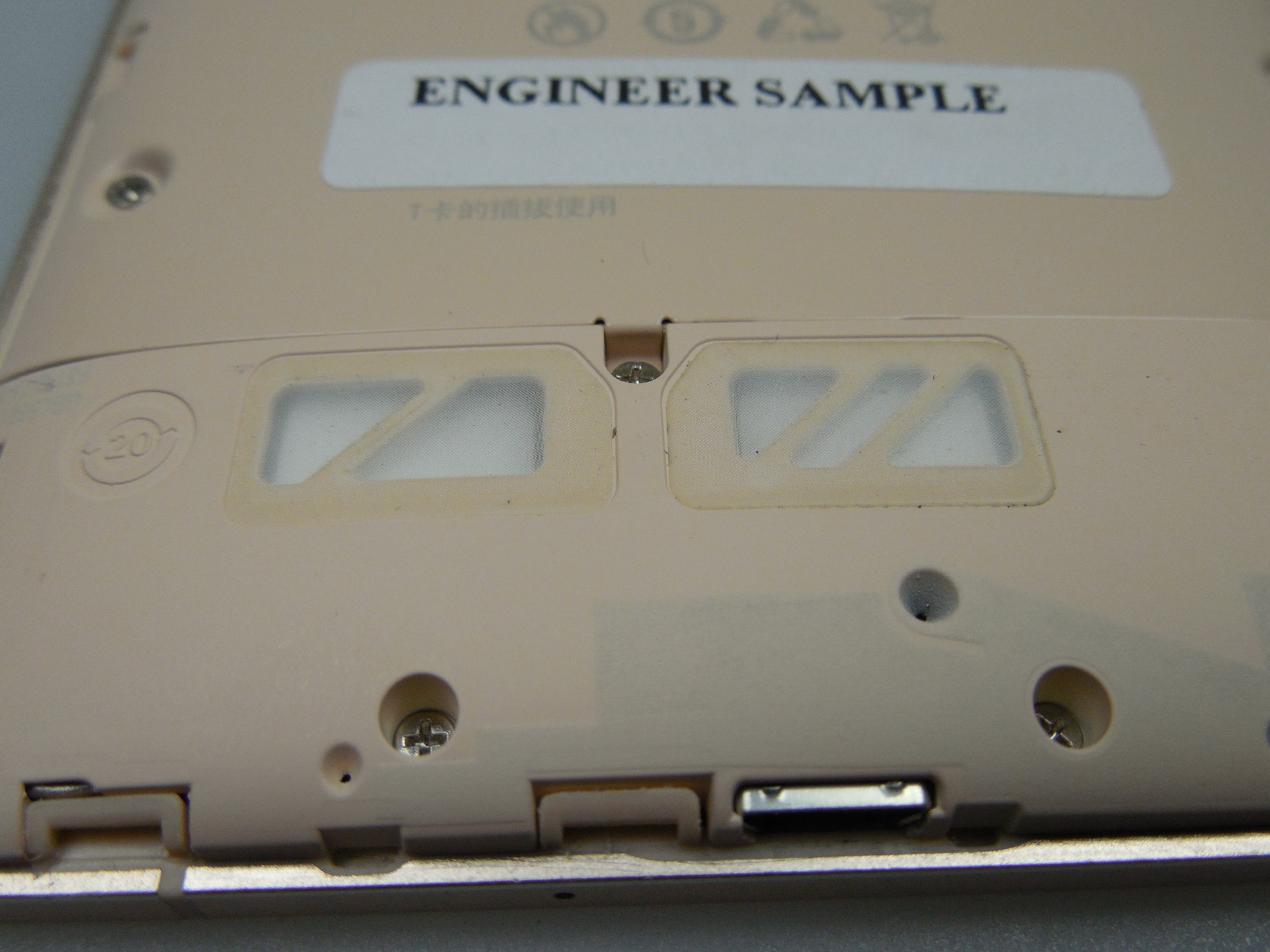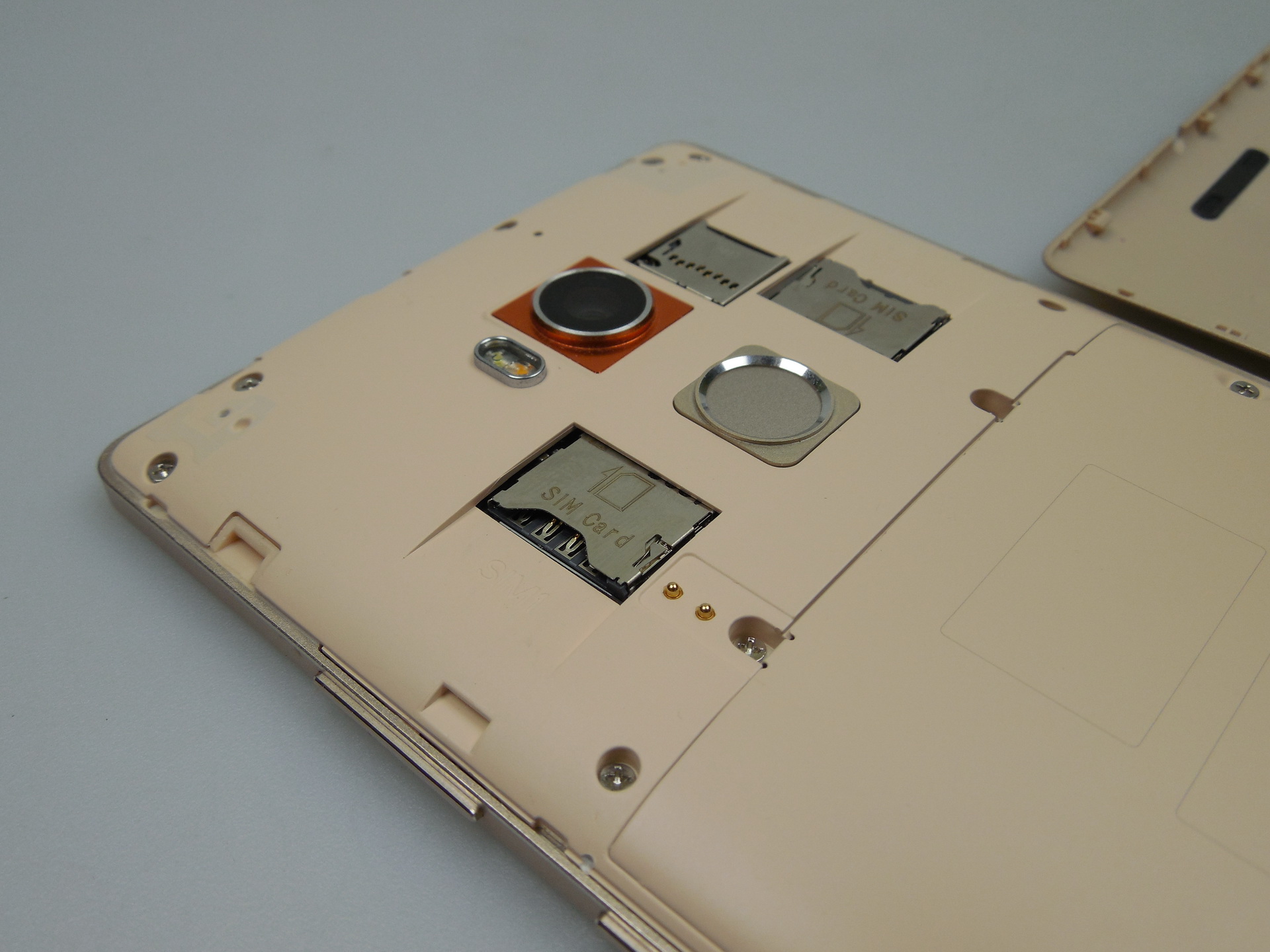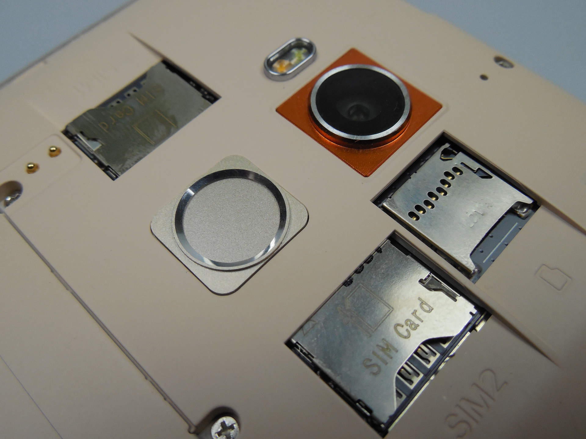 At the back there are 4 holes above the camera, associated to a powerful mic, at first sight. Then there’s the camera and dual tone flash, plus the fingerprint scanner and speaker, all of them at the back, too. Once the polycarbonate lid is removed here, which is not easy to do, we uncover the non removable battery, a single mic under the 4 holes, two SIM slots, a microSD one and a speaker that’s smaller than its grille.