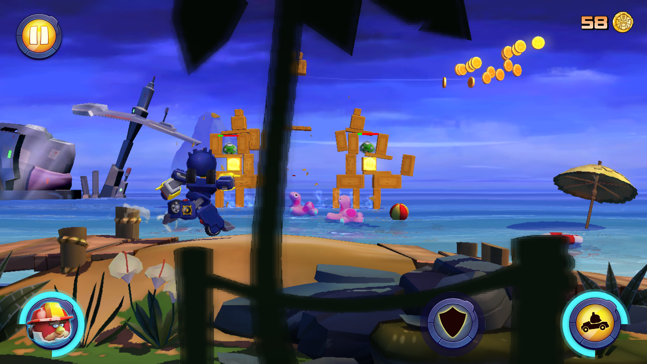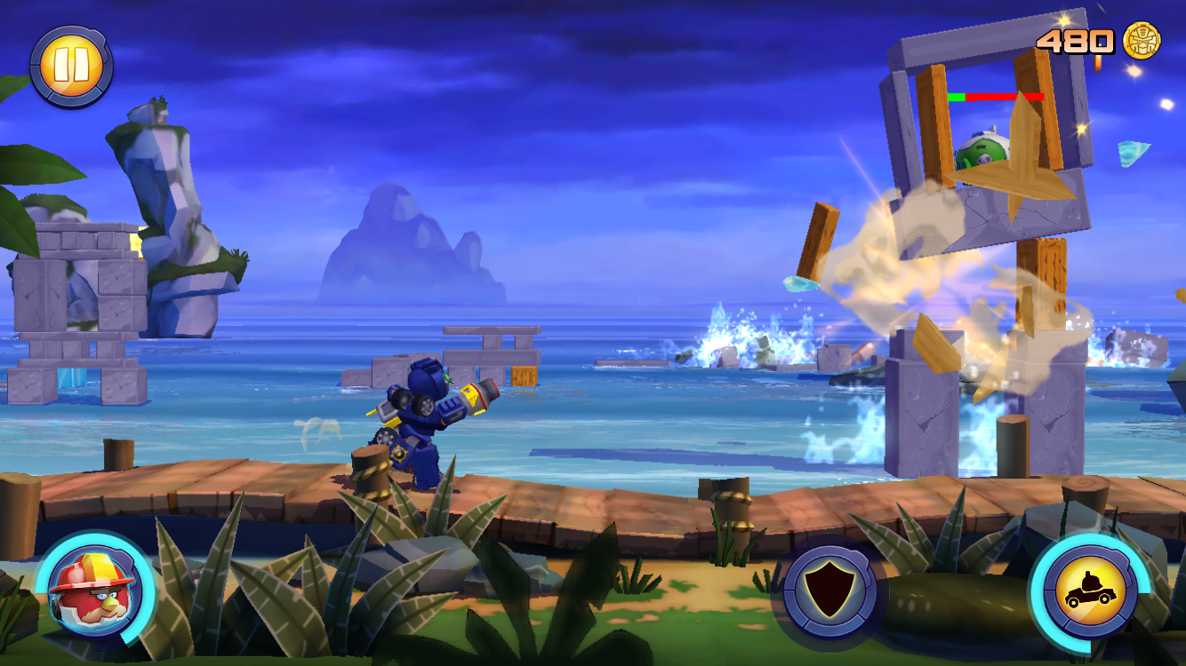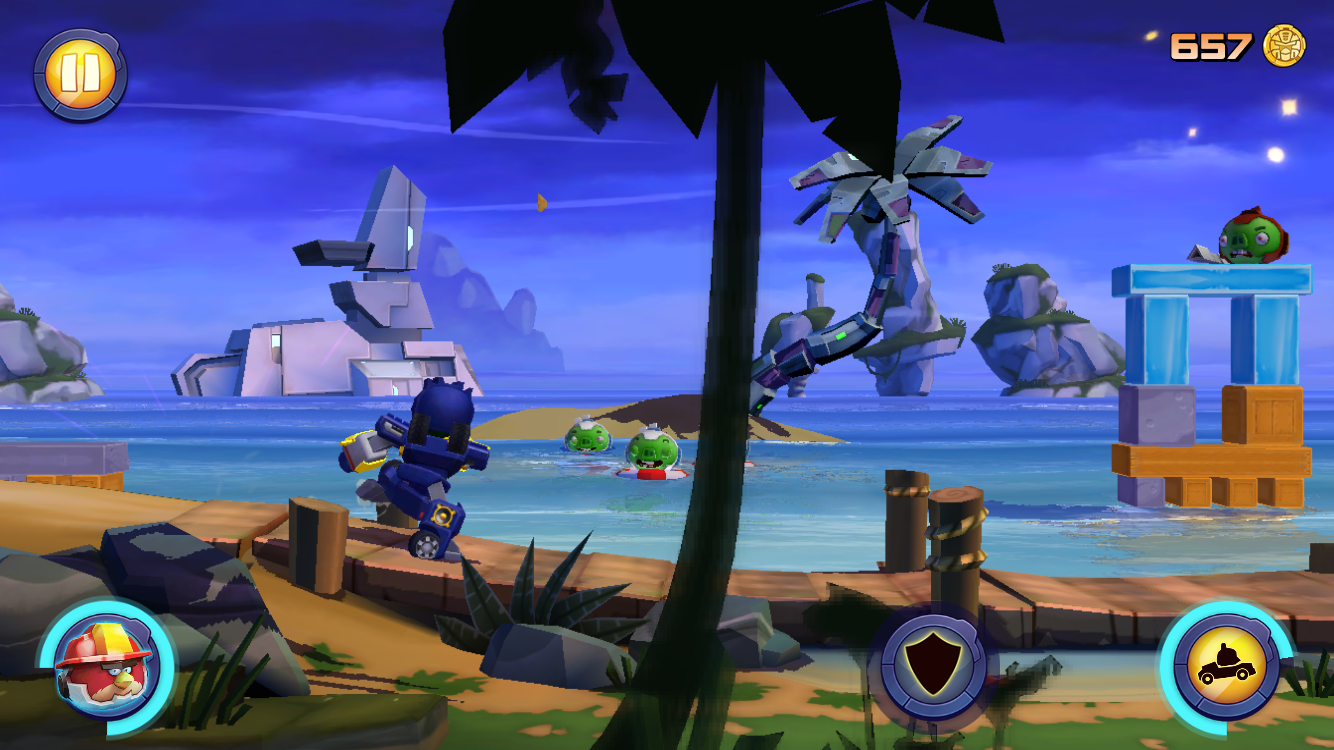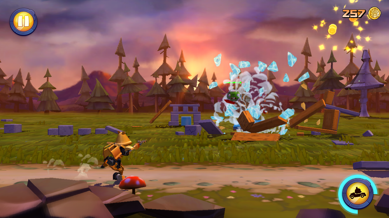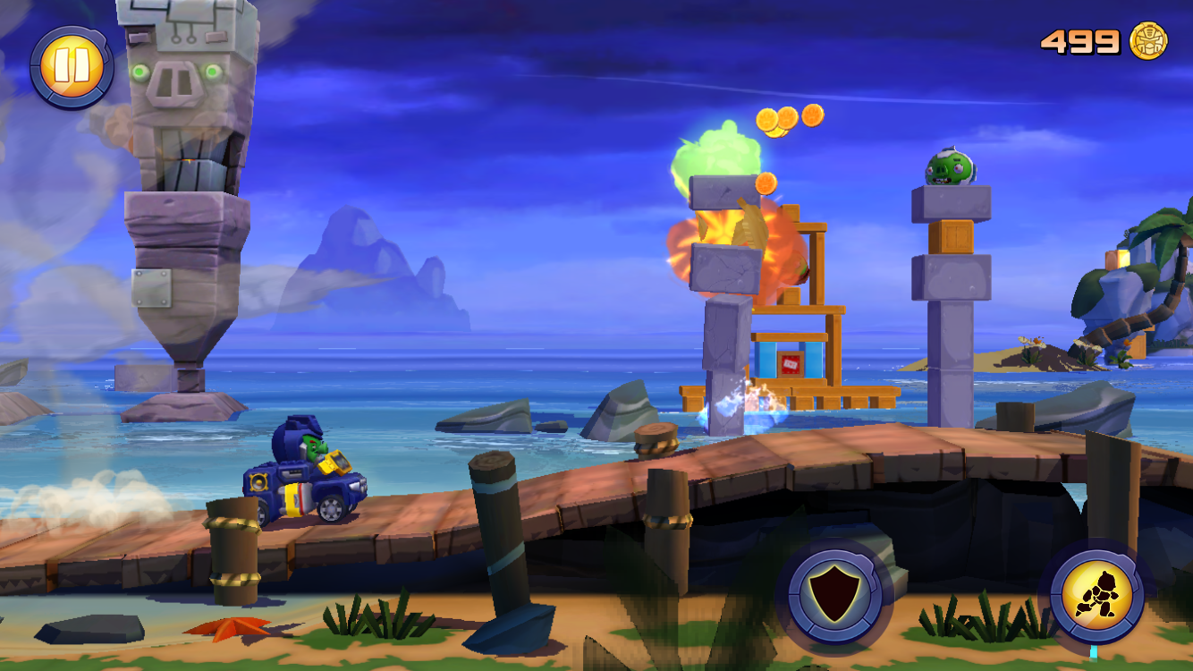There are 3 currencies here: coins, pigs and crystals. The first buy upgrades for robots and unlock new map areas, while the pigs unlock new robots to play with and crystals speed up timers. Each of the robots has a special power and can receive more once they’re upgraded. Aside from running you will also be shooting towards blocks of ice, rocks and wood, in order to take down pigs from the background or the foreground.