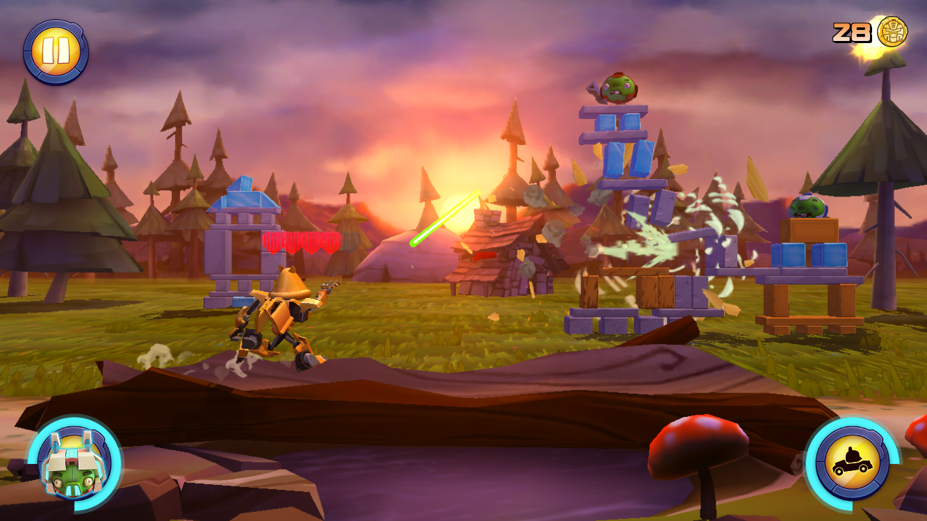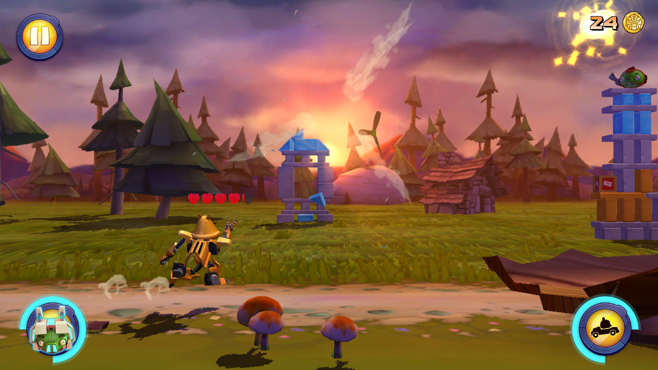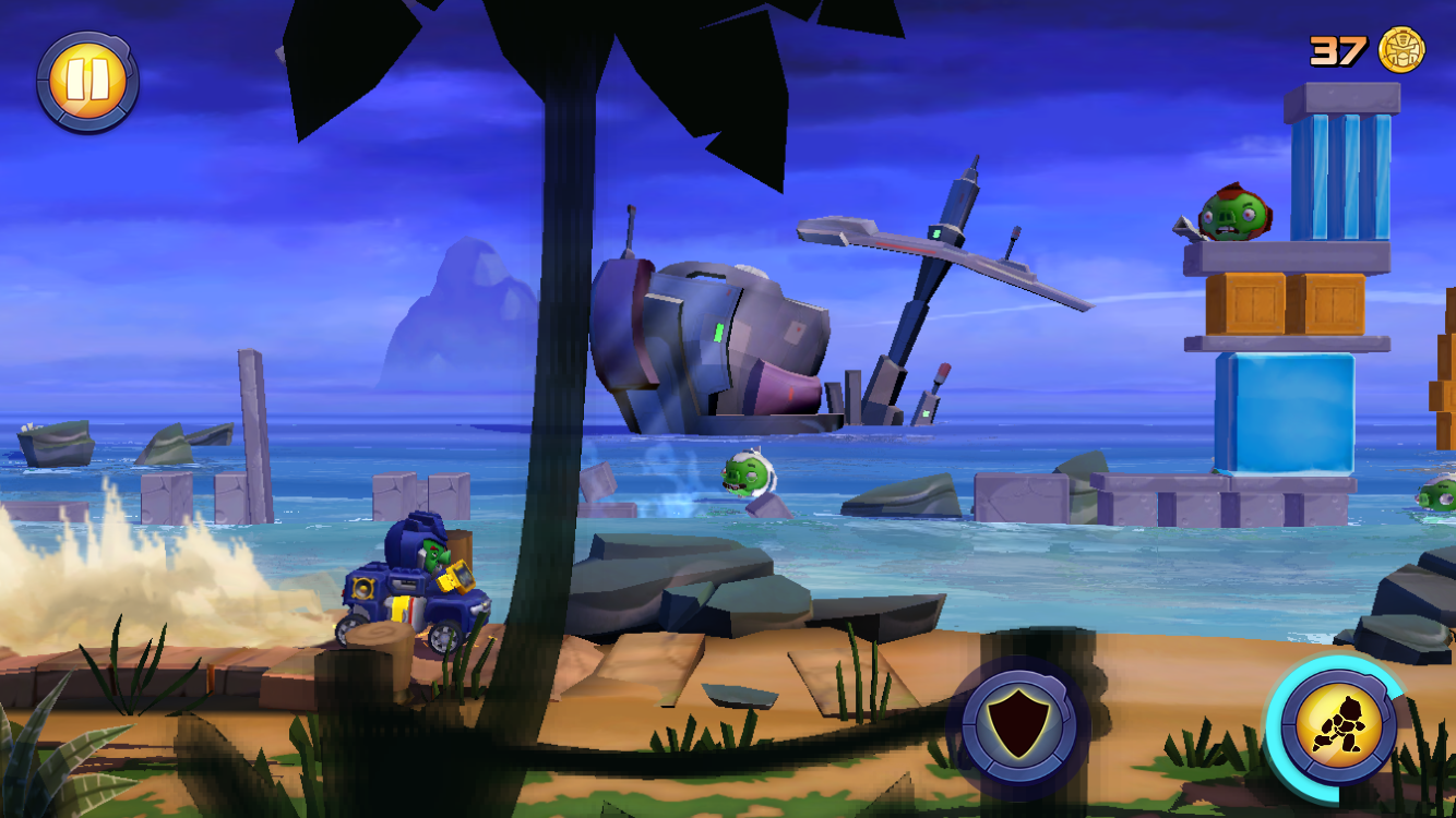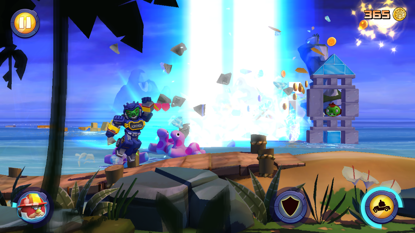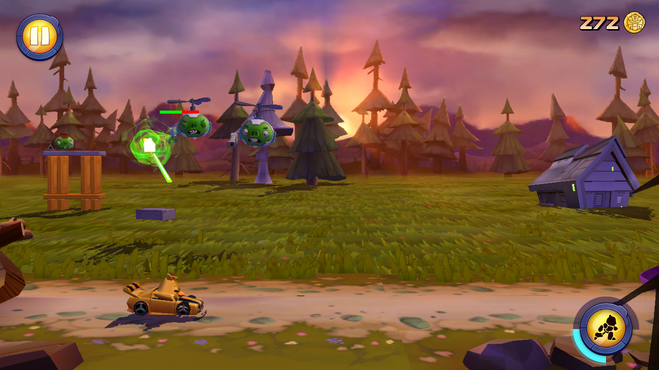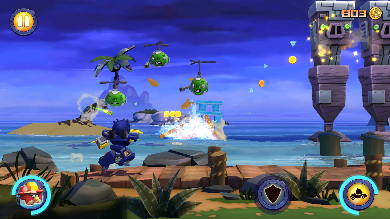 There are 3 currencies here: coins, pigs and crystals. The first buy upgrades for robots and unlock new map areas, while the pigs unlock new robots to play with and crystals speed up timers. Each of the robots has a special power and can receive more once they’re upgraded. Aside from running you will also be shooting towards blocks of ice, rocks and wood, in order to take down pigs from the background or the foreground.