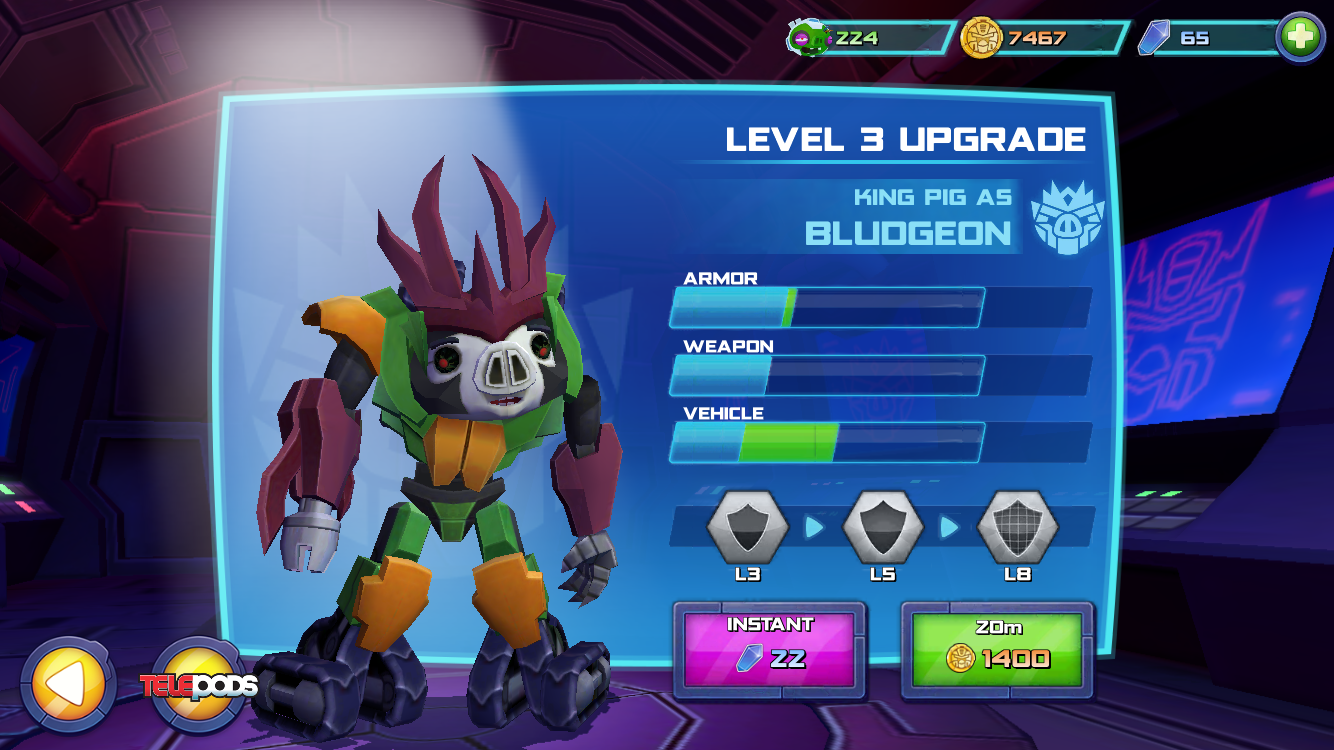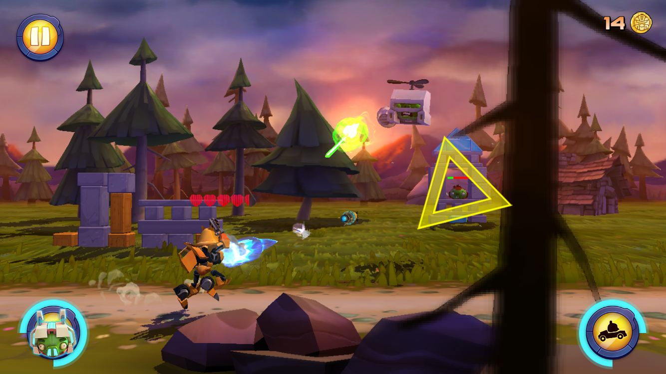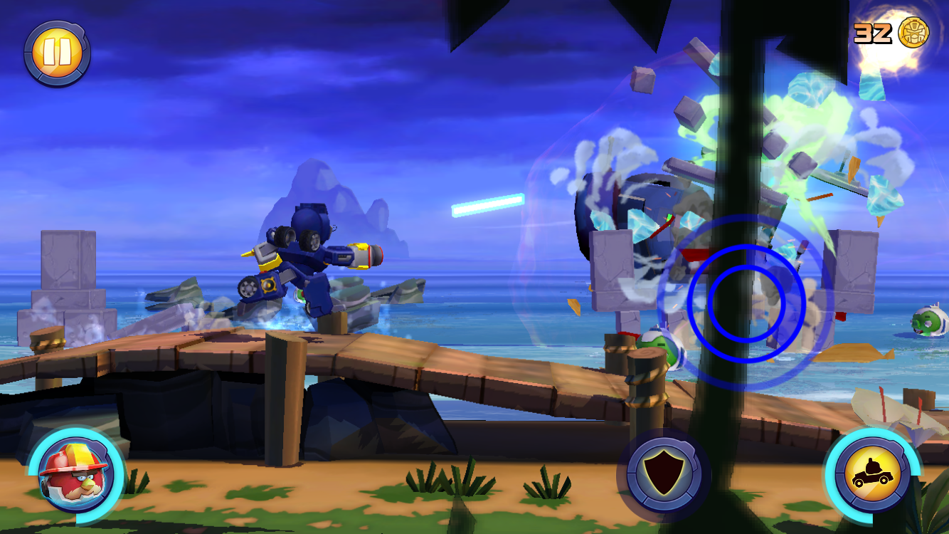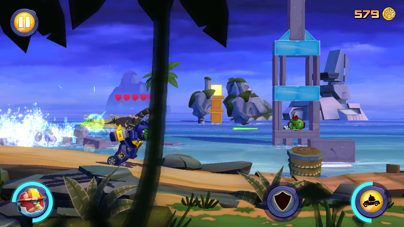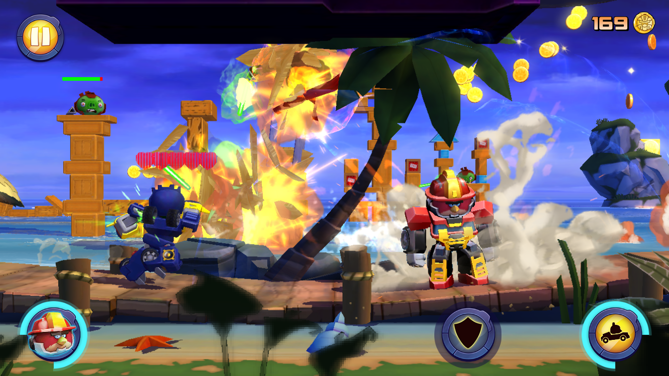 There are 3 currencies here: coins, pigs and crystals. The first buy upgrades for robots and unlock new map areas, while the pigs unlock new robots to play with and crystals speed up timers. Each of the robots has a special power and can receive more once they’re upgraded. Aside from running you will also be shooting towards blocks of ice, rocks and wood, in order to take down pigs from the background or the foreground.