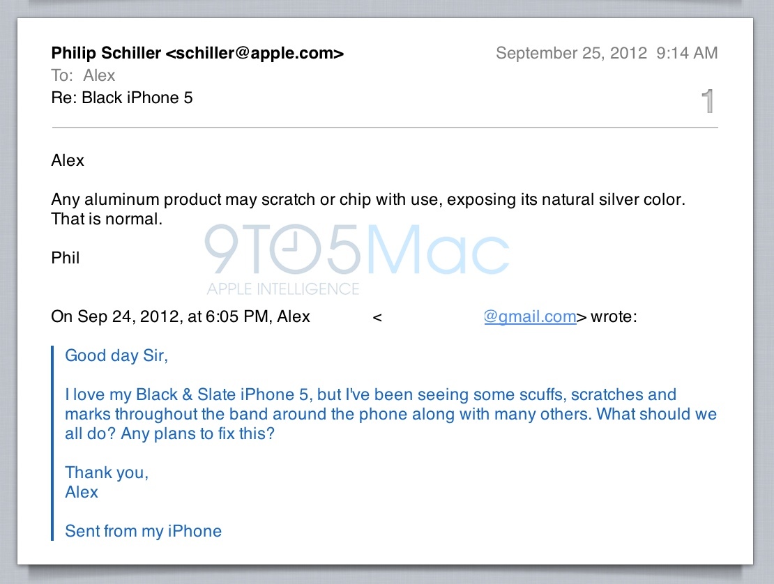 We’ve written about the Scuff Gate iPhone 5 scandal immediately when it appeared and now it turns out that even Apple officials are aware of the problem and even ready to comment on it. Supposedly Apple’s Phil Schiller took the time to respond to a worried iPhone 5 owner’s email and he even did that early in the morning according to the screenshot above.