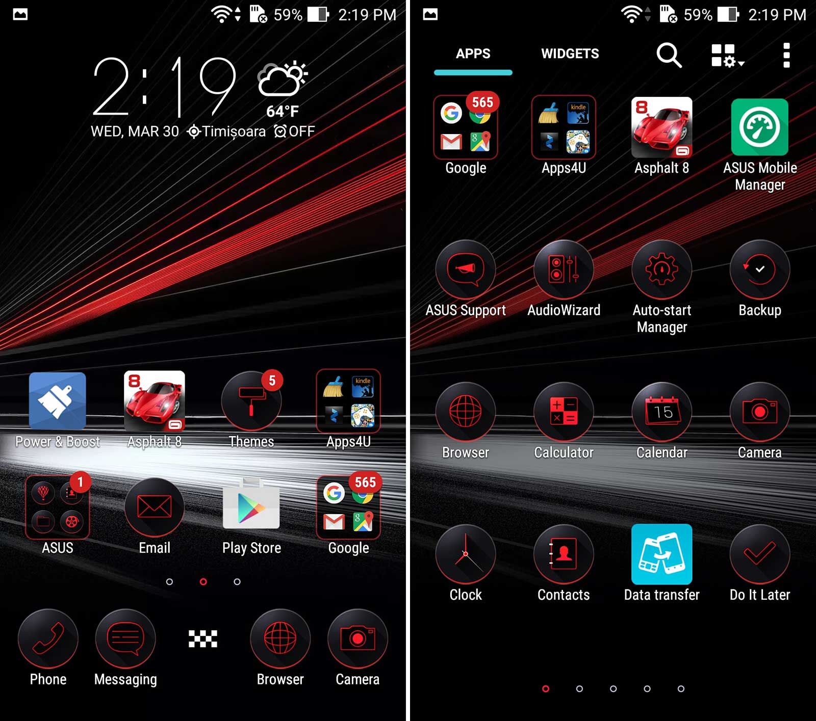 Charging requires 1 hour and 55 minutes, which is just OK. Settings for the battery include Power Save Modes like Performance, Normal, Power Saving, Super Saving and Custom. Some of them let you tweak the brightness, CPU usage and connectivity usage. The battery could have been a tad better for a gaming phone. ASUS ZenFone 2 Deluxe Special Edition runs Android 5.0 Lollipop with custom icons, that offer a red plus black combo.