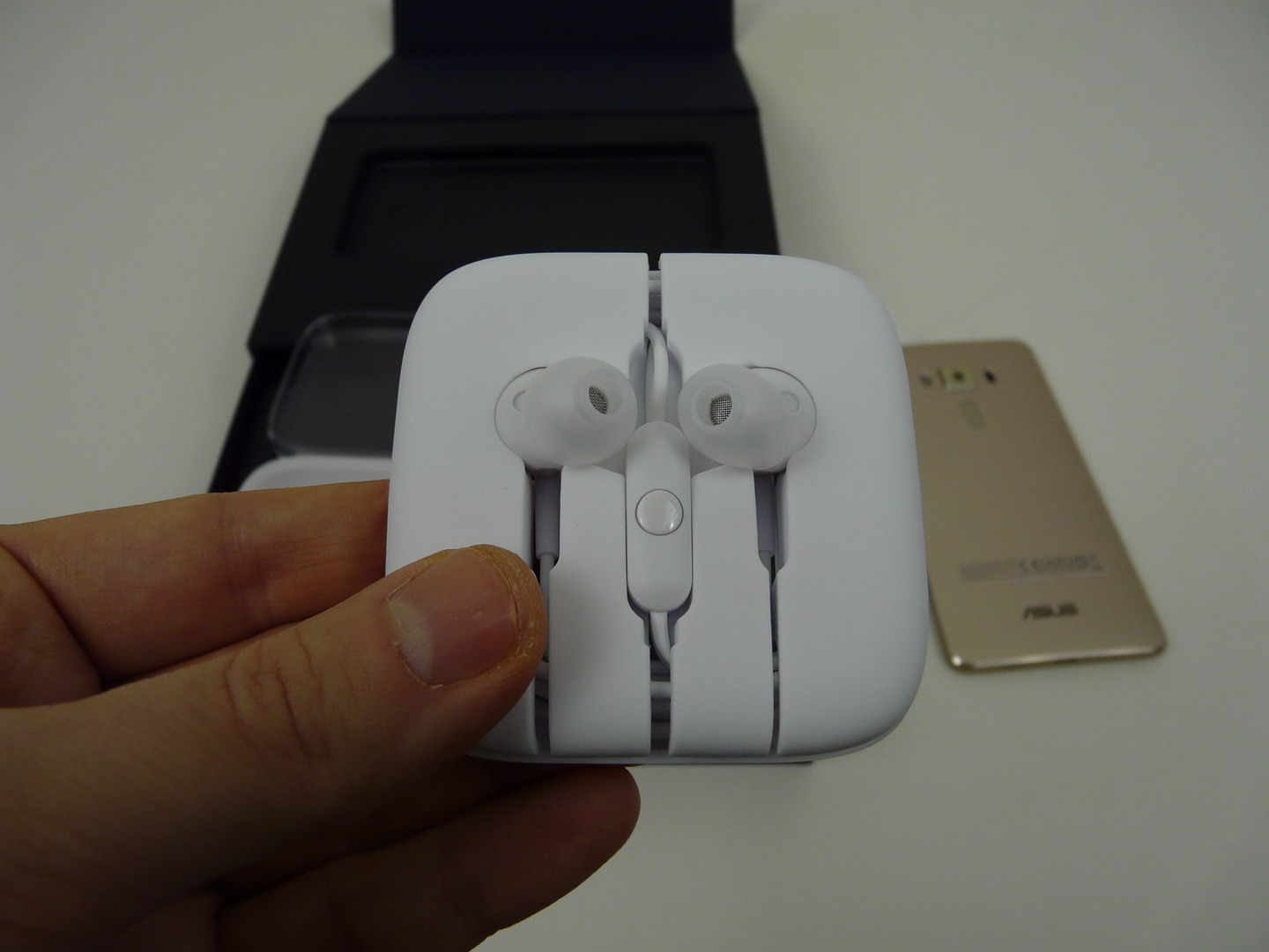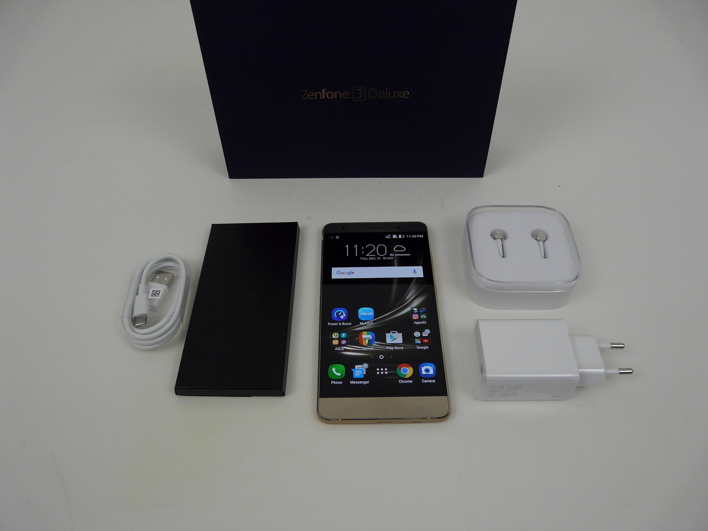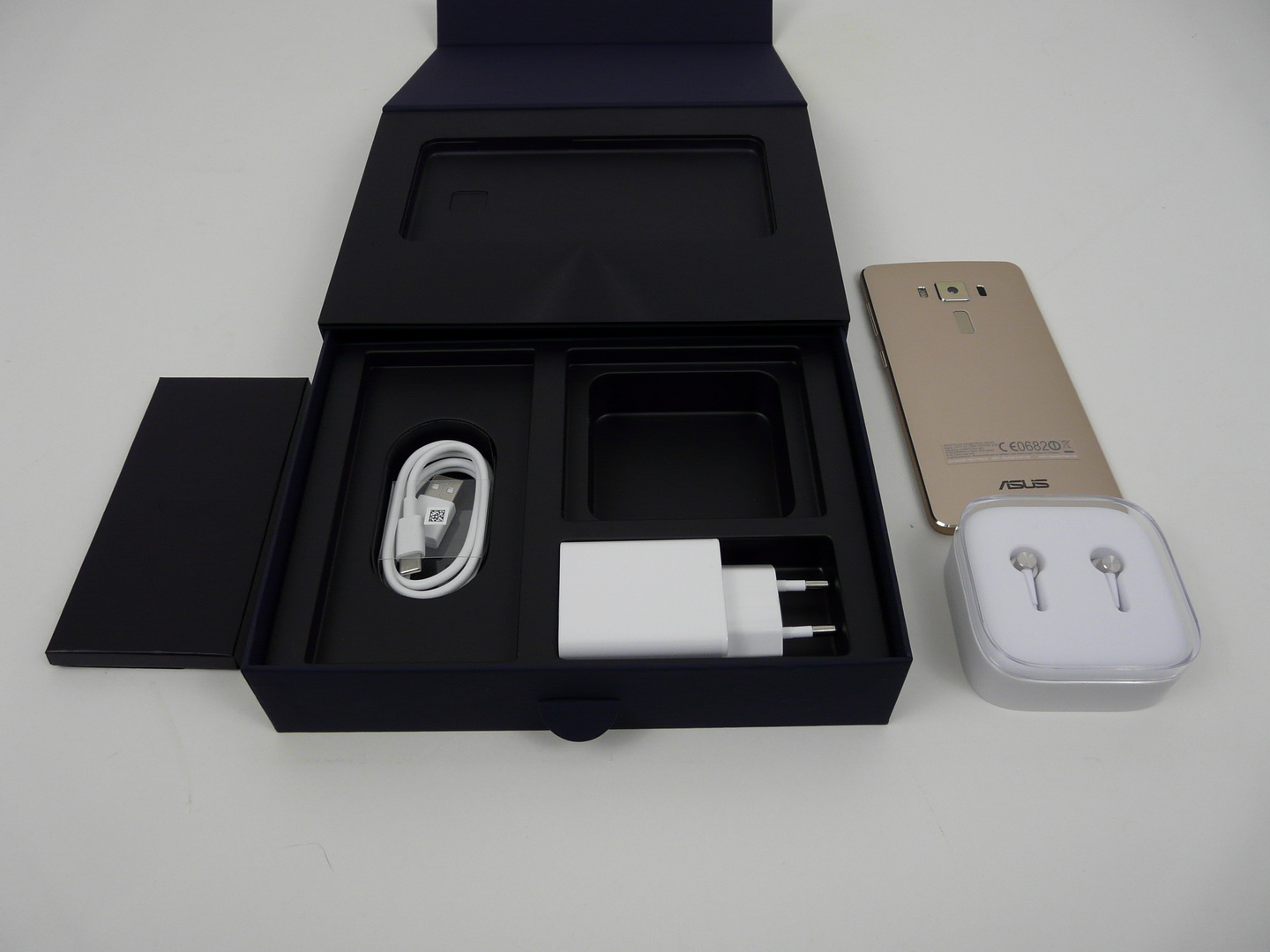 We’re testing the ZS570KL version of the phone, the 5.7 inch one, but there’s also a 5.5 inch model, in case you’re wondering. Anyway, the smartphone comes in an elegant box, feeling like a small jewelry box or a music box. Inside it there’s a charger (9V/2A/18W), USB Type C cable, manual, metal key and ZenEar S headphones, with a very elegant little case and a metal body, very nicely shaped.