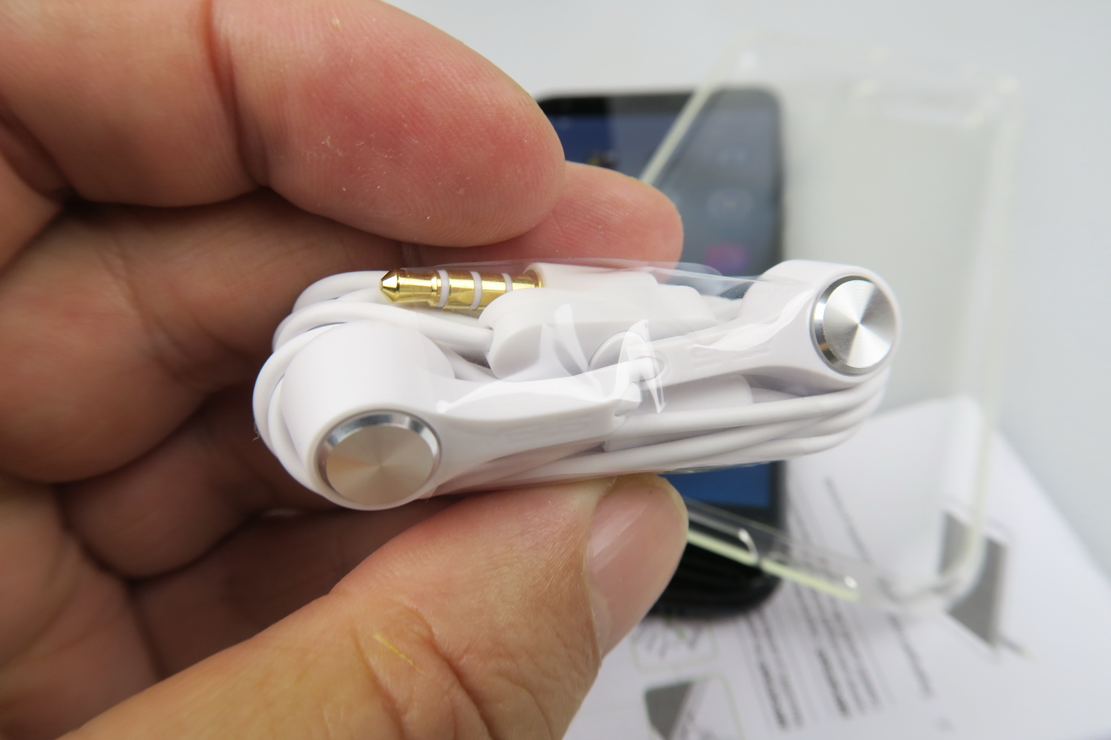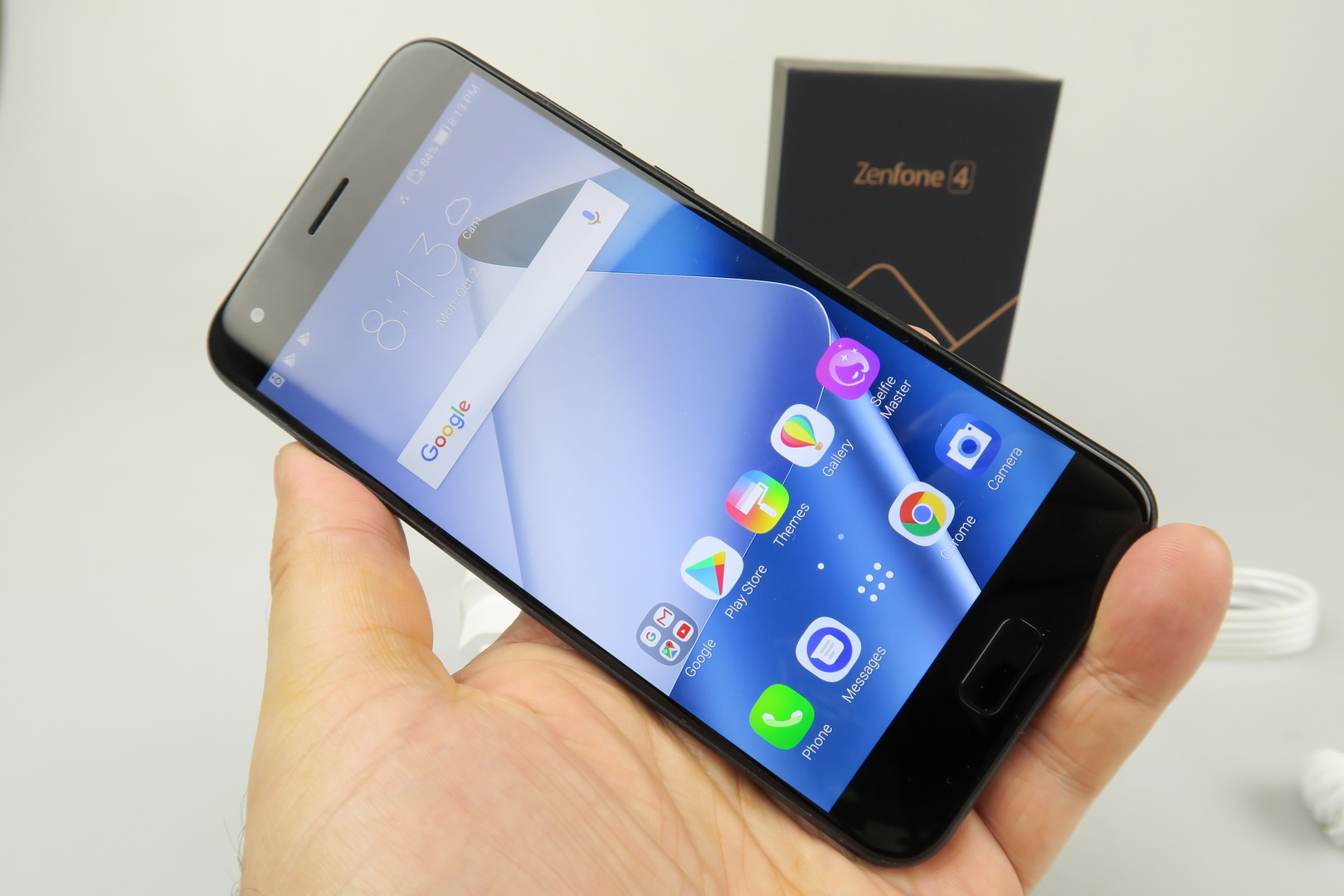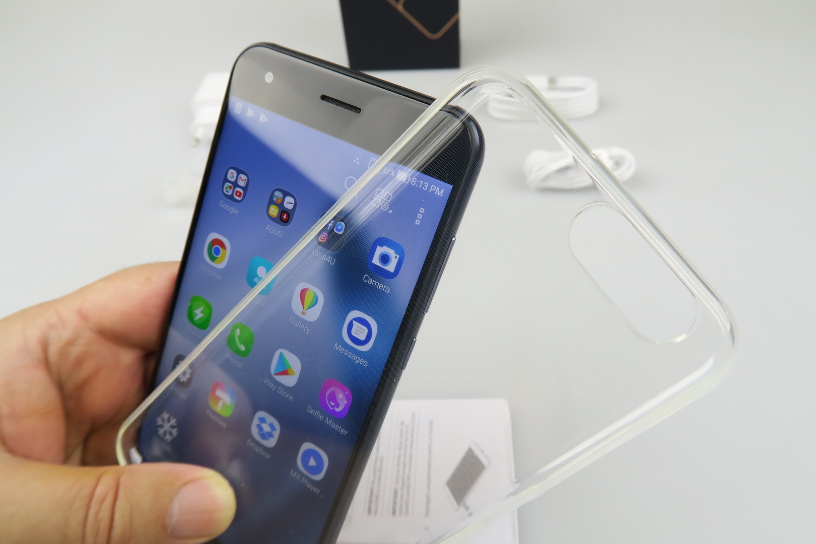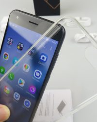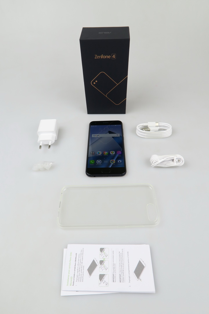 It’s an evolution from the successful ZenFone 3 and it moves on towards a dual camera. Inside its box we find a transparent and flexible case, a manual, a small metal key used to access the slots and headphones. They have an inclined design, much like the ZenFone 3 headphones did. There are also headphone plugs here, an USB Type-C cable and a charger that juices up the phone to 50% battery in 36 minutes.
