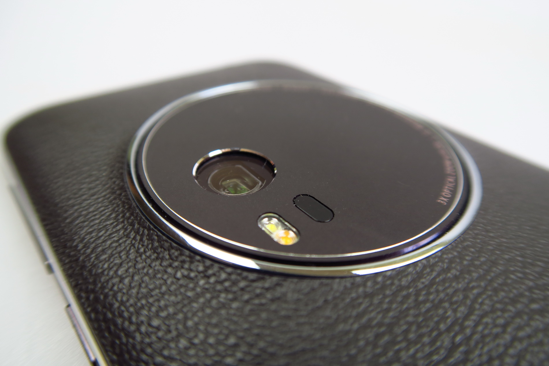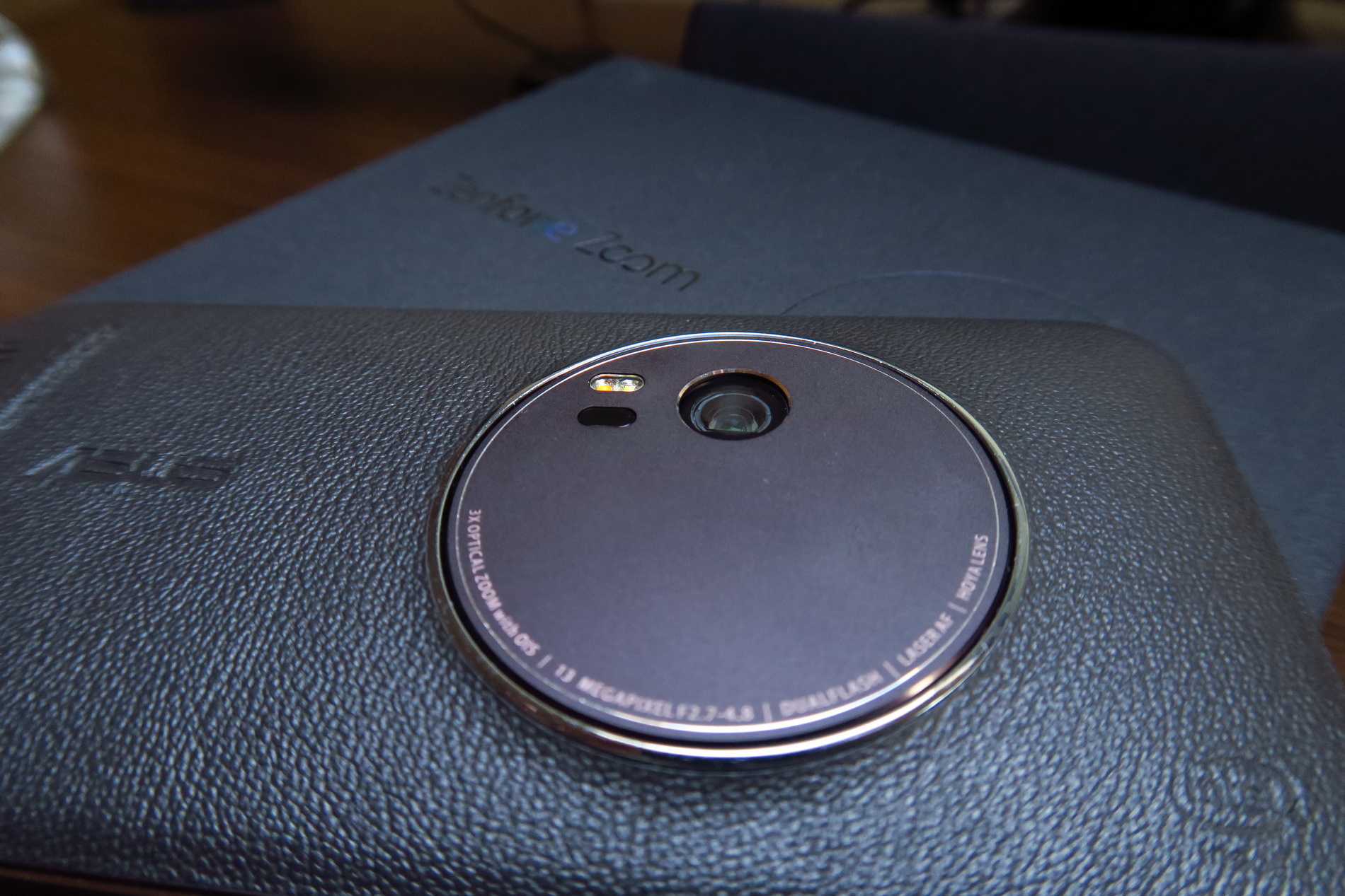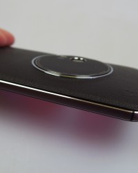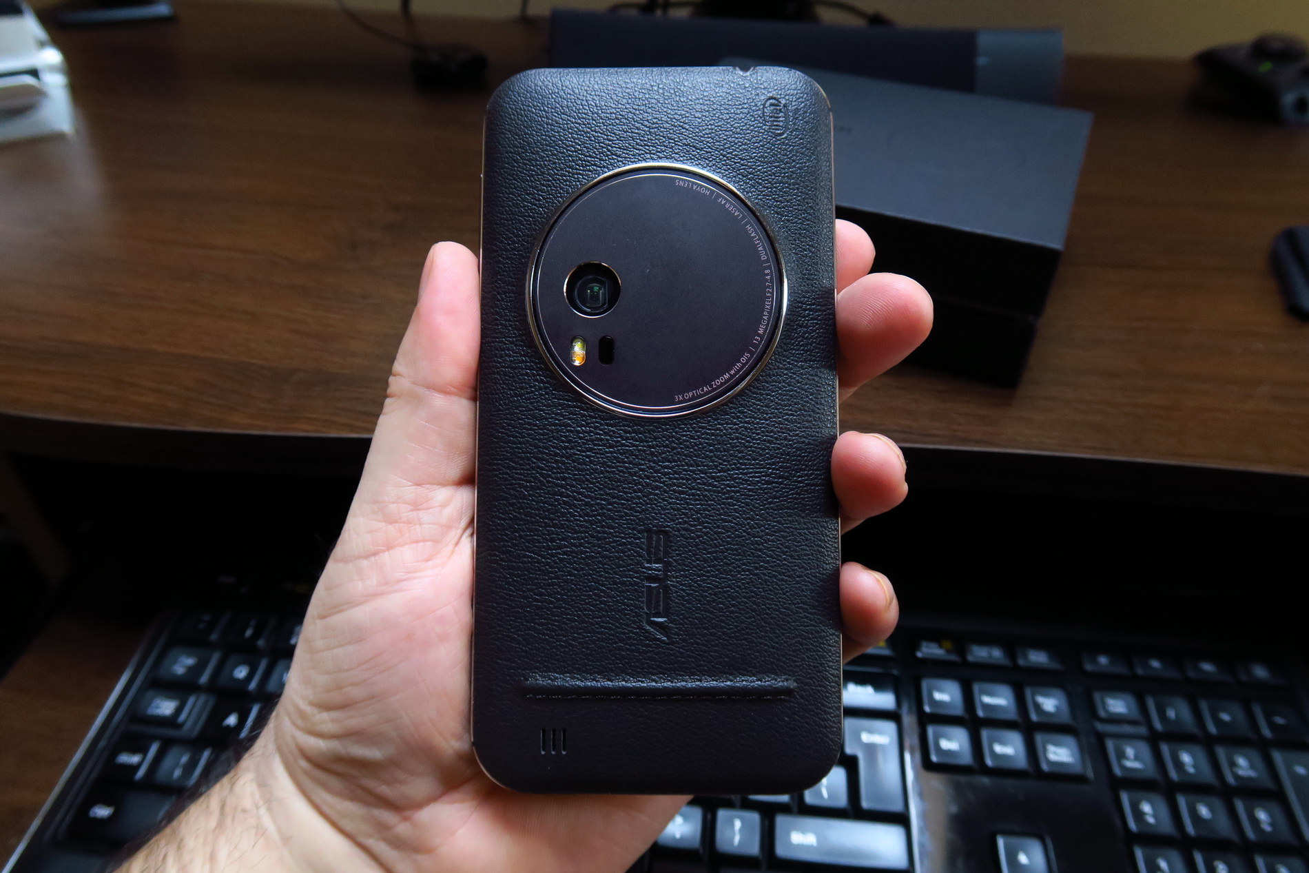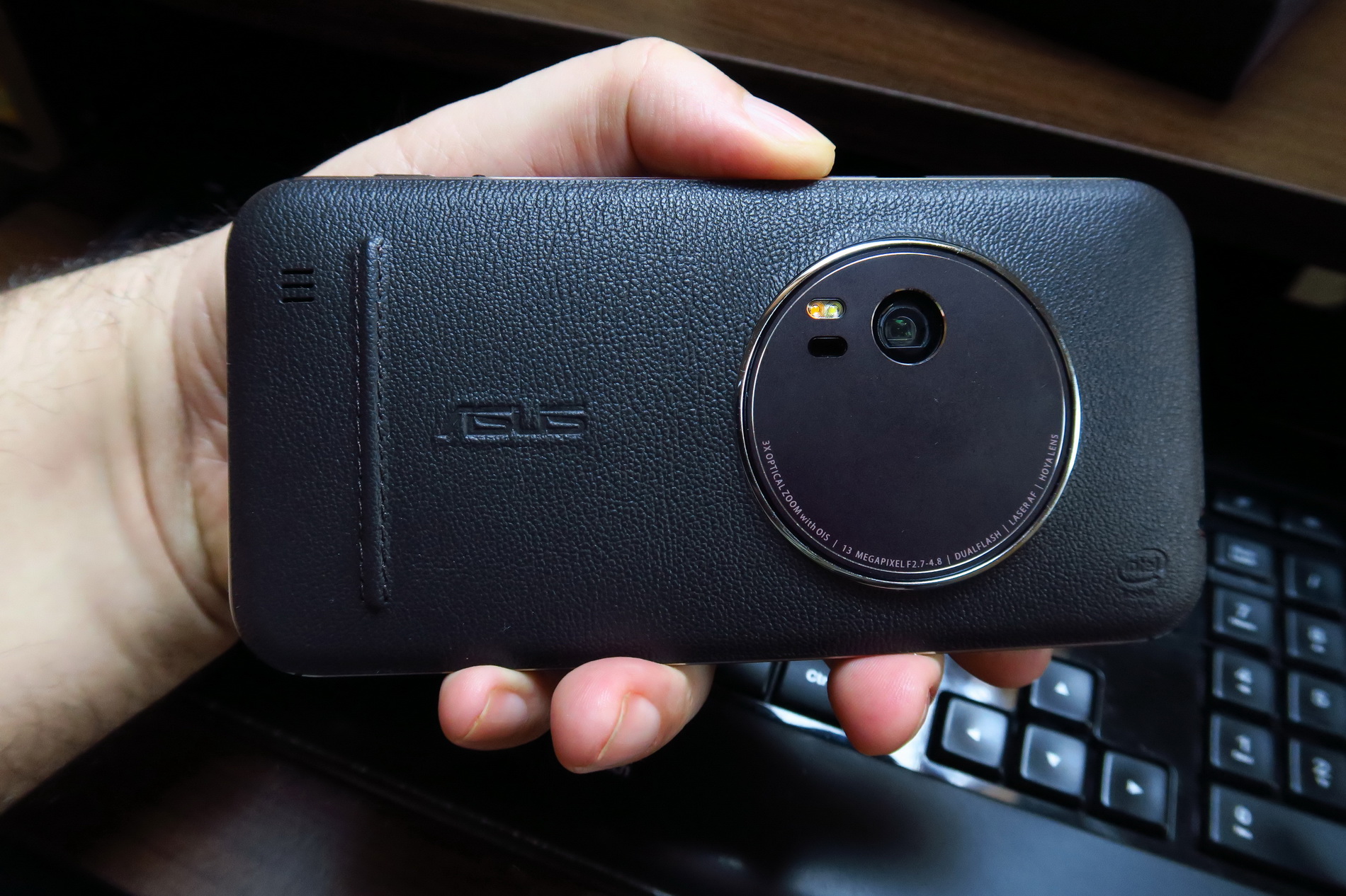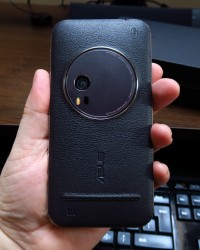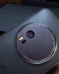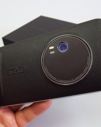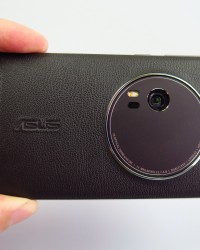 The facade is typical for a ZenFone model and we’re getting a 5.5 inch diagonal here and a big camera module. The back is covered with leather, that feels a big cheap, like grandpa’s wallet sort of. This model measures between 5 mm and 11.95 mm in thickness (thinnest to thickest) and it’s thicker than another older cameraphone, the Lumia 1020, that measured 10.4 mm in thickness.