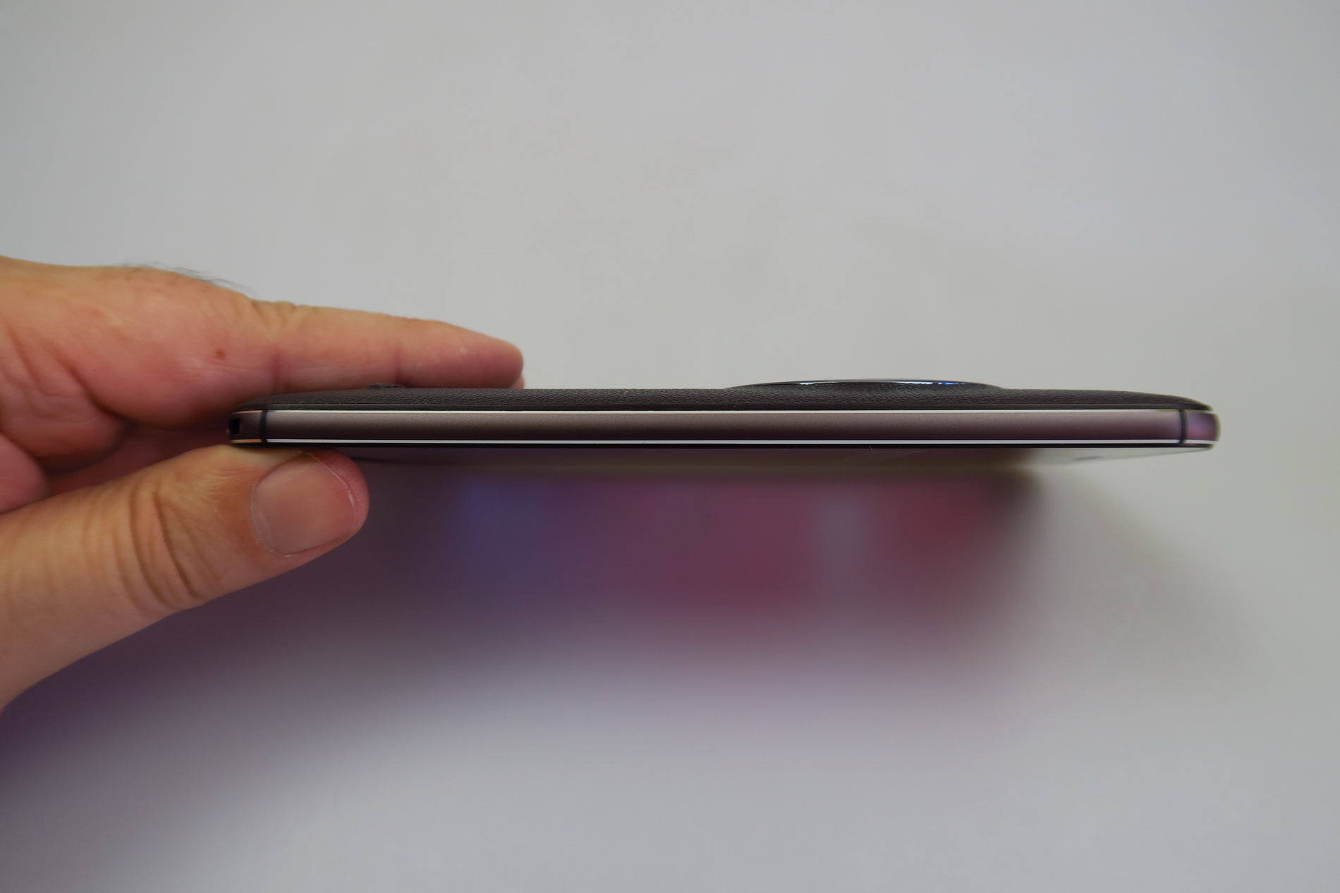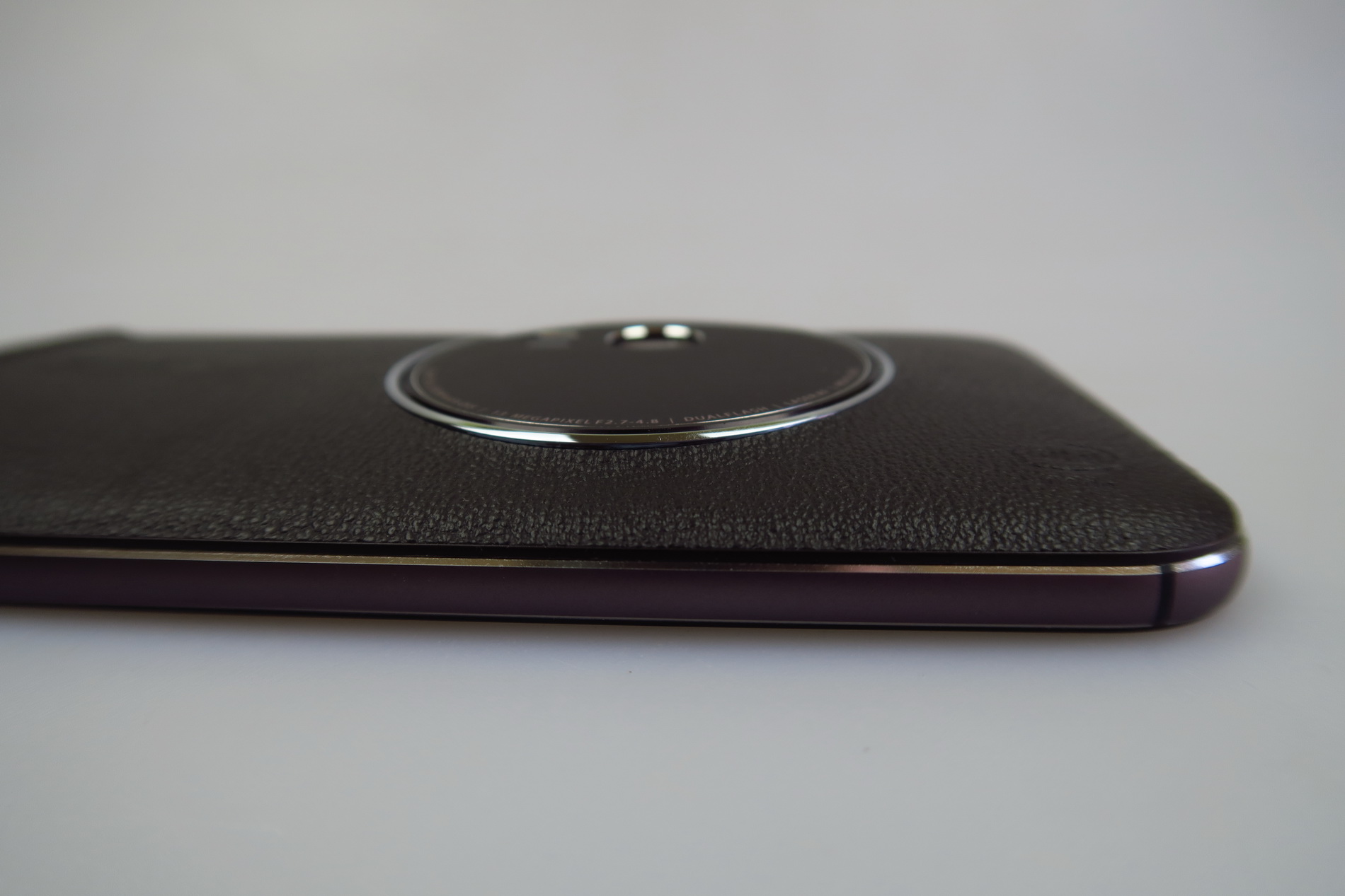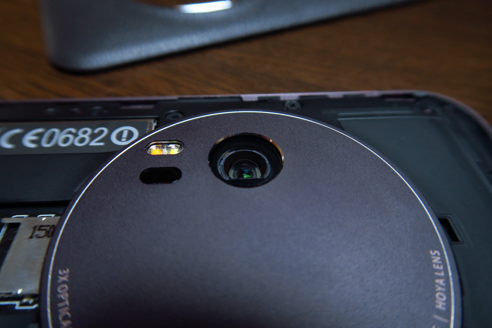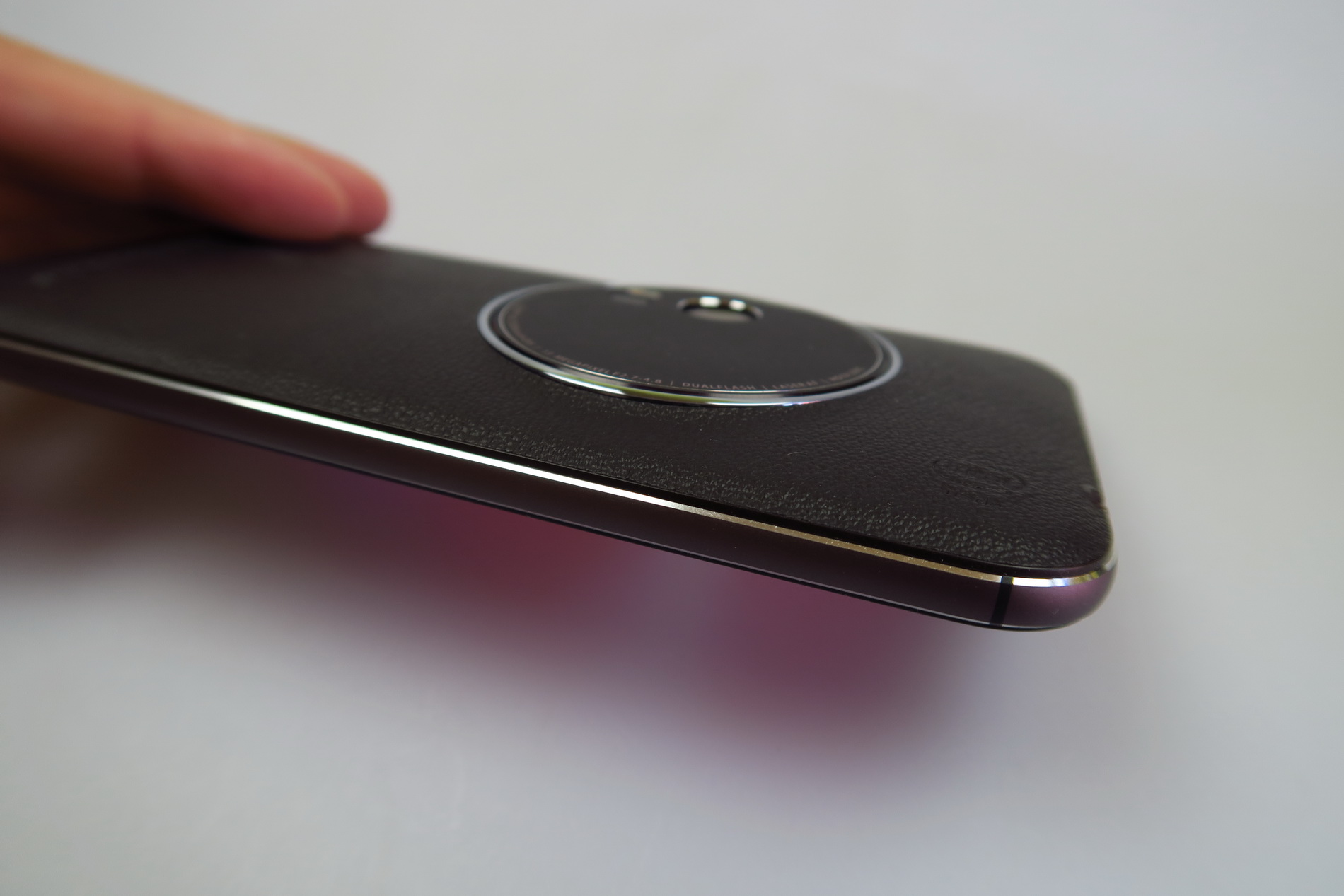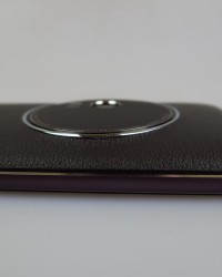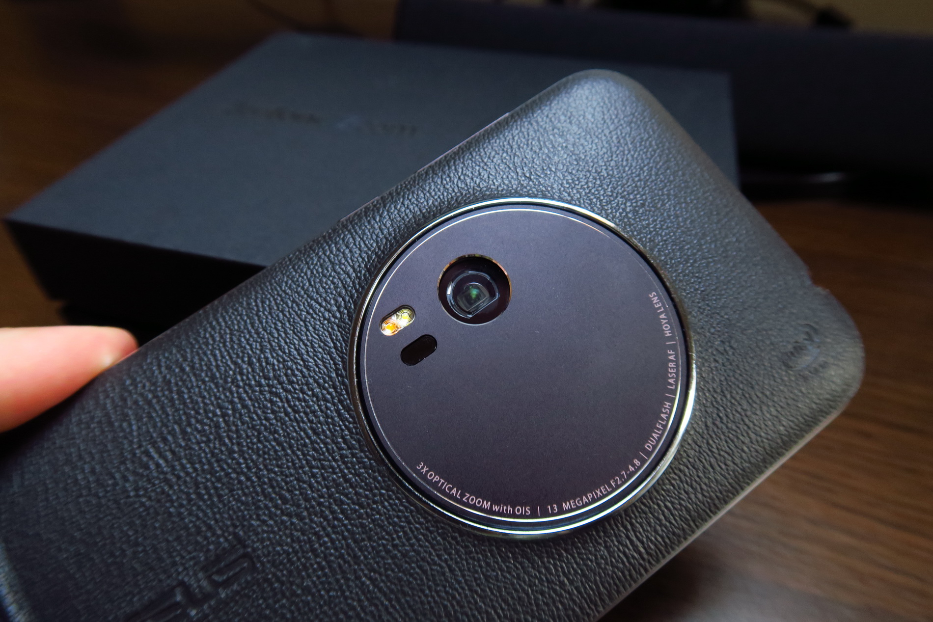 The facade is typical for a ZenFone model and we’re getting a 5.5 inch diagonal here and a big camera module. The back is covered with leather, that feels a big cheap, like grandpa’s wallet sort of. This model measures between 5 mm and 11.95 mm in thickness (thinnest to thickest) and it’s thicker than another older cameraphone, the Lumia 1020, that measured 10.4 mm in thickness.