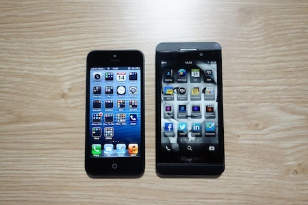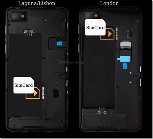 You can see how the battery, SIM card and microSD card positions are switched and also the pins of the battery are on opposite sides on the handsets in the pic above. And then there’s a comparison with the iPhone 5, that reminds me of a Motorola Droid RAZR compared to the Apple handset, for some reason. I wonder what the level of brightness on the BB phone was, since the iPhone seems much brighter… Anyway, it’s nice to see international and US versions of the first BB 10 OS devices being prepared for debut, that will go down at the end of January 2013.