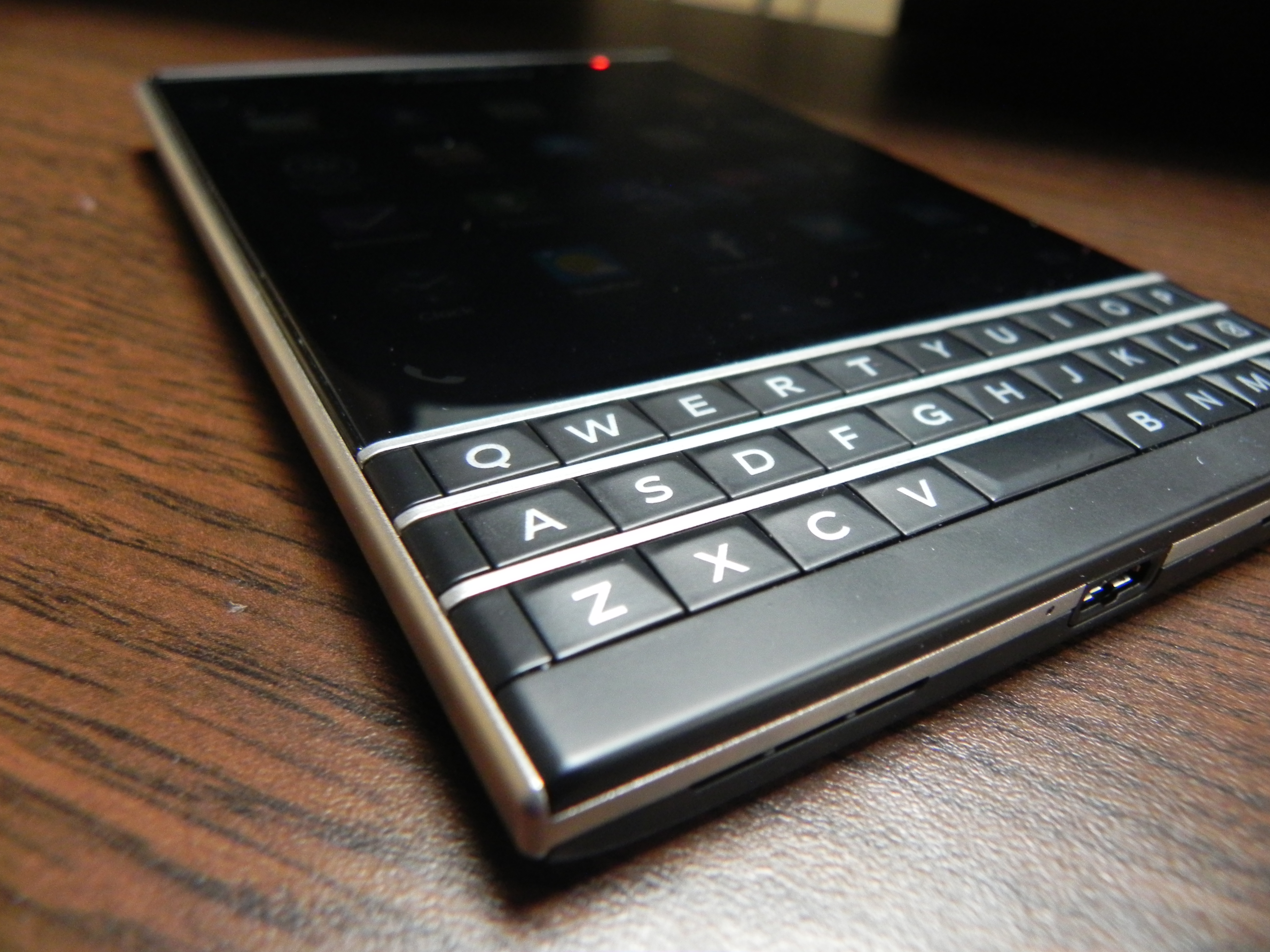 We’ve got a sturdy metal frame on board and the device is very solid. It has rounded edges, a polycarbonate back, that uses a soft touch texture and it’s also mate. The camera bump is 0.3 mm thick and the frame is made of stainless steel. The same material is used between the QWERTY keyboard rows. At the front we can find a camera, earpiece, display with Gorilla Glass 3 protection, a 3 row QWERTY keyboard, that’s lit and touch enabled, plus sensors at the top and an LED for notifications near the front camera.