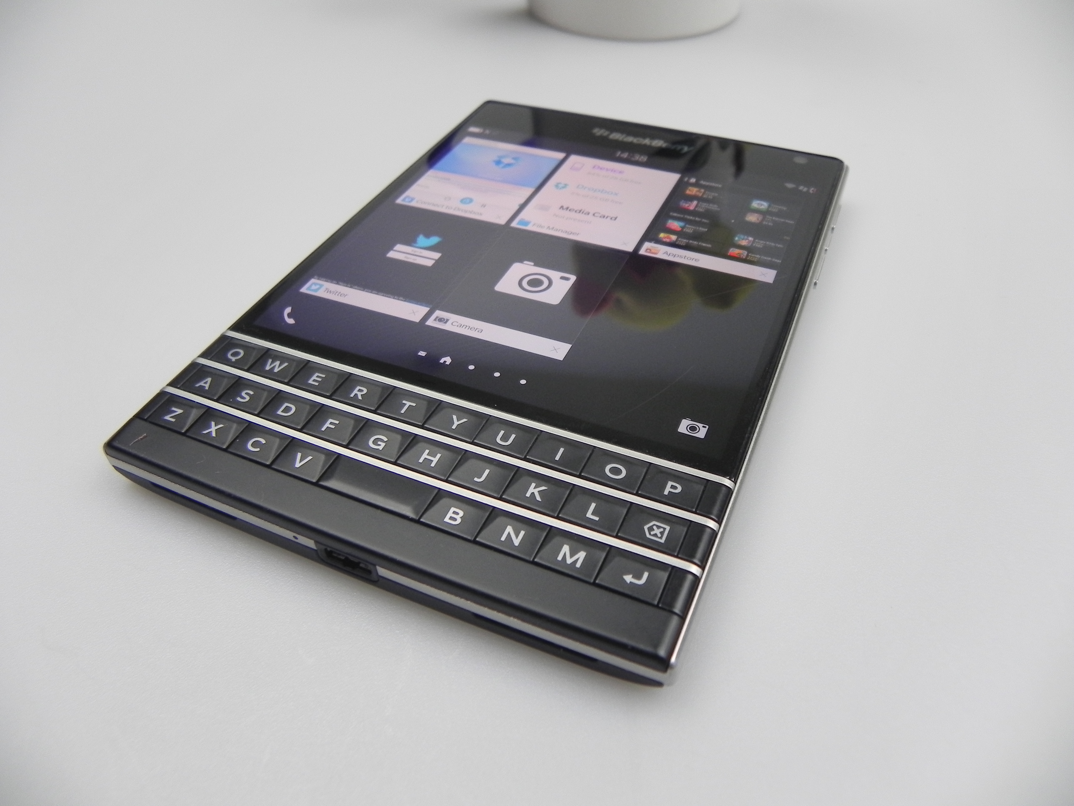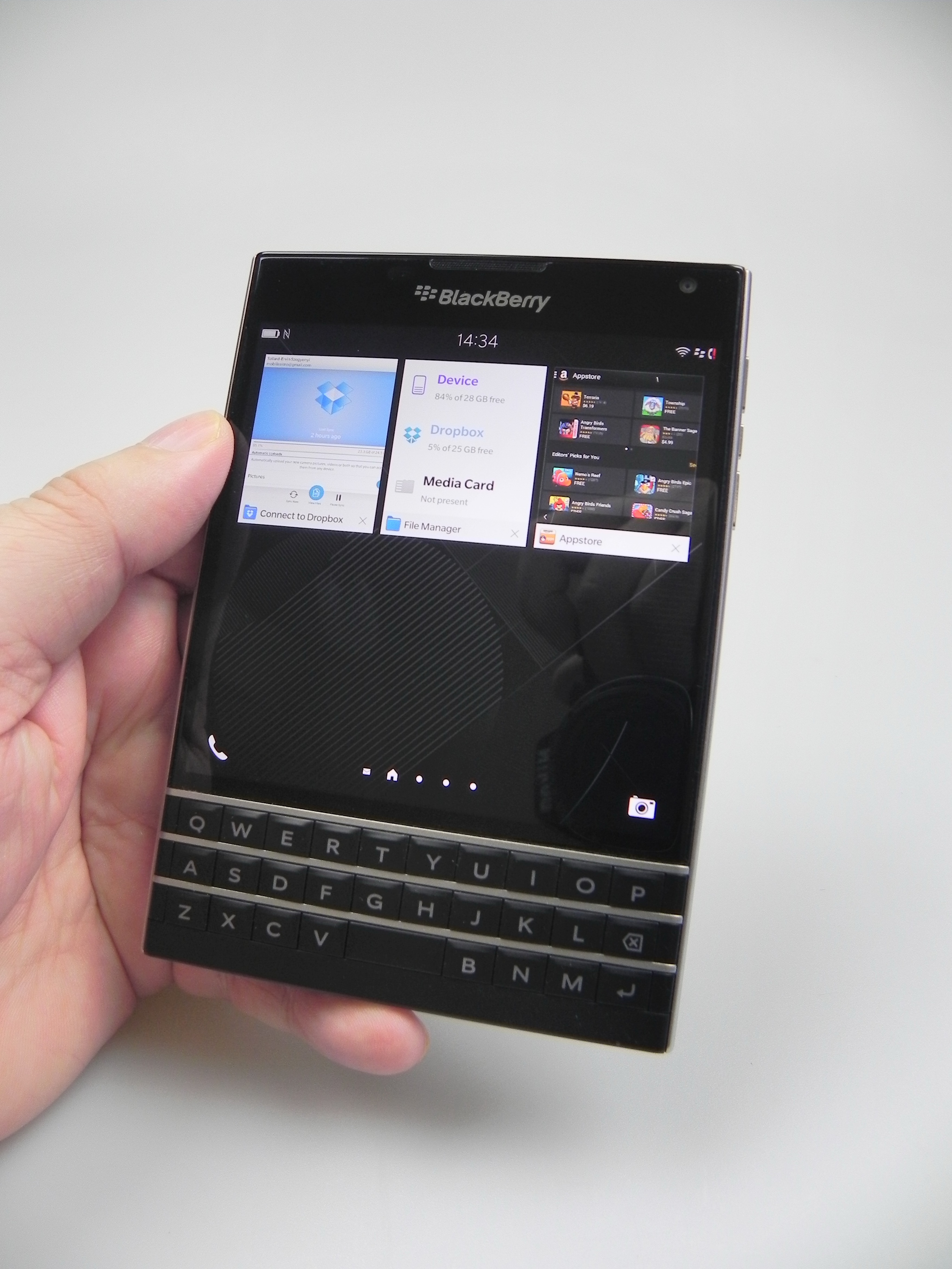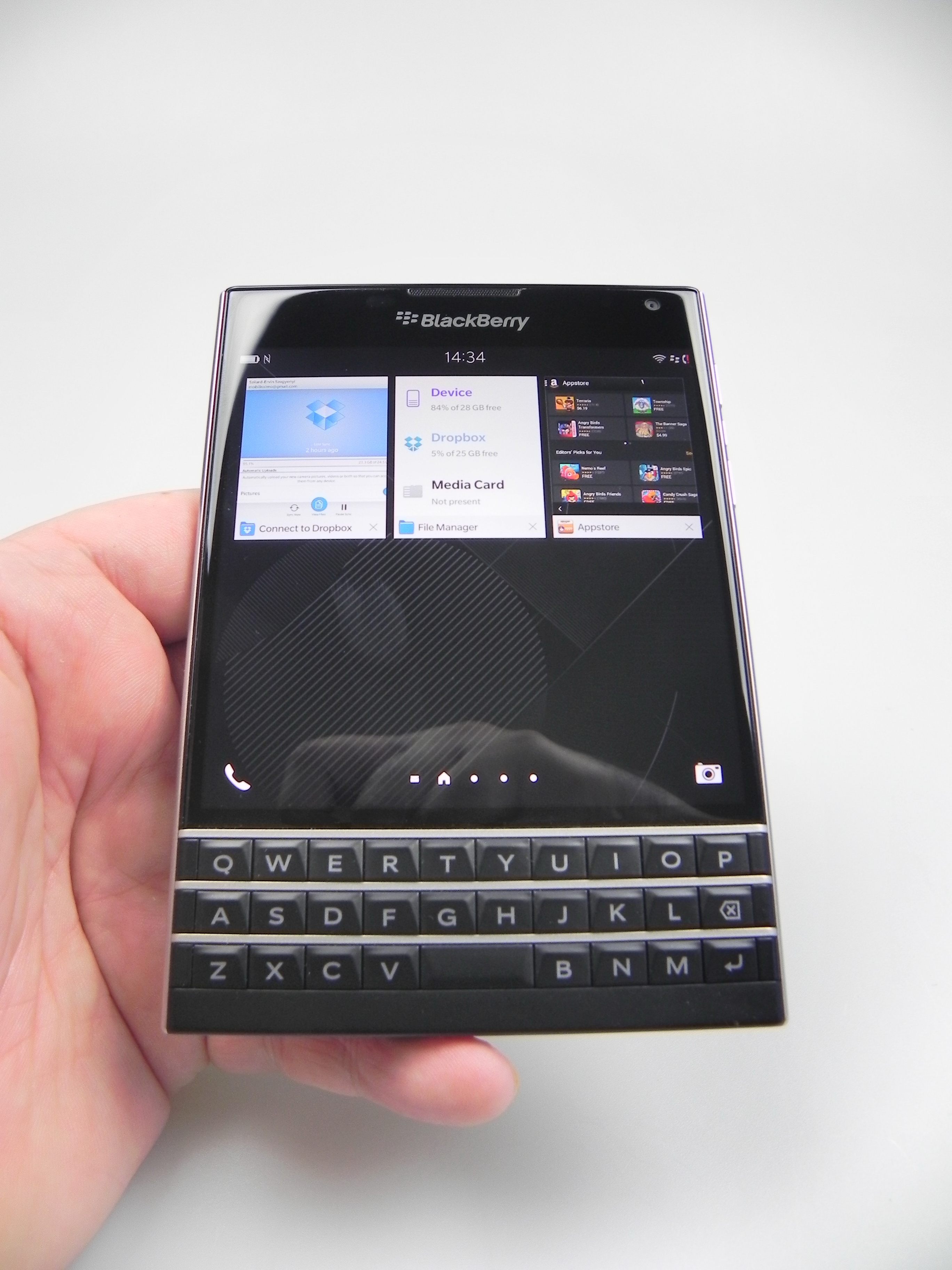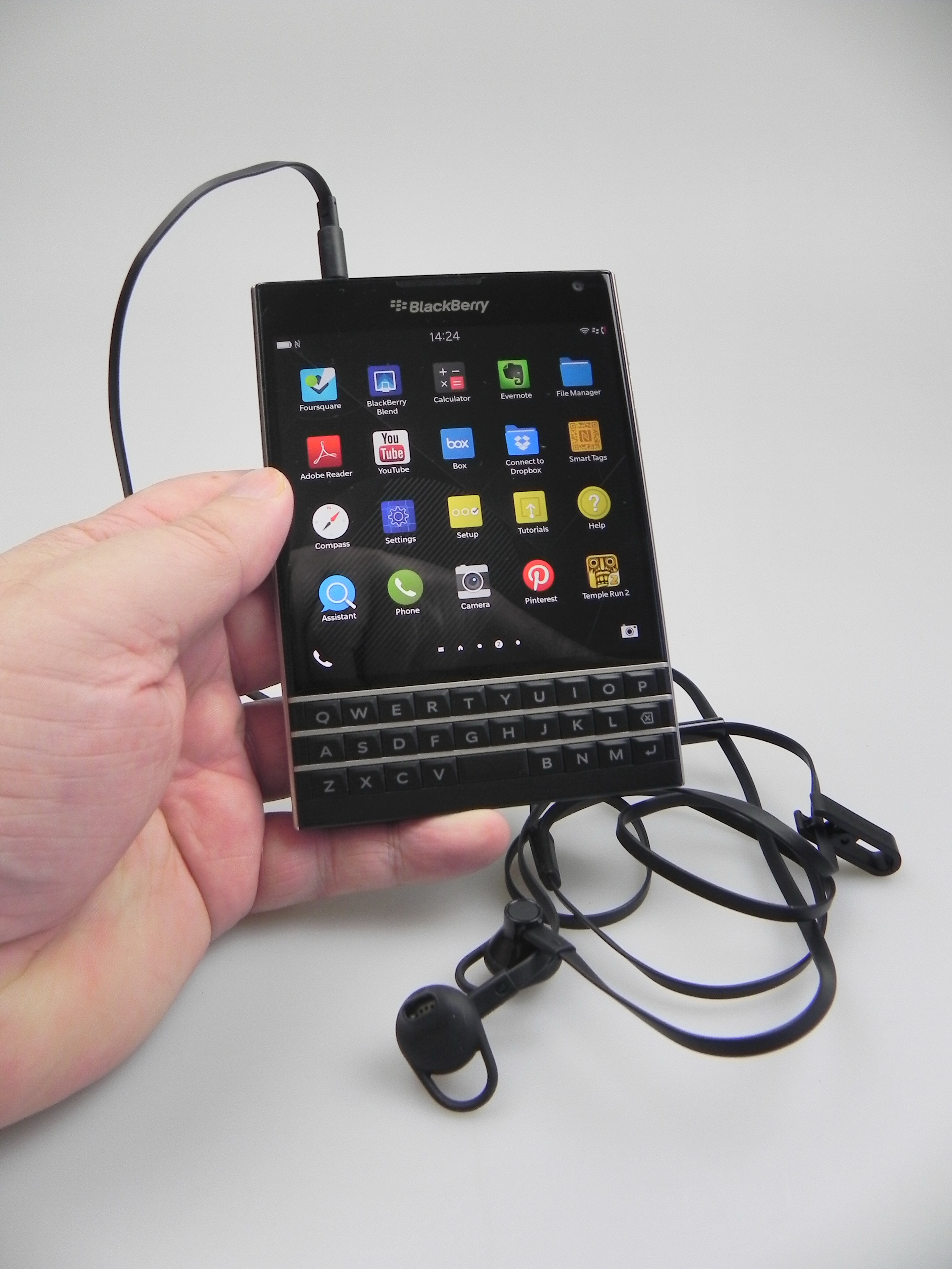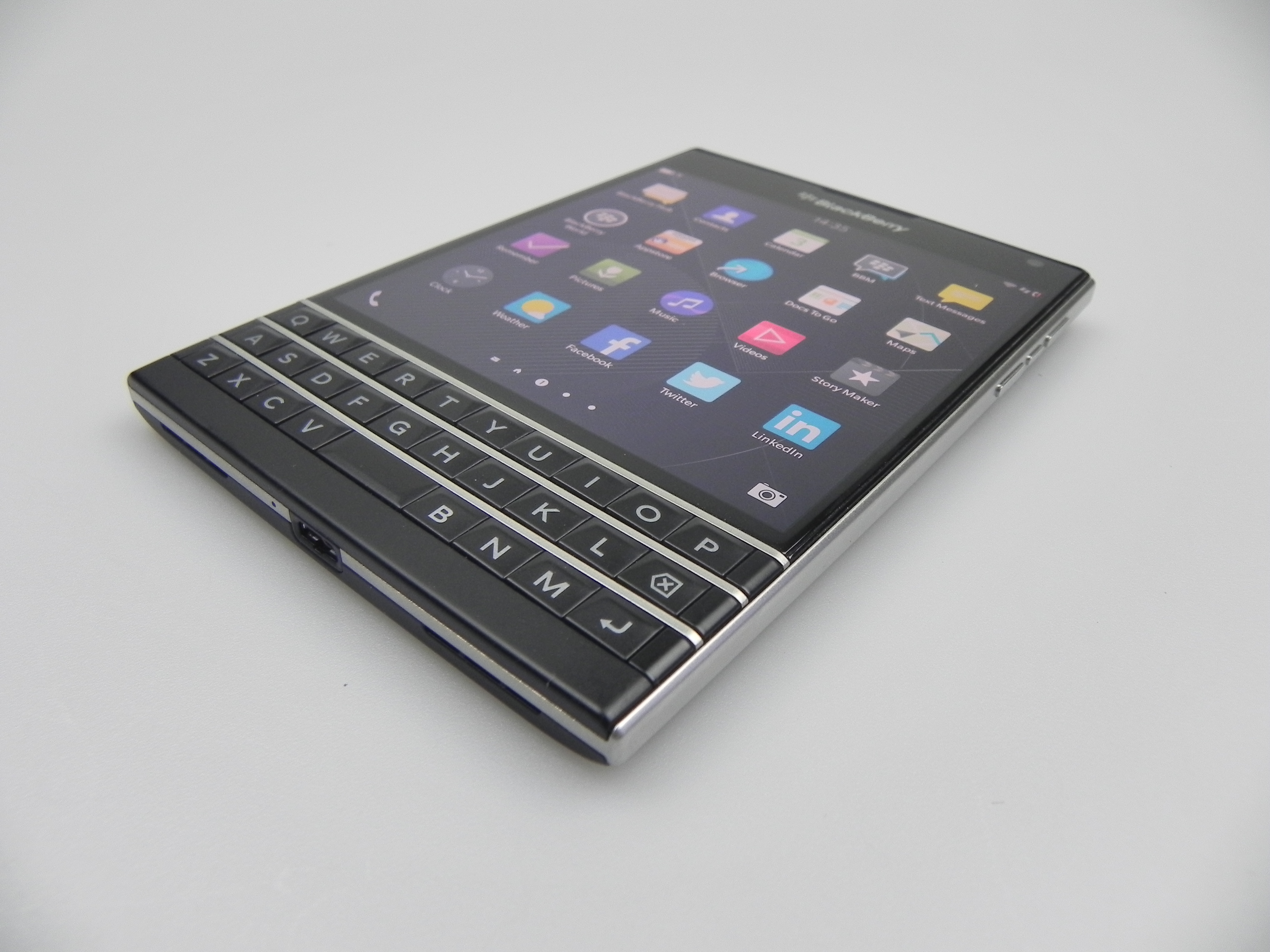Then there’s BlackBerry Hub, Contacts, Calendar, Docs to Go, Maps, Story Maker, Weather, Facebook, Twittter, Linkedin, Foursquare and BlackBerry Blend. The latter allows you to move files back and forth between your Passport and your PC, Android or iOS device, using a dedicated app. All you need to do is download the Blend app on iOS or Android and you’ll have access to your messages, pictures and content if you input your BlackBerry ID. Finally, the app list also includes Evernote, a File Manager, Adobe Reader, YouTube Box, Smart Tags and Compass.