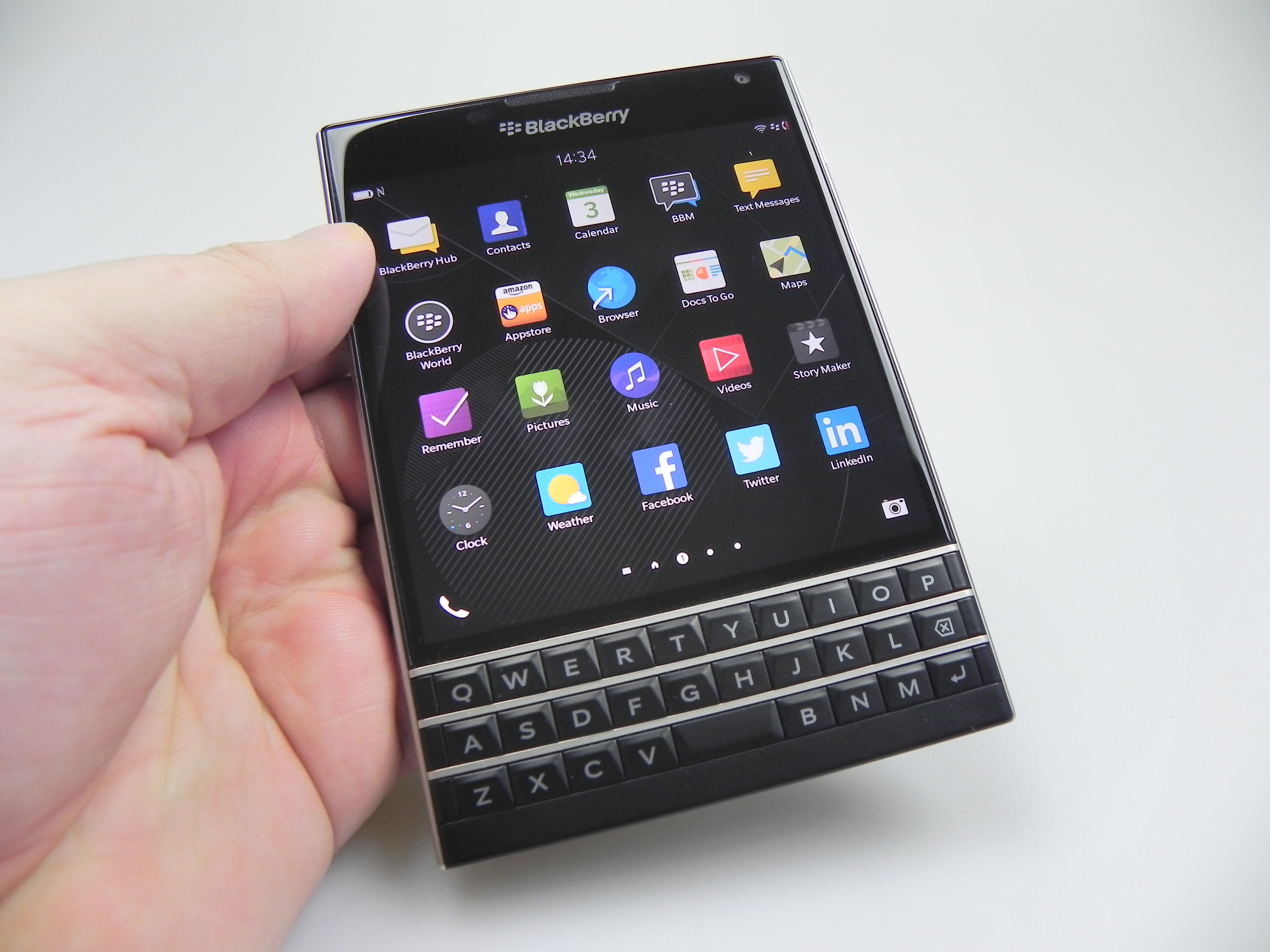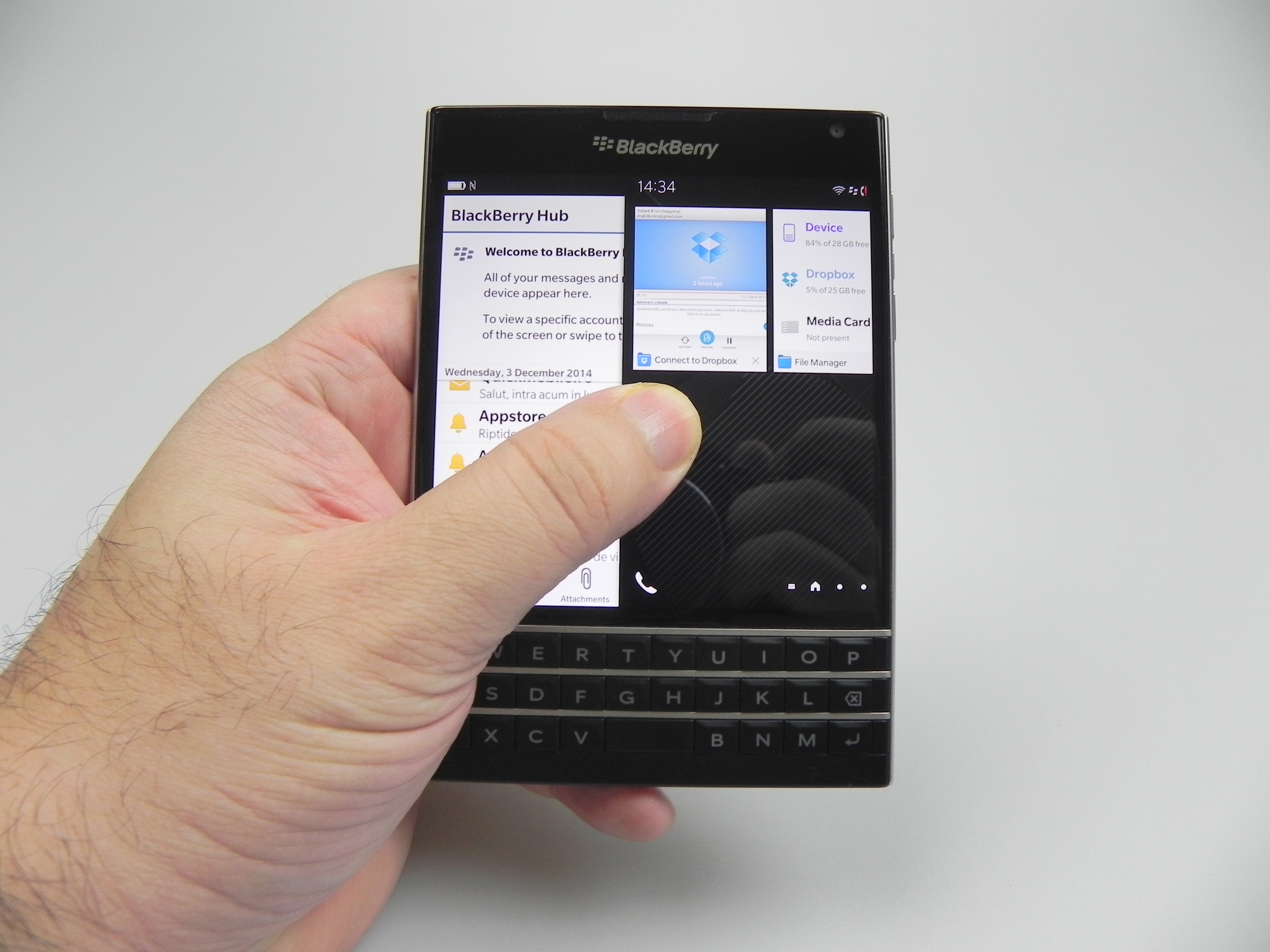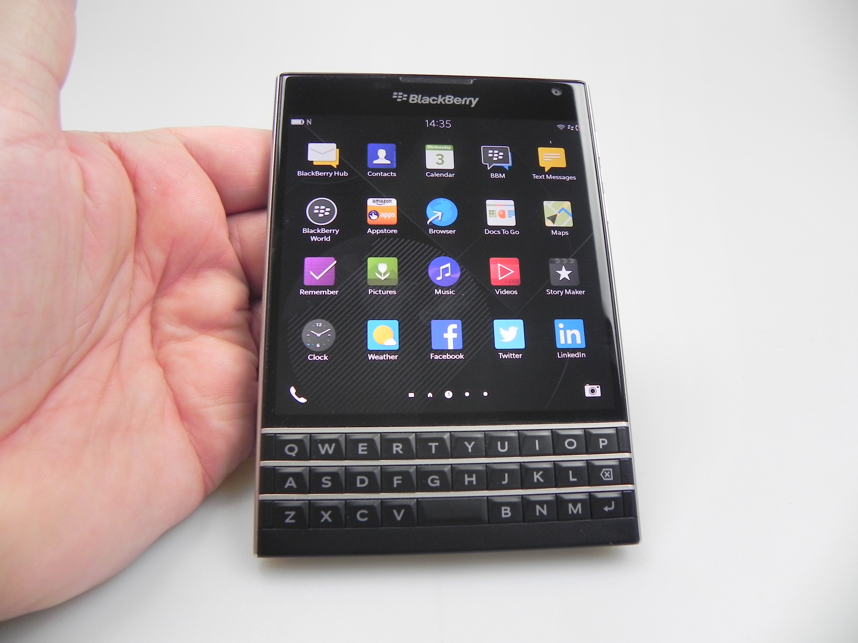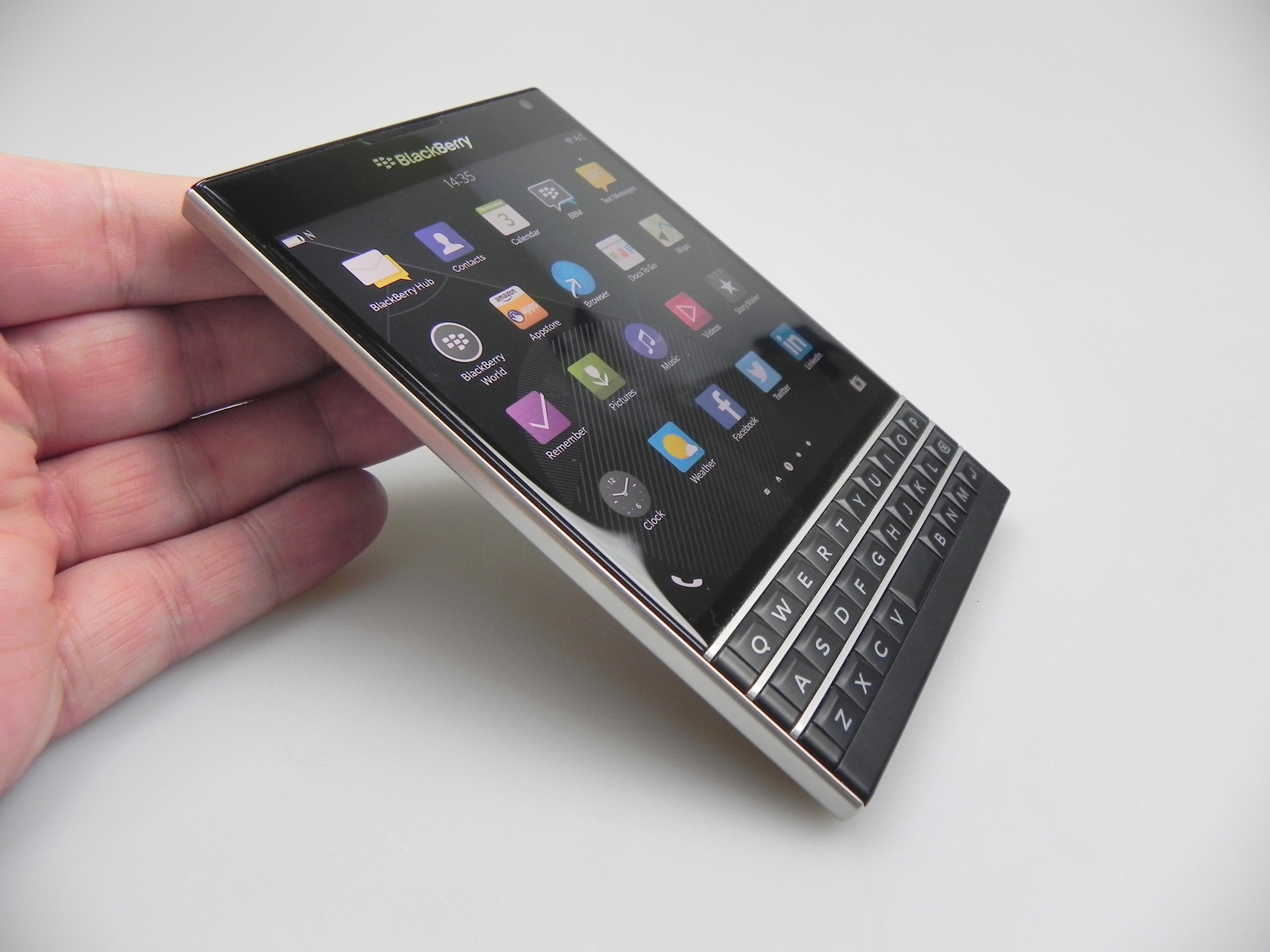 Then there’s BlackBerry Hub, Contacts, Calendar, Docs to Go, Maps, Story Maker, Weather, Facebook, Twittter, Linkedin, Foursquare and BlackBerry Blend. The latter allows you to move files back and forth between your Passport and your PC, Android or iOS device, using a dedicated app. All you need to do is download the Blend app on iOS or Android and you’ll have access to your messages, pictures and content if you input your BlackBerry ID. Finally, the app list also includes Evernote, a File Manager, Adobe Reader, YouTube Box, Smart Tags and Compass.