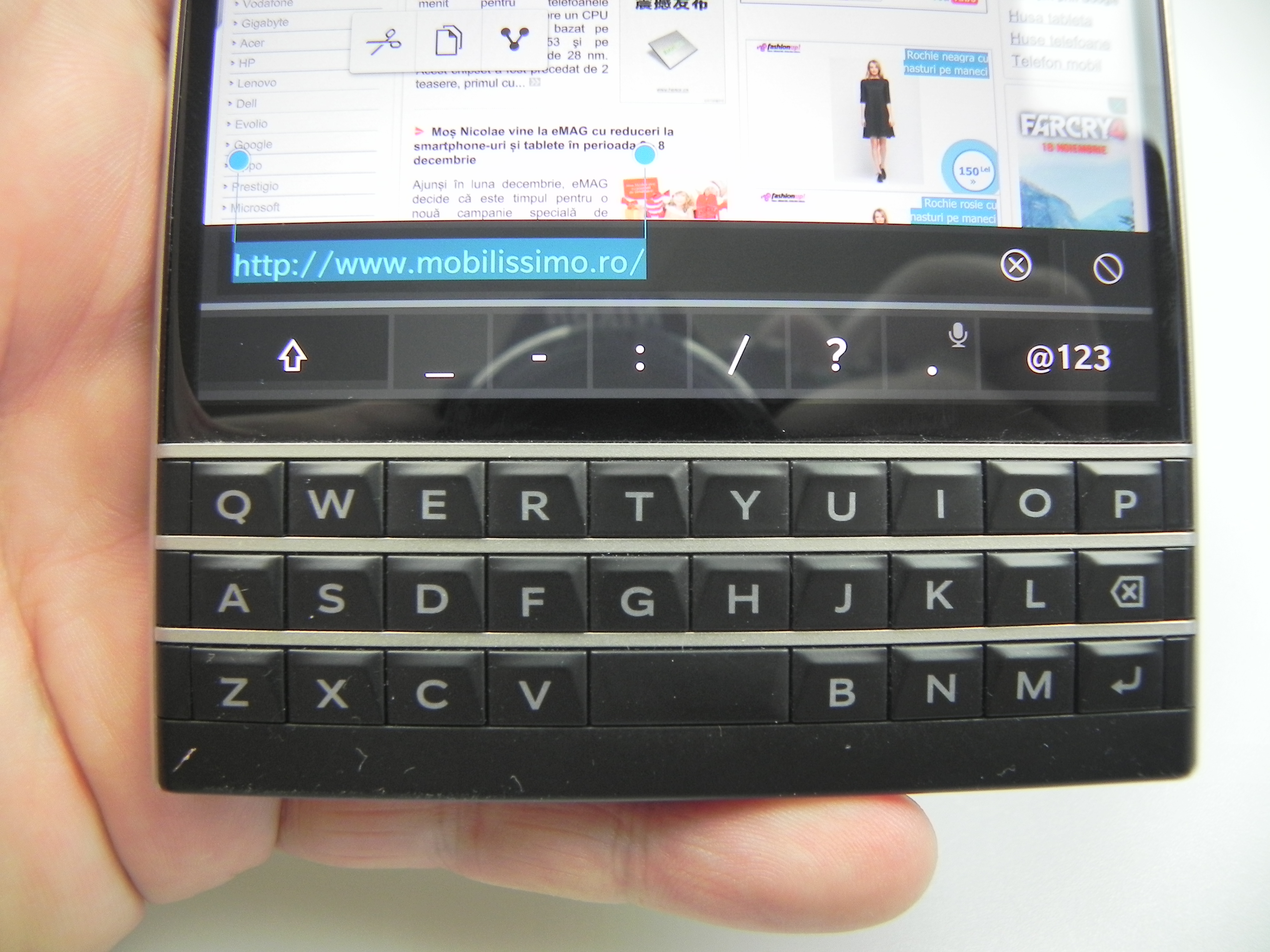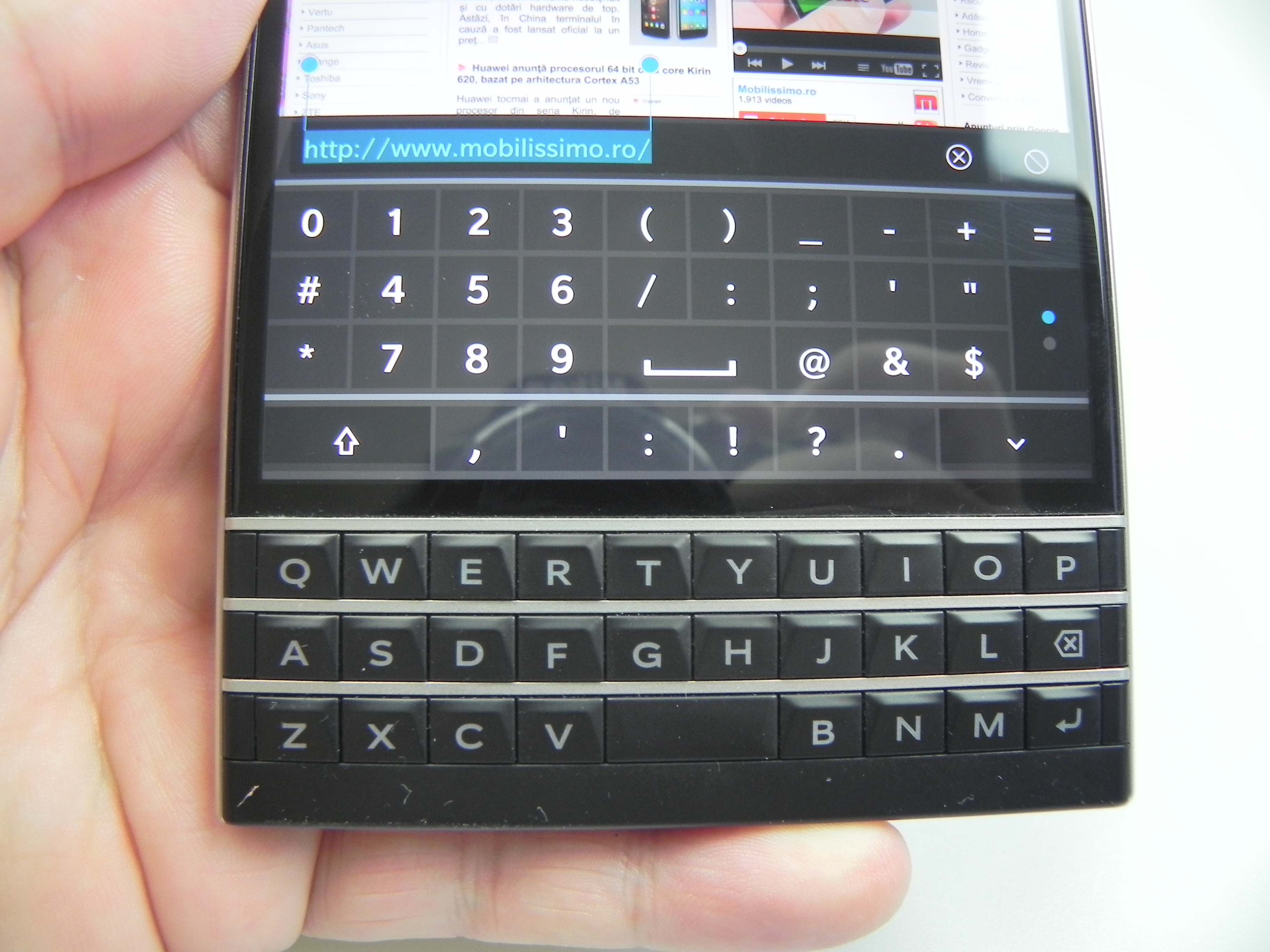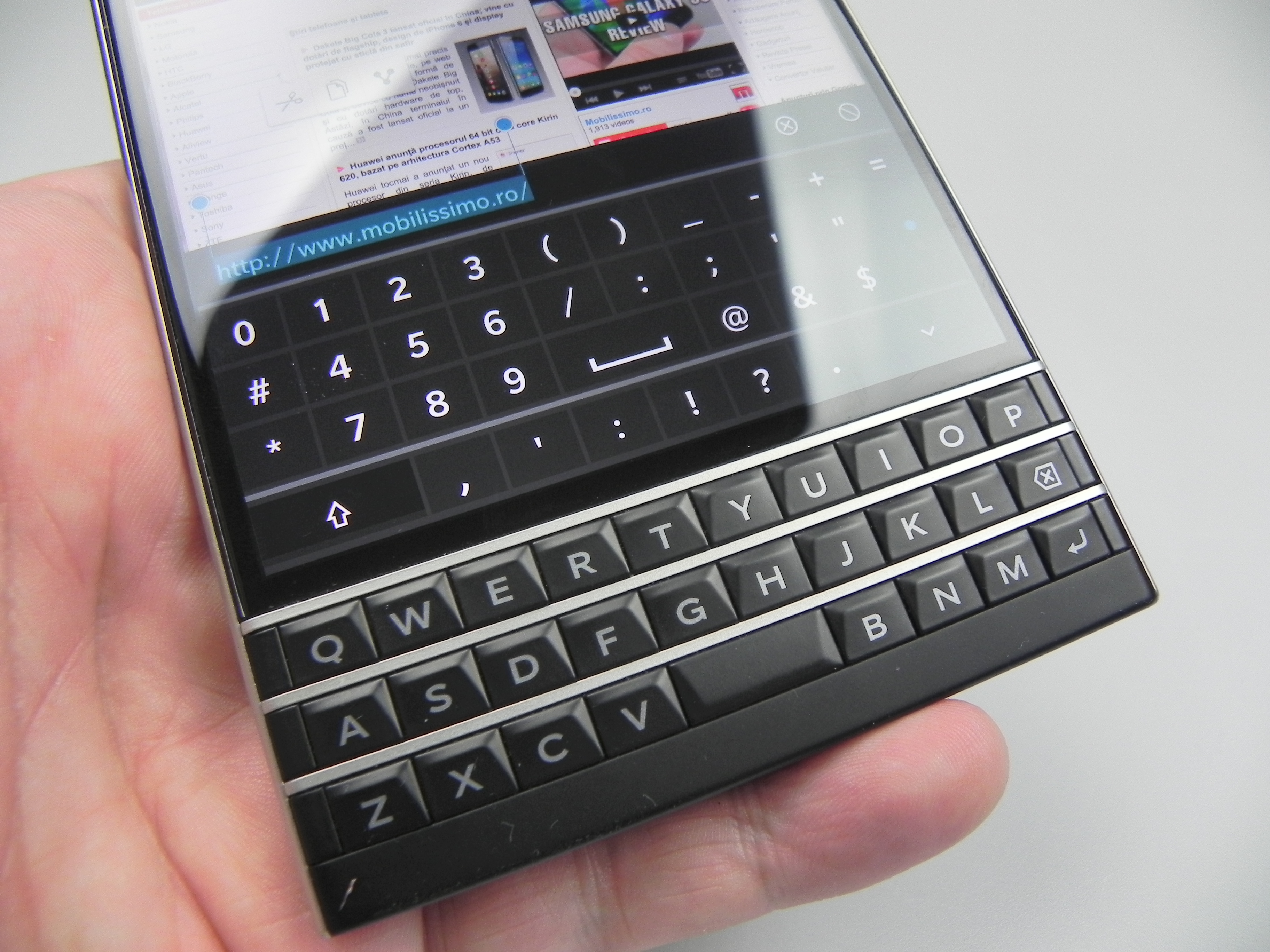 The physical QWERTY keyboard on the Passport has touch support for scrolling in lists and such gestures, but you can also used to swipe to the left in order to delete a word you’ve just written. Also, a swipe up inputs the suggestion offered by the prediction engine of the keyboard on the screen. Completing the functionality of the keyboard is a row or two of symbols and figures on the lower part of the touchscreen.