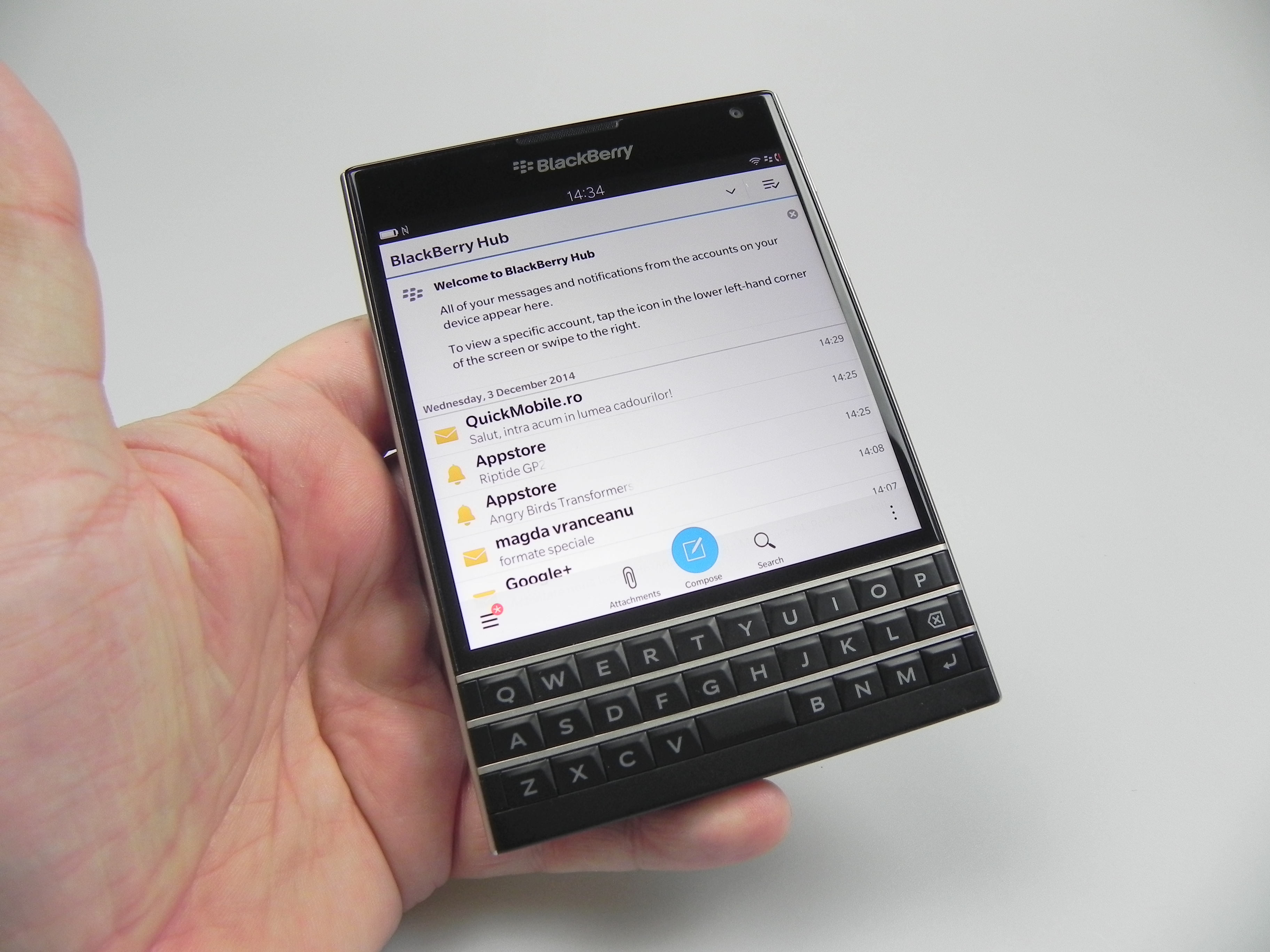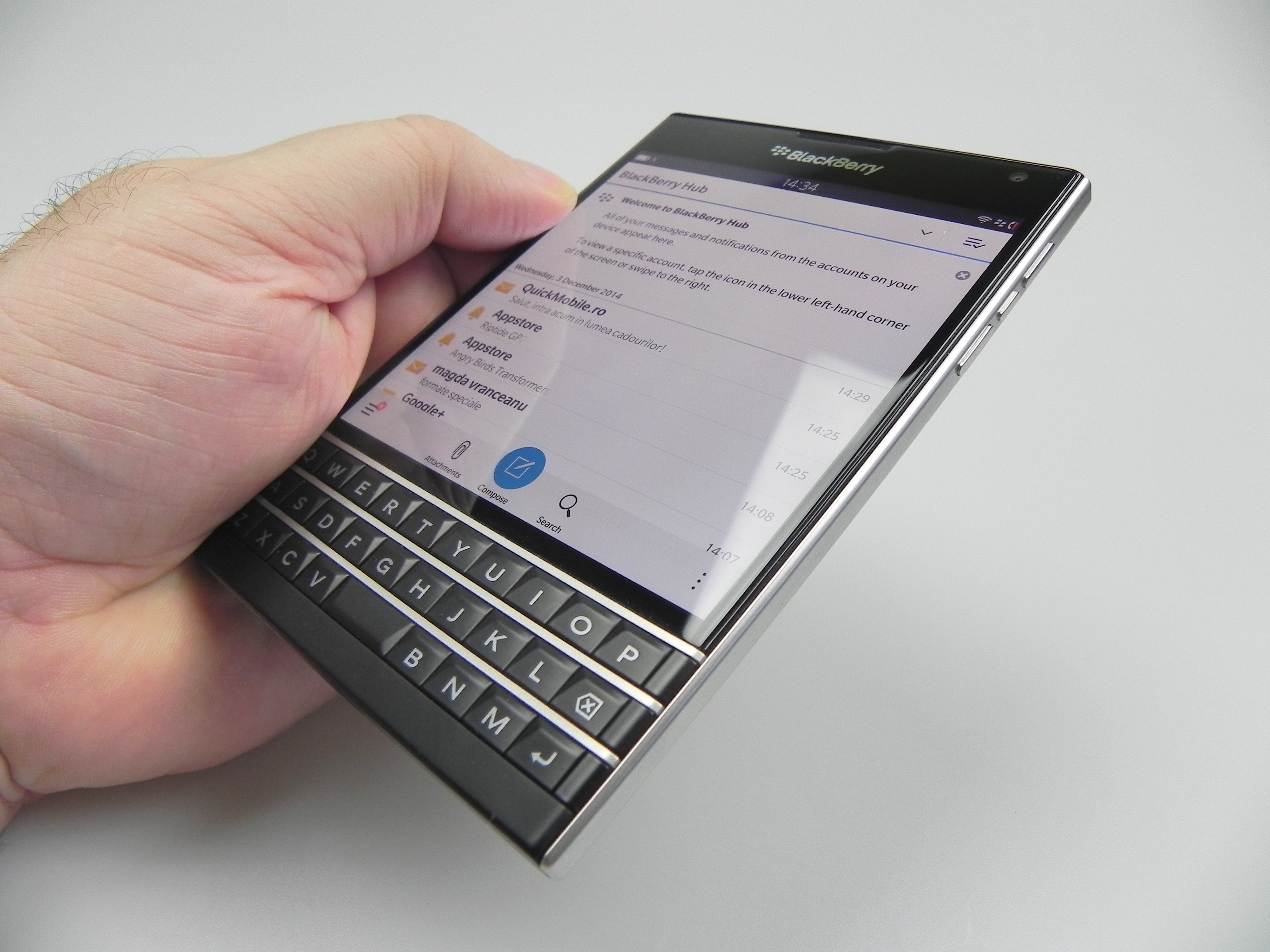 Now let’s discuss the software a bit. We’re running BB OS 10.3, with a homescreen focused on multitasking, by showing thumbnails of the apps running at the same time. They have an X in the lower right corner, used to close them up. If you swipe to the left you’ll see a few more homescreens with the app list on them. Swipe to the right and there’s the BlackBerry Hub, that focuses on communication. It gathers up all your texts, app notifications, Twitter and Facebook messages, calls and BBM, as well as emails. There are very intuitive compose and attach buttons, as well as a search one.