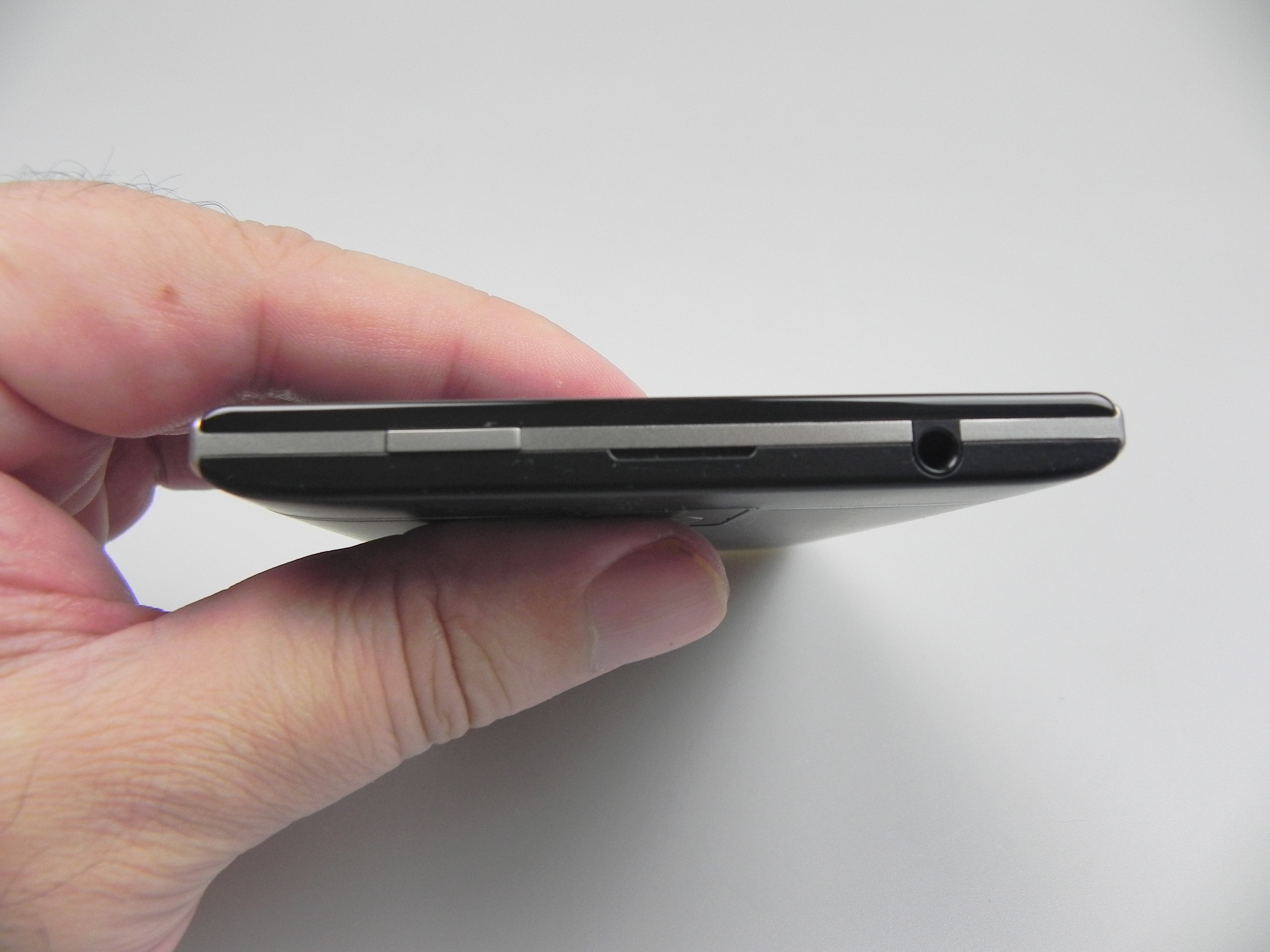 At the back you can find the main camera, flash, the logo and if you remove the cover at the top you’ll also see the nano SIM card slot and the microSD one. On the right side there are the volume buttons and between them there’s an extra button for play/pause and also used to trigger the BlackBerry Assistant when keeping it pressed. On the left side there’s nothing and at the top we find the On/Off button and audio jack. All of the buttons on this handset offer good feedback, by the way.