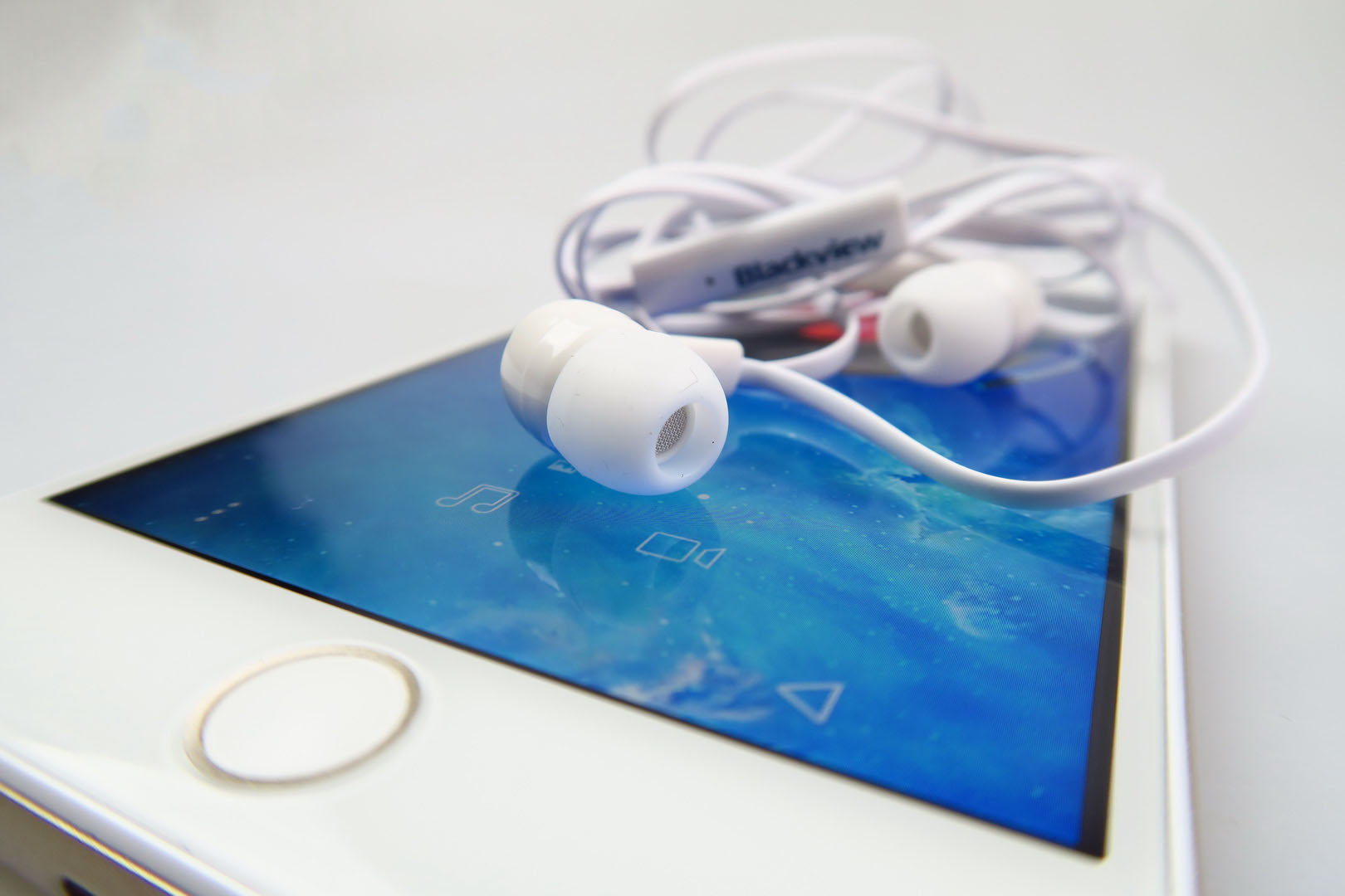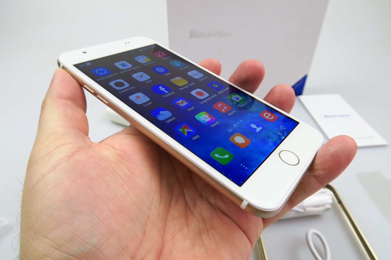 The box is rather large here and hosts a LOT of accessories. We do mean it! There’s a charger, USB cable, USB OTG cable, manual, headphones, case, bumper case, protection for the screen and metal key for the slots. This phone measures 7.9 mm in thickness and packs a quad core MediaTek MT6735 processor. Aside from looking like the iPhone 6 Plus, this device also has a fingerprint scanner embedded within the round front button.