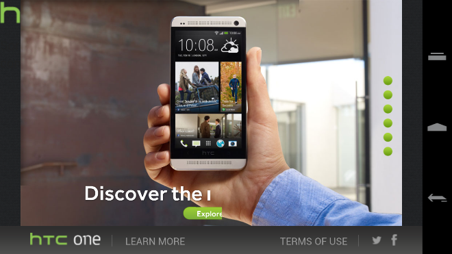 Unfortunately HTC’s website for the latest flagship smartphone is not optimized for mobile devices. Sure, it sounds rather absurd that you can’t watch the HTC One in action from your … let’s say HTC device but the site is so heavy on content that few mobile browsers can even handle it. In any case, with the standard webkit browser in Android I went as far as the Explore page before it crashed on me. Even with this the case, I still advise you to visit it from your PC, for one of the best experiences ever.