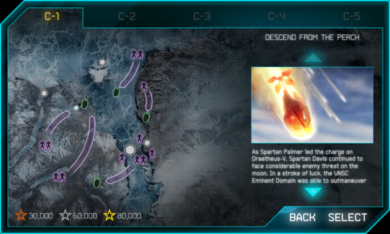 Halo Spartan Assault offers you 25 single player missions and the title takes up about 700 MB of storage. The control is done with the aid of two virtual joysticks shown on the screen, one that allows you to direct the character and the other used to direct your shooting. I recognized most of the aliens and weapons from Halo 3, including that cool sniper, that kills foes in a shot.
