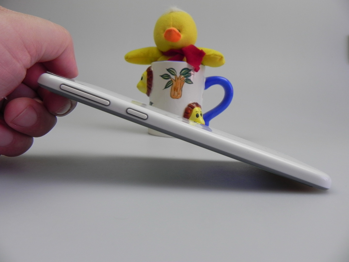 The device is priced at $350 in USA and our version came in white and gray. The device uses a glossy plastic case, like the predecessor, but it’s not as slippery as one would expect. It’s still a very big machine, that makes one handed use kind of hard, but it’s a phablet after all, so that was expected. This model measures 7.7 mm in thickness, while the predecessor measured 7.9 mm, so that’s an evolution.