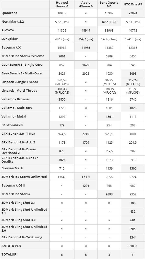 Back to the performance, while the HTC One A9 doesn’t have lag per se, apps open a millisecond or two too late according to modern requirements. Processing also takes long for pictures and other related features. Games like Riptide GP2 and Ultimate Tennis work and look fine though. We did a benchmark comparison of this model, versus the Huawei Honor 6, iPhone 6 and Xperia M5. These are the results: