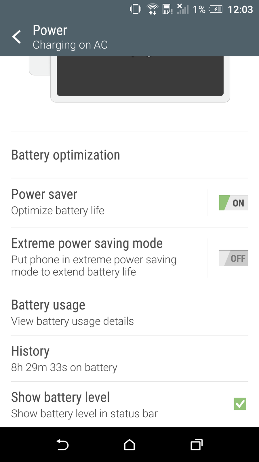 Settings include Battery options, like Battery Optimization, which is basically a way to trigger Doze or let a few apps not bothered by it. Then there’s Power Saver, that reduces CPU usage and location services, as well as vibration, at a certain battery percentage. Of course, we also have Extreme Power Saving mode, that only lets you use essential features like messages, phone, mail, calendar, calculator, clock and keeps notifications off, everything with a minimal UI.
