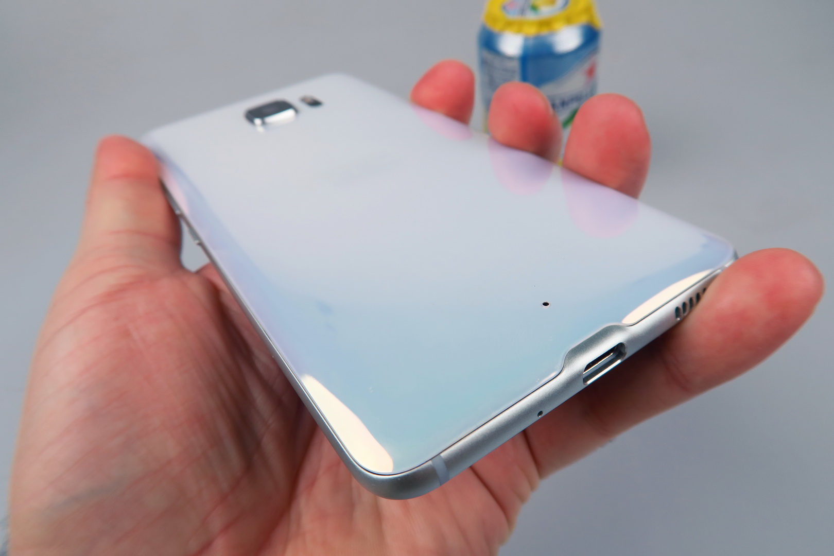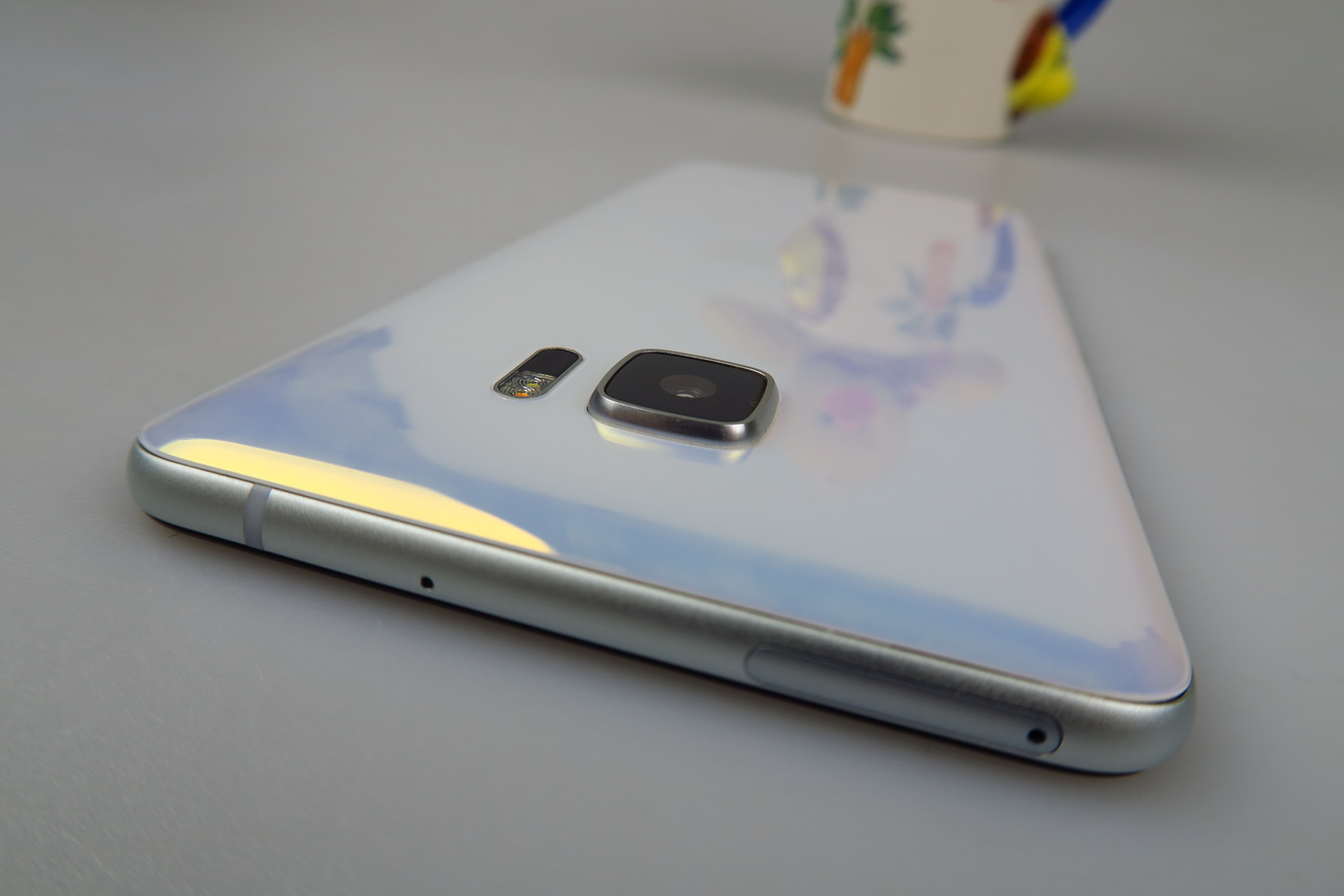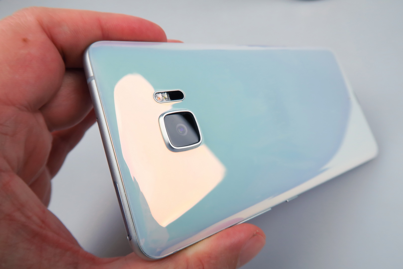 HTC calls this “Liquid Surface” and it has something to do with the way that the glass at the back seems to change color when catching light. It’s a matter of taste, but some people may take this feature as a kitsch, while others see it as appealing. This one is a huge and slippery machine, prone to fingerprints and grease. It’s well built, but very massive and hard to wield.