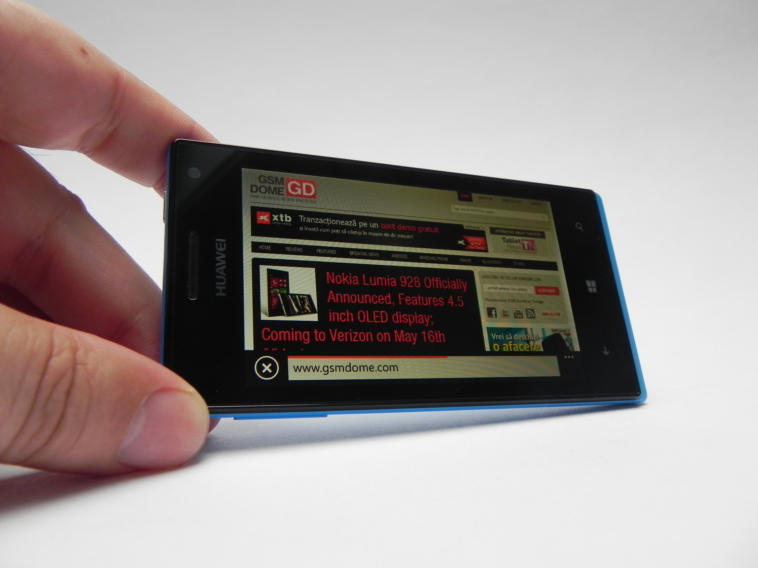 On the video side, we’ve got a screen that’s not as bright as many other WP8 devices, it has a low black level and bad sunlight behaviour. View angles are decent and Huawei relied on one glass screen technology here. The colors are realistic and the device supports H.264 playback, MP4 and WMV. Overall, the screen is slightly washed out, sadly.