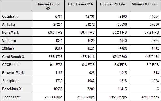 There’s a bit of static on the other side. Now off to the benchmarks, that had us comparing the Huawei Honor 4X with the HTC Desire 816, Huawei P8 Lite and Allview X2 Soul. This is a battle of the Kirin 620 octa core chipset + 2 GB of RAM versus the Snapdragon 400 + 1.5 GB of RAM versus the Kirin 620 + 2 GB of RAM and the MediaTek MT6592 + 2 GB of RAM. Here are the results: