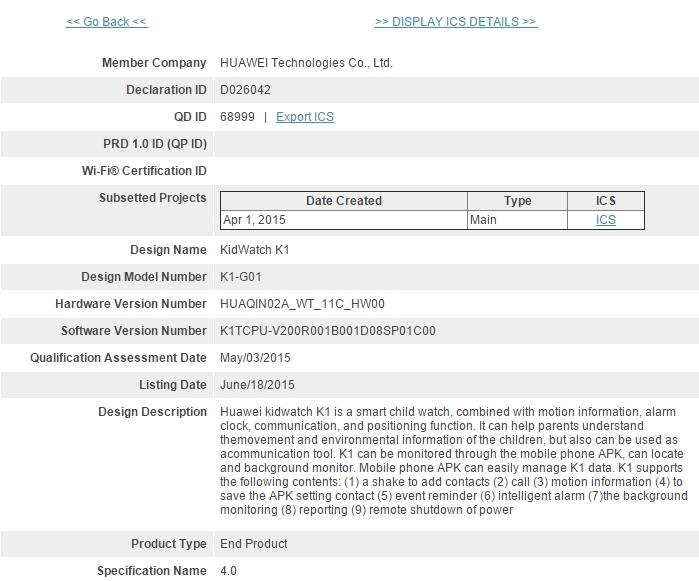 Even if at the moment, Huawei has in its portfolio just a single smartwatch product, it seems that the company wants to bring on the market such a product designed for kids, a pretty interesting move. The new portable device is called Huawei kidWatch K1 (K1-G01), and recently was certified by Bluetooth SIG.