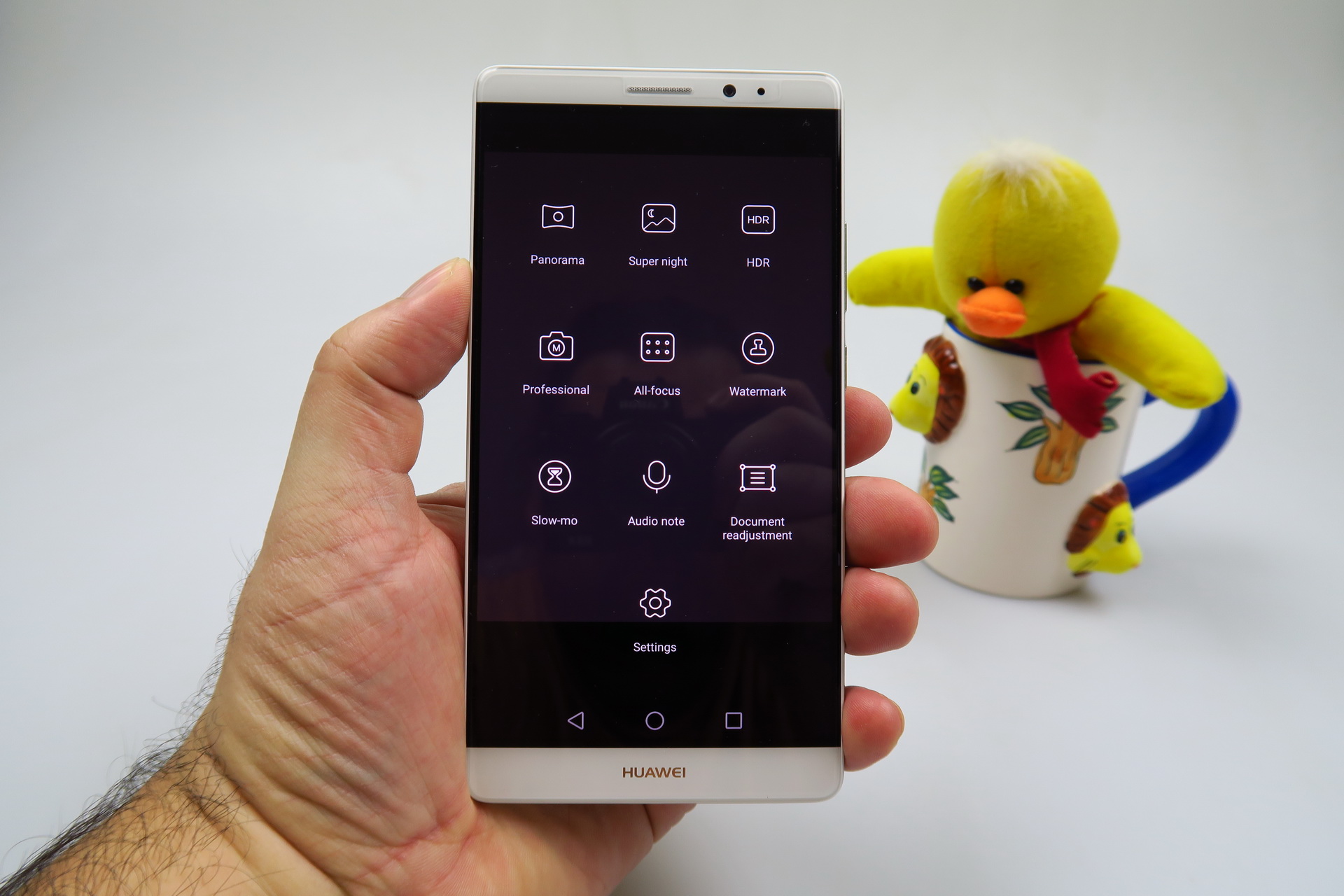 To the left we find a shortcut to the main capture features like HDR, Watermark, Document Readjustment, Super Night, All Focus, Audio Note, Panorama, Professional and Slow Motion. The Pro mode brings forth a few of its own options, like a semicircle of setups for white balance, focus, exposure, ISO up to 1600 and shutter speed (from 1/4000 seconds to 8 seconds).