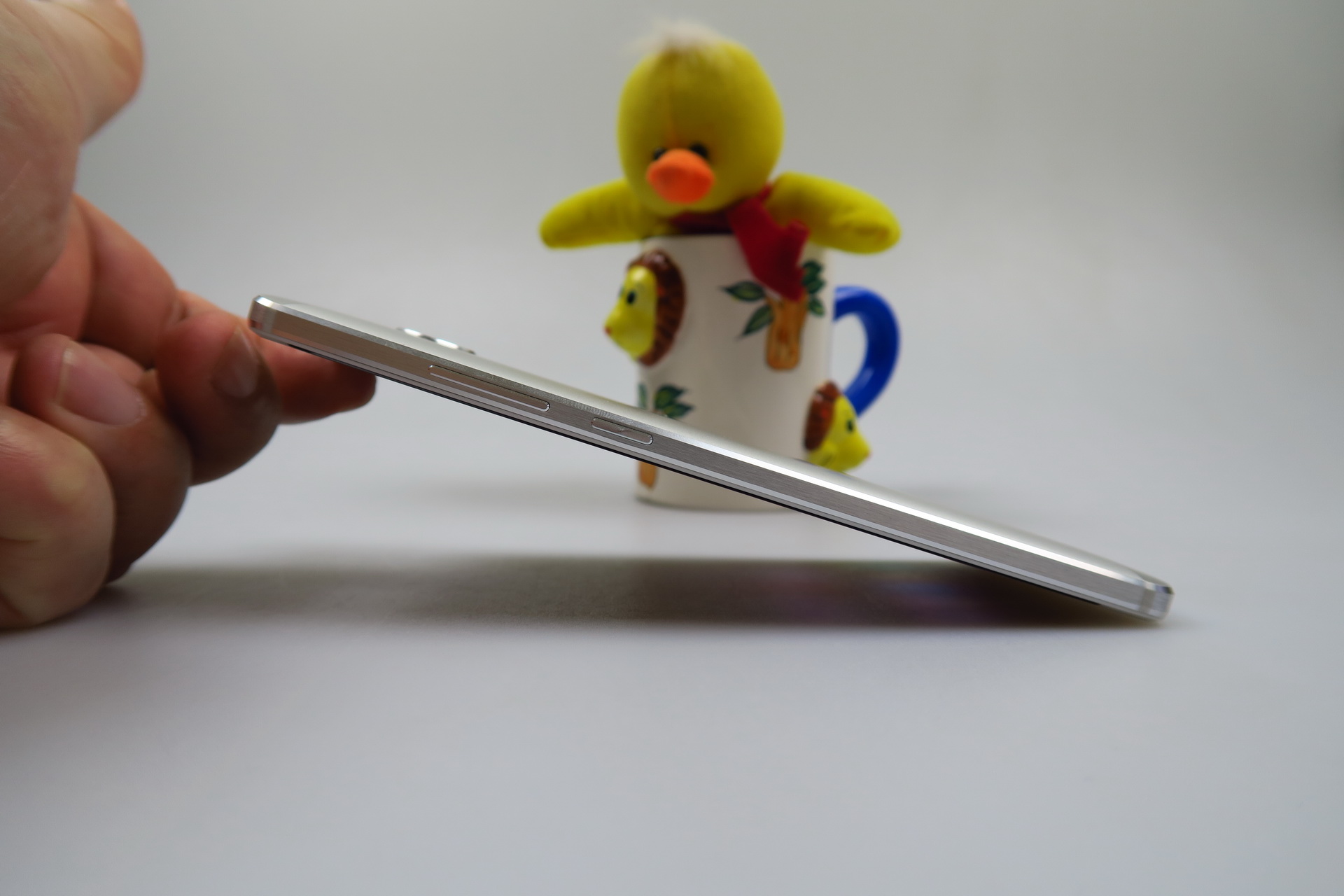 At the back there’s the main camera, with dual LED flash and fingerprint scanner below it. The antenna cutouts are pretty discrete. Moving to the top, this is where the microphone and audio jack are found, while at the bottom there’s the microUSB port and speaker grilles (only the right grille hides one). To the left Huawei integrated a big gray, accessed with a metal key and hosting two nano SIM slots, one of them becoming a microSD card slot if need be.