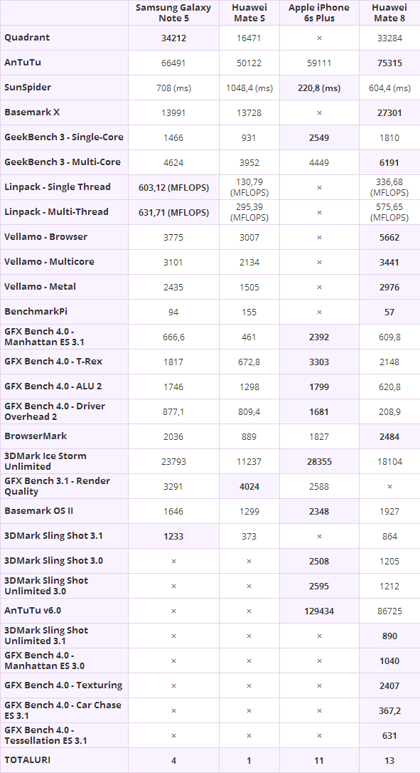 Only battery phones can beat the Mate 8 in this test, like the ASUS ZenFone Max with 16 hours and 24 minutes or the Allview P8 Energy, with 16 hours and 20 minutes. Charging took us 2 hours and 11 minutes, which is great, since it surpassed the time of the HTC One M9 (2 hours and 20 minutes), the OnePlus 2 (2 hours and 13 minutes) and HTC One M8 (2 hours and 30 minutes).