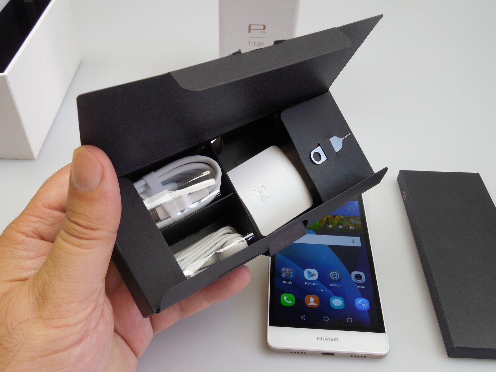 This model is priced at $250 at Walmart in USA and inside its compact box there’s a manual, charger, USB cable, headphones that look like Apple’s Earpods and finally a metal key used to access the device’s slots. Announced in April with the P8, the smartphone measures 7.7 mm in thickness and weighs 131 grams. It comes in black or white, with silver or golden edges.
