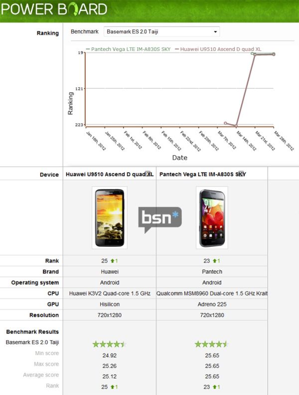 The chip inside the new Huawei phone is the K3V2 created by Huawei, that actually managed to beat the quad core Tegra 3 in some benchmarks (Basemark ES 2.0 Taiji), but in the end Snapdragon S4 took the cake. The powerful 28nm S4 chip is quite popular these days, being used on the US version of the HTC One X and on one of the versions of the ASUS PadFone, two of the most popular products at MWC 2012. If you’re wondering about the whole test thing, know that the device packing the S4 was actually an odd one, the Pantech Vega LTE Sky phone.