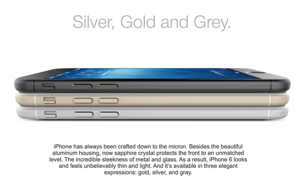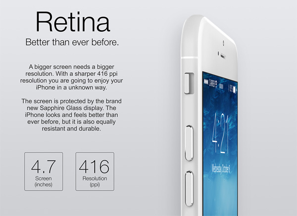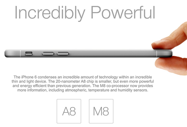 This unit comes with up to 128 GB of storage, an improved Touch ID fingerprint scanner and a chassis that measures just 6.5 mm in thickness. The product weighs 100 grams and integrates an Apple A8 20 nm processor, as well as he M8 coprocessor. This new version of the coprocessor provides information about atmospheric conditions, temperature, humidity and more. Upfront there’s a 4.7 inch Retina Display with a 416 ppi density and at the back we’ve got the rumored 13 MP camera with Sony sensor.