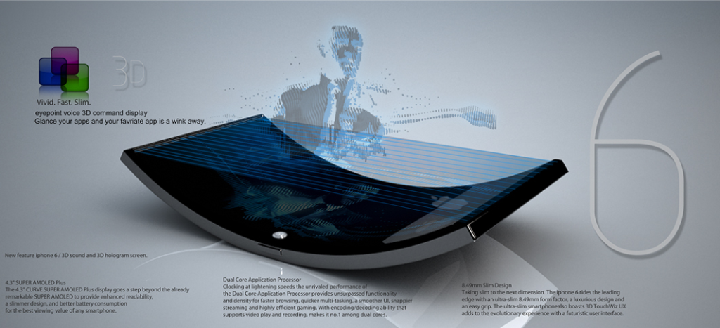Chris Youn envisioned two new interesting iPhone concepts, both with 3D displays. The more appealing one is the iPhone 6 with a 3D curved Super AMOLED screen and a hologram interface. This device is shown below and followed by the picture of an iPhone 5 design that may not be that impressive, but it still gets you thinking.