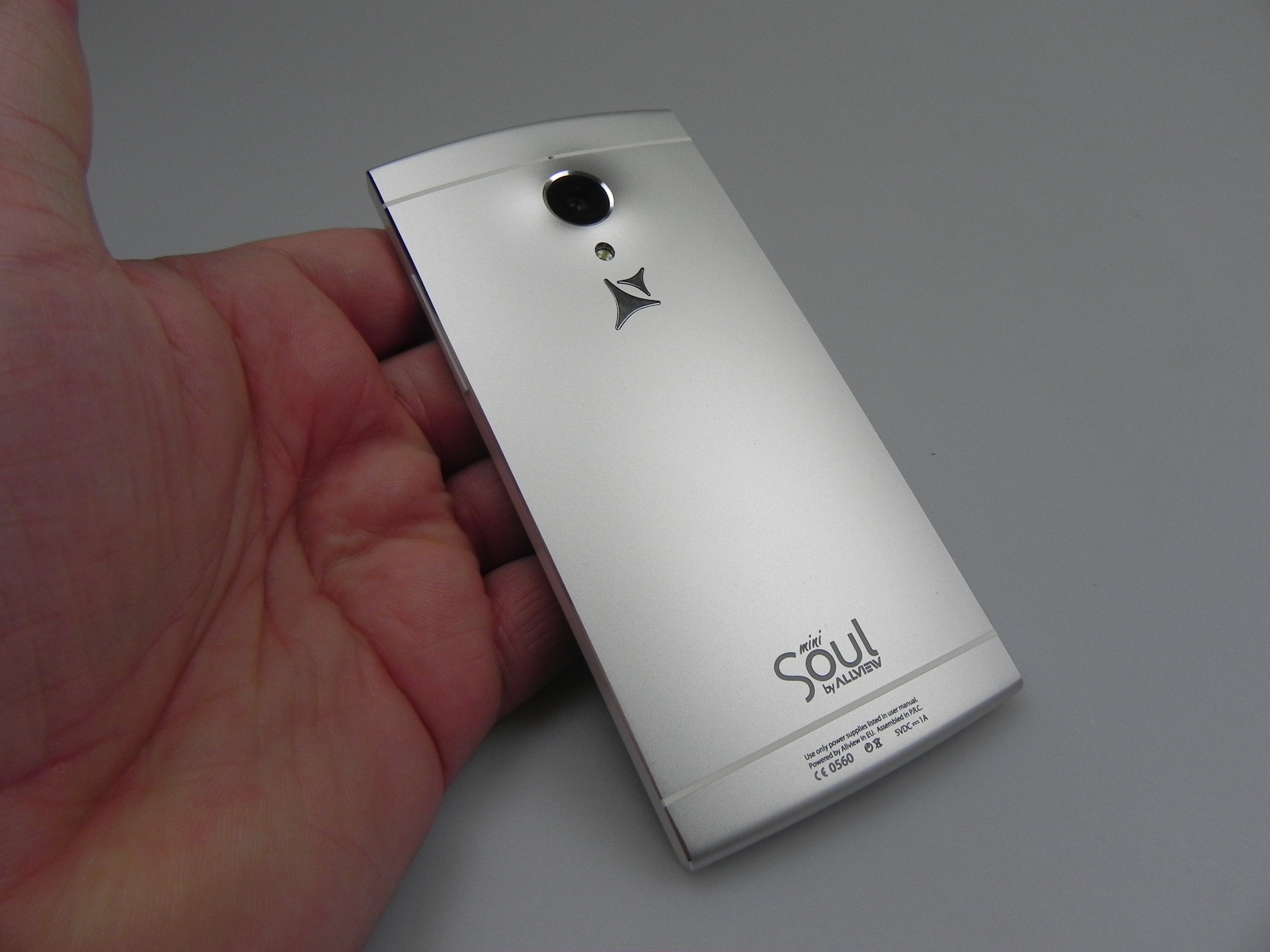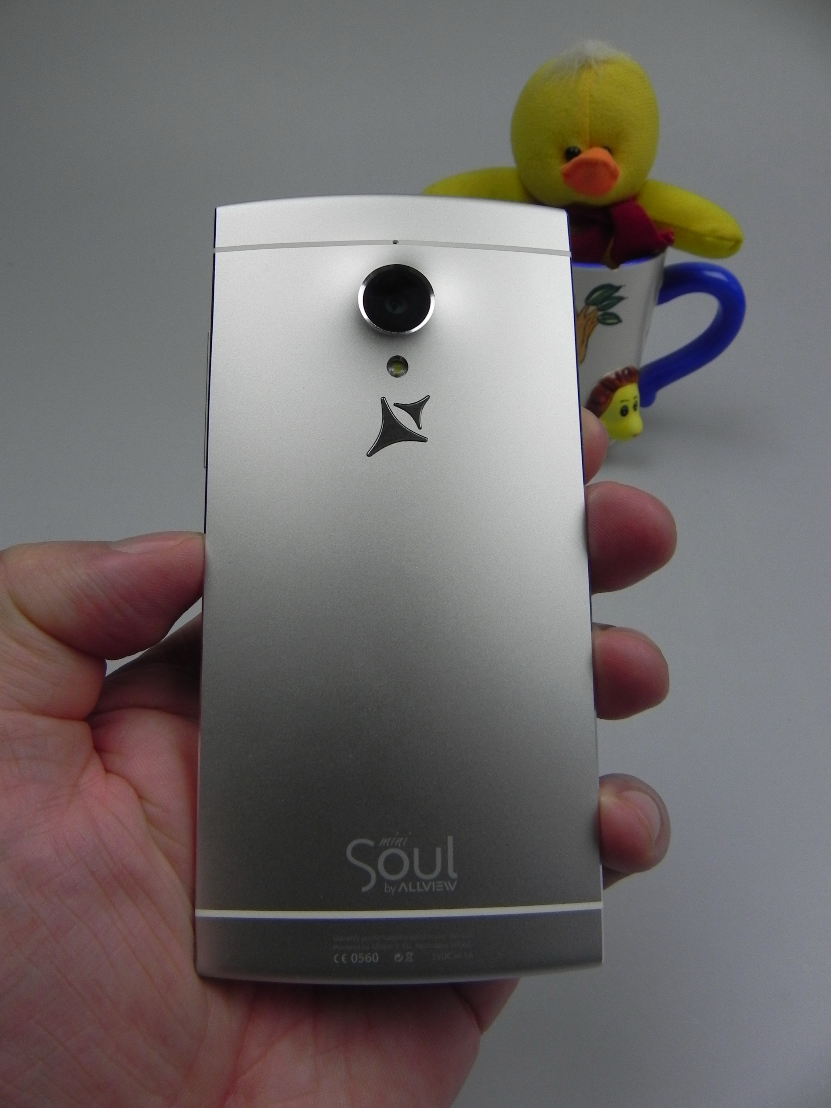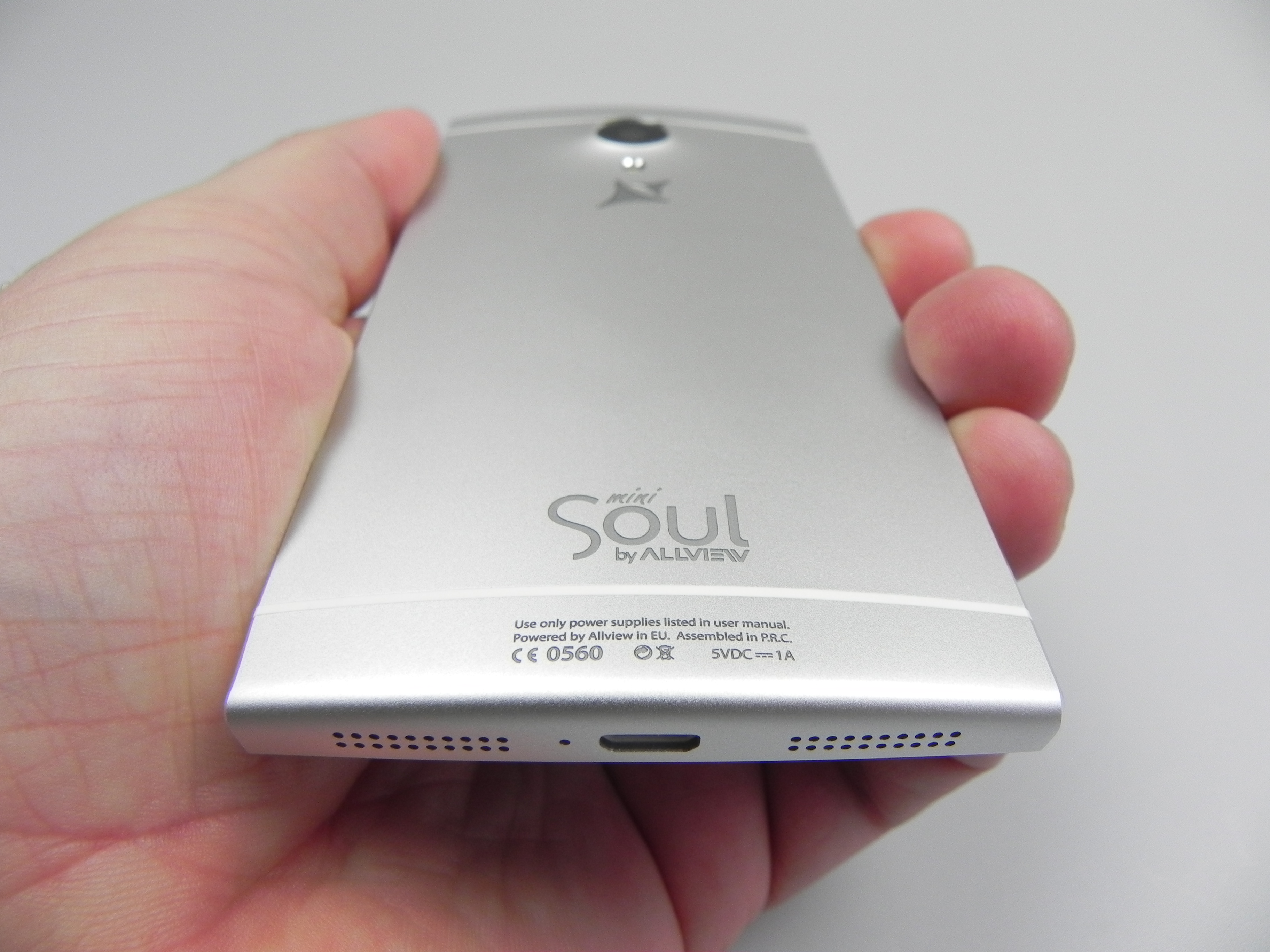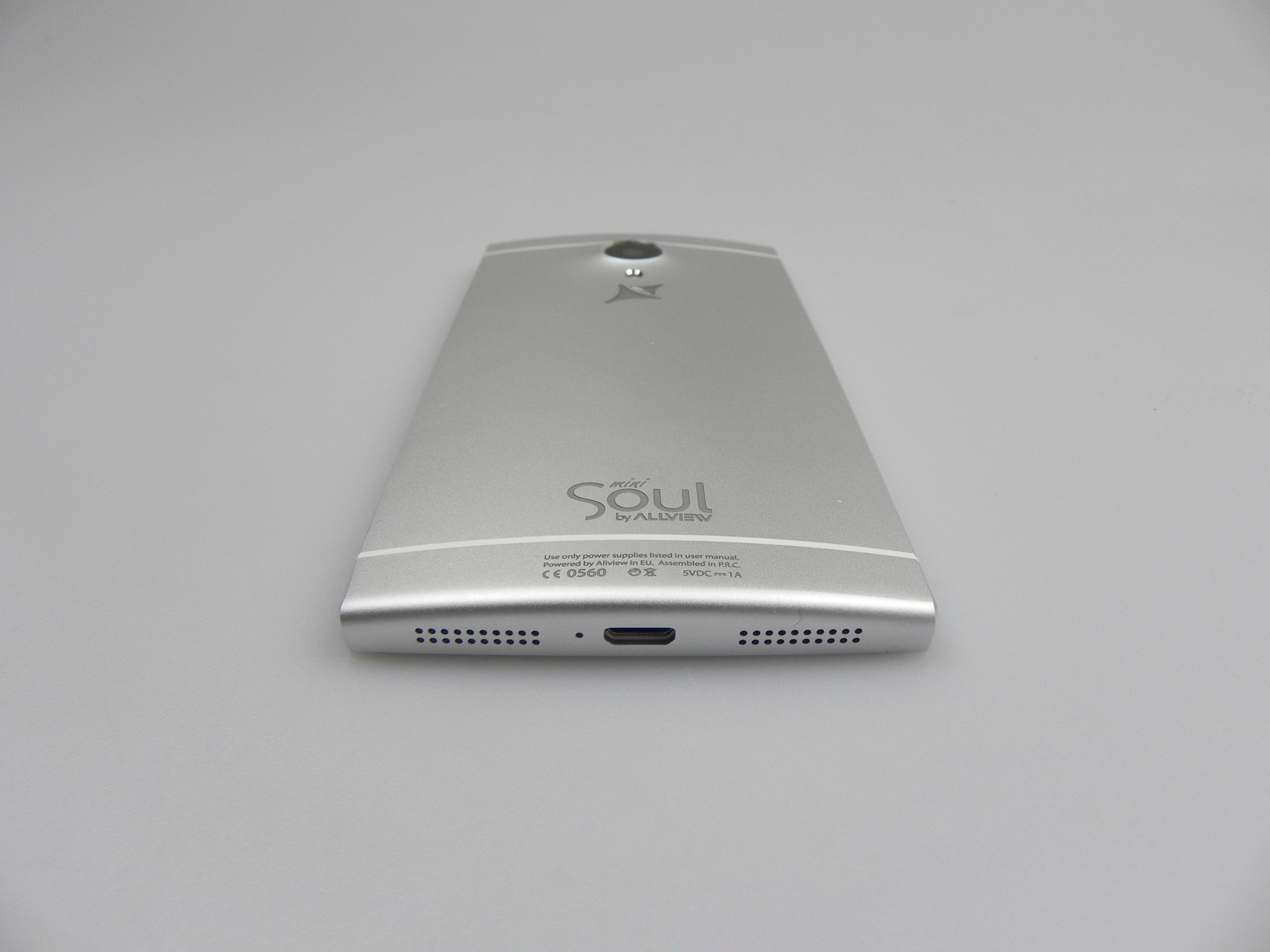 Romanian brand Allview also offered a custom version with a message engraved at the back of the device, depending on the user’s preference. At the front we find an earpiece, notification LED, front camera, 3 capacitive buttons and at the back there’s a big camera bulk, a microphone and LED flash. We’ve got speakers at the bottom, a microUSB port and another microphone.