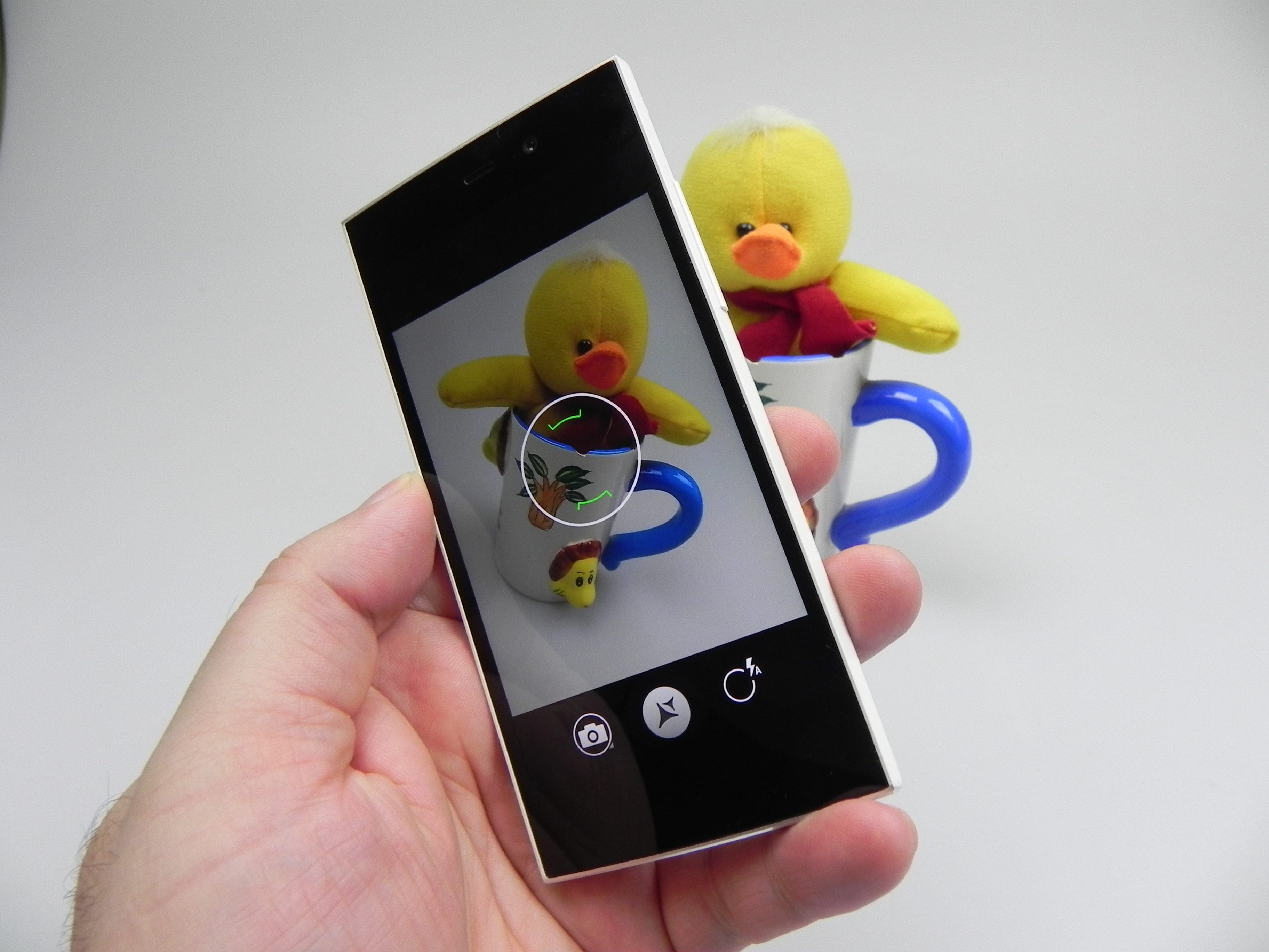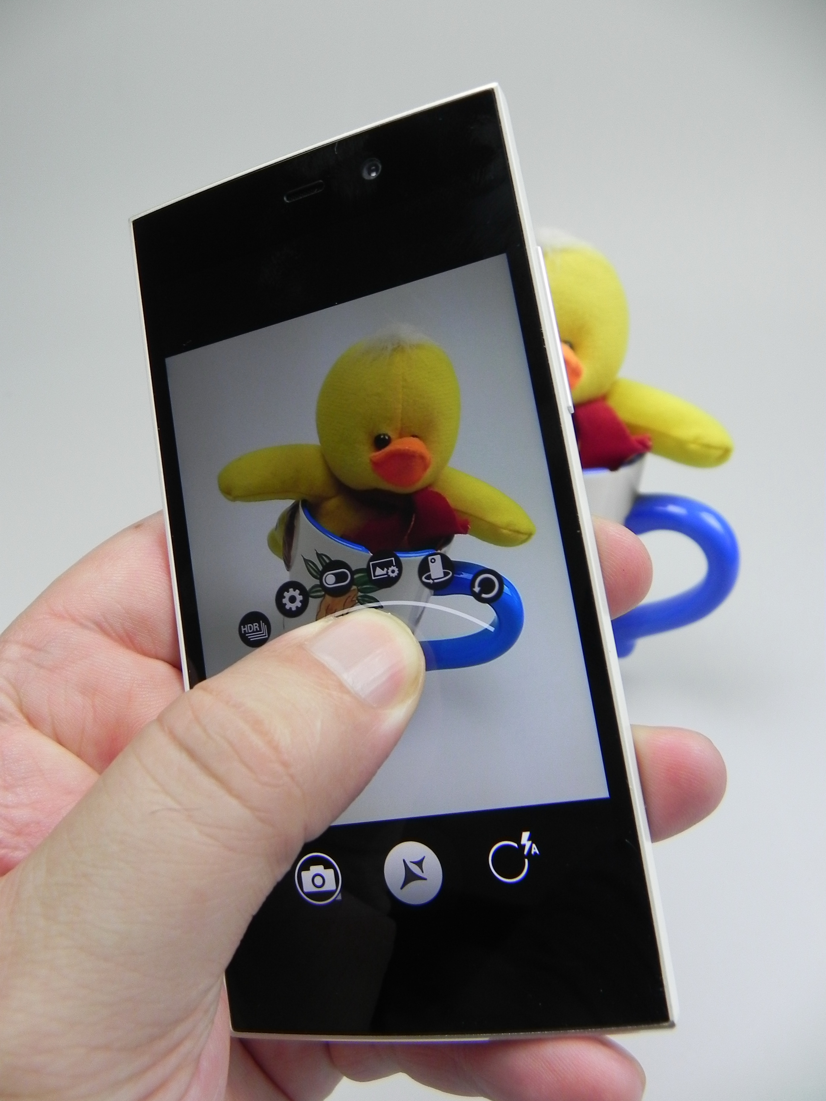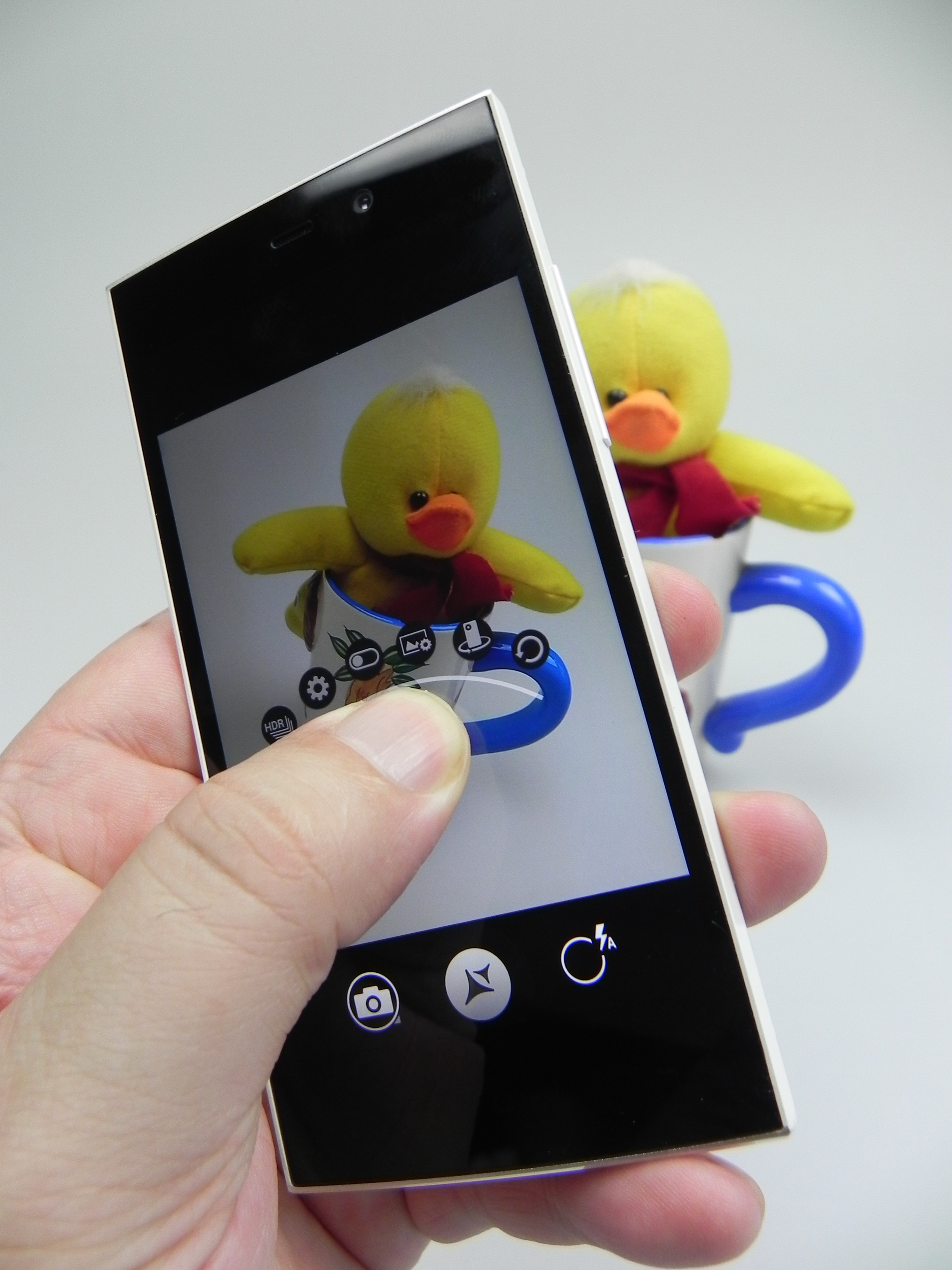 There’s a semi circle in the middle of the screen with options like HDR, location, resolution (16 MP in 4:3 or 13 MP in 16:9), picture quality, timer, volume keys, color effect, face detect, touch AF/A, saturation, contrast and sharpness. Even more options include anti banding, ISO up to 1600, Wavelet Denoise, exposure, white balance, flash, focus (auto, infinity, macro, normal, CAF).