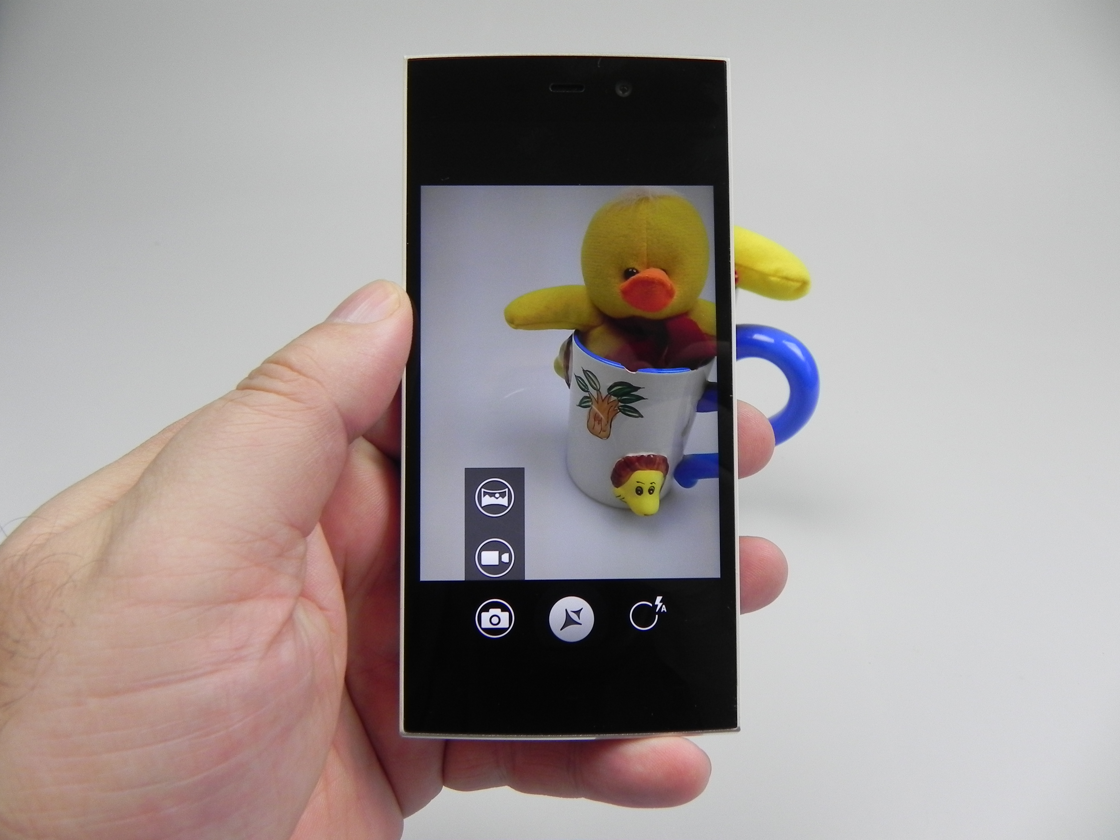 The front camera is the appealing part, a 4 MP unit with Ultrapixel technology and 2 micron pixel size. It’s an Omnivision OV 4688 sensor in the mix, from 2013, a model also used on HTC One handsets as the main camera. It measures 1/3 inches and uses lower power. The camera UI is similar to what we saw on the Jelly Bean stock camera app, but slightly tweaked.