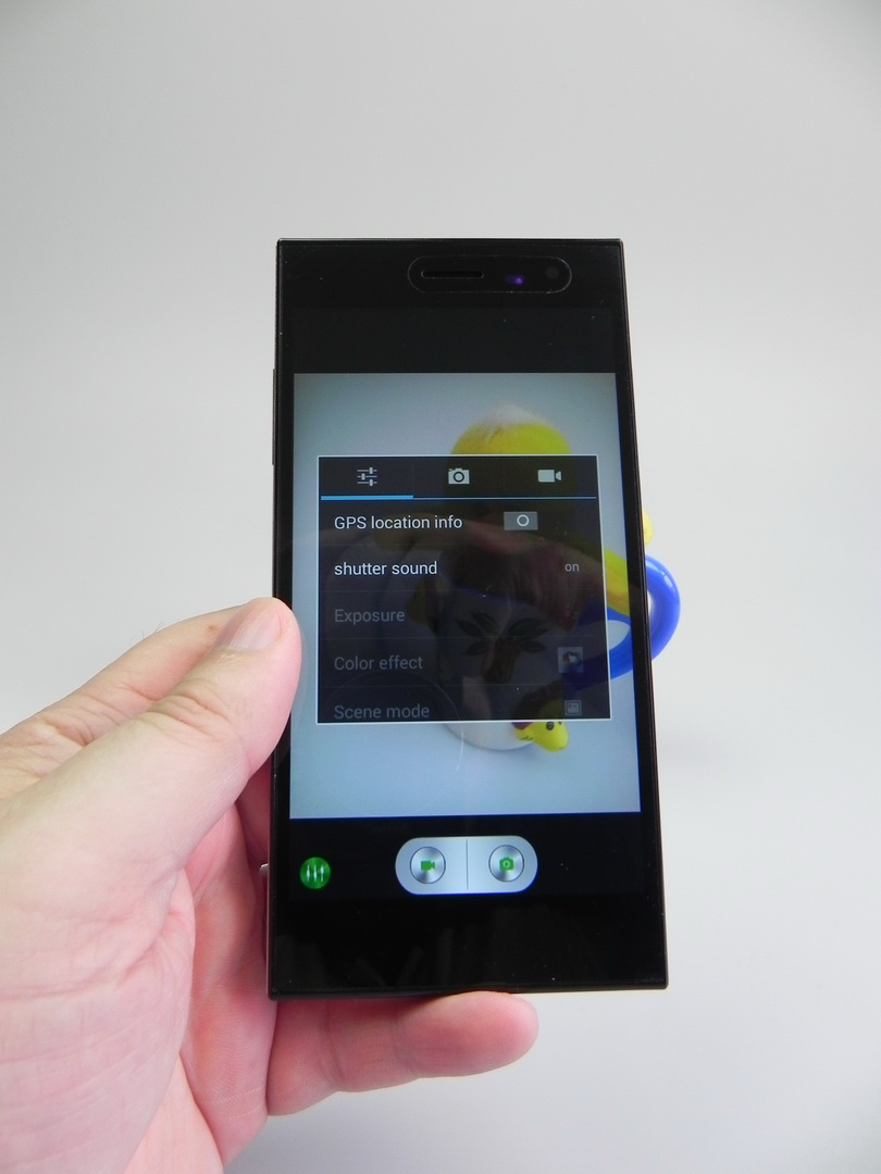 At the top we find options like HDR, flash, front camera shortcut and on the right side there’s the shutter button and video button. Options include GPS location, shutter sound, exposure, color effect, scene mode, white balance, sharpness, scene mode, hue, saturation, brightness, contrast, anti flicker, volume keys features, zero shutter delay, voice capture and face detection.