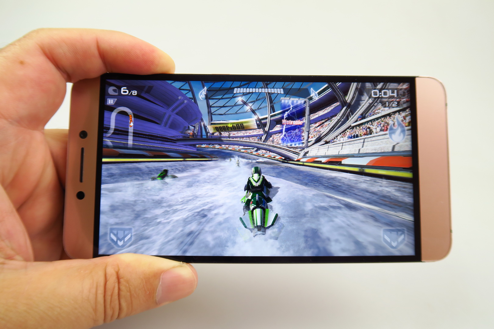 It’s easy to cover in landscape mode, when playing games or watching video. The speaker experience was loud and clear, we’ve got good bass and it can cover a conversation. It’s actually very loud to be honest and the instrument rendering is excellent. The decibelmeter test we did showed a value of 78.7 dBA when playing our usual sound test sample, while in Riptide GP we got as high as 95 dBa.