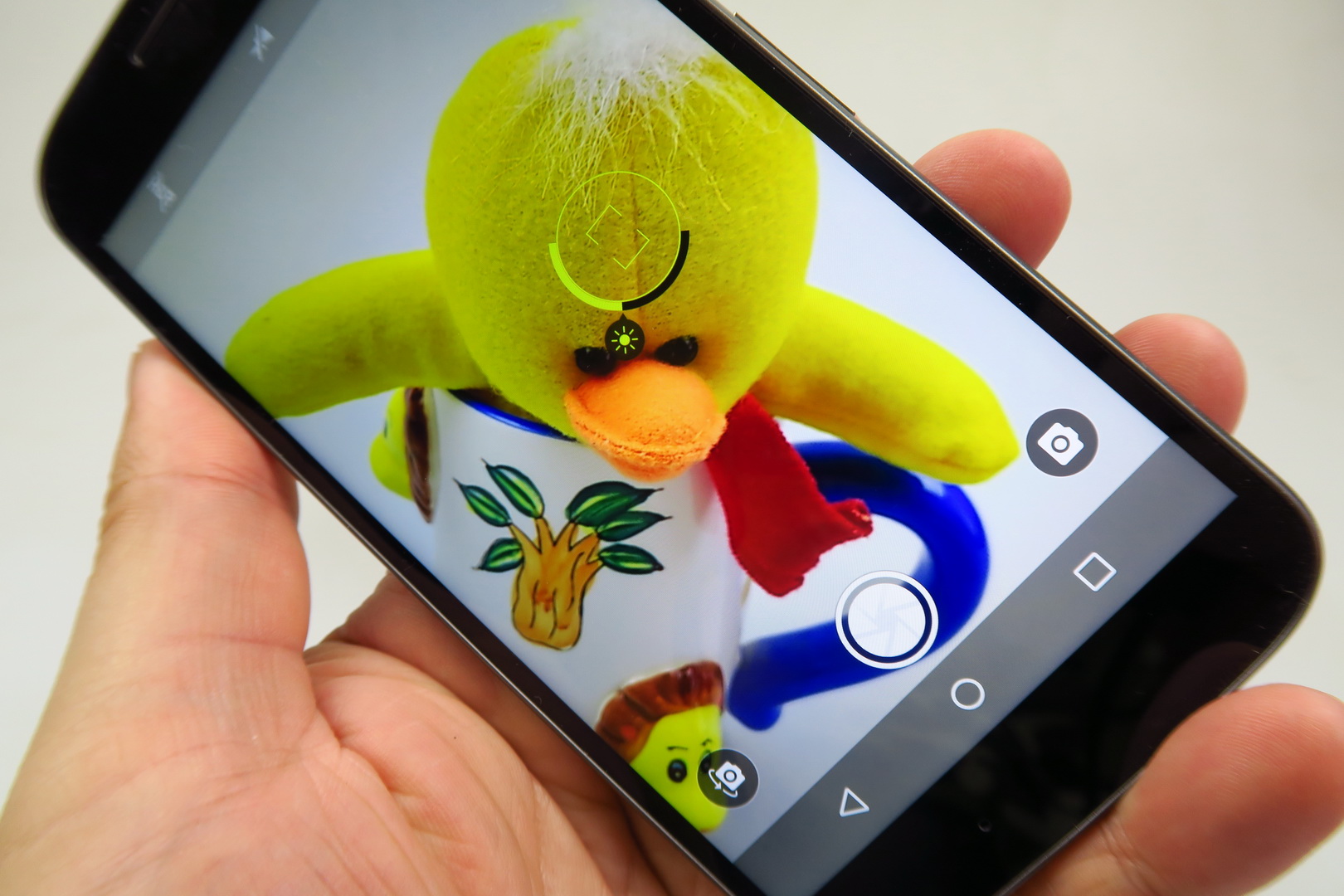 There’s a 13 megapixel back camera here, with F/2.0 aperture, dual LED flash (dual tone), while upfront there’s a 5 MP shooter, with F/2.2 aperture and wide angle lens, plus display flash feature. The camera app starts up slow sometimes, other times fast and provides a simple and minimal UI, as close to stock as possible. Options include HDR that can be set to Auto/On/Off, timer, a brightness slider that appears when you touch the viewfinder, plus capture modes like Panorama, Video, Pro and Slow Mo.