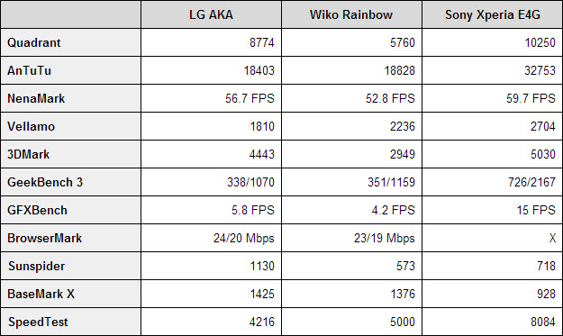 Sadly, the keyboard is not very well spaced and it’s rather narrow. The phone section brought us Speed Dial, one hand usage options, high volume and a clear and clean sound. Even some noise canceling made the cut. Now we get to the benchmarks, where we compared the LG AKA with the Wiko Rainbow and the Sony Xperia E4G. It’s a battle between a quad core Snapdragon 400 and 1.5 GB of RAM, plus a quad core MediaTek MT6582 and 1 GB of RAM, plus a 4 core MediaTek MT6732 and 1 GB of RAM.