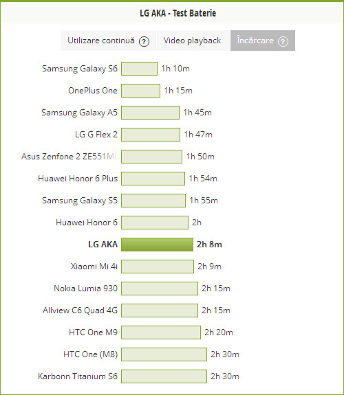 Then we did the PCMark test, that simulates continuous usage, with the brightness at 200 LUX, achieving a time of 6 hours and 22 minutes. We beat the LG G4 and its 5 hours and 19 minutes, as well as the Huawei P8 and its 5 hours and 31 minutes, but we scored below the Galaxy S6 and its 7 hours and 6 minutes. Overall, battery times are quite good here and the charging takes 2 hours and 8 minutes, which is OK.