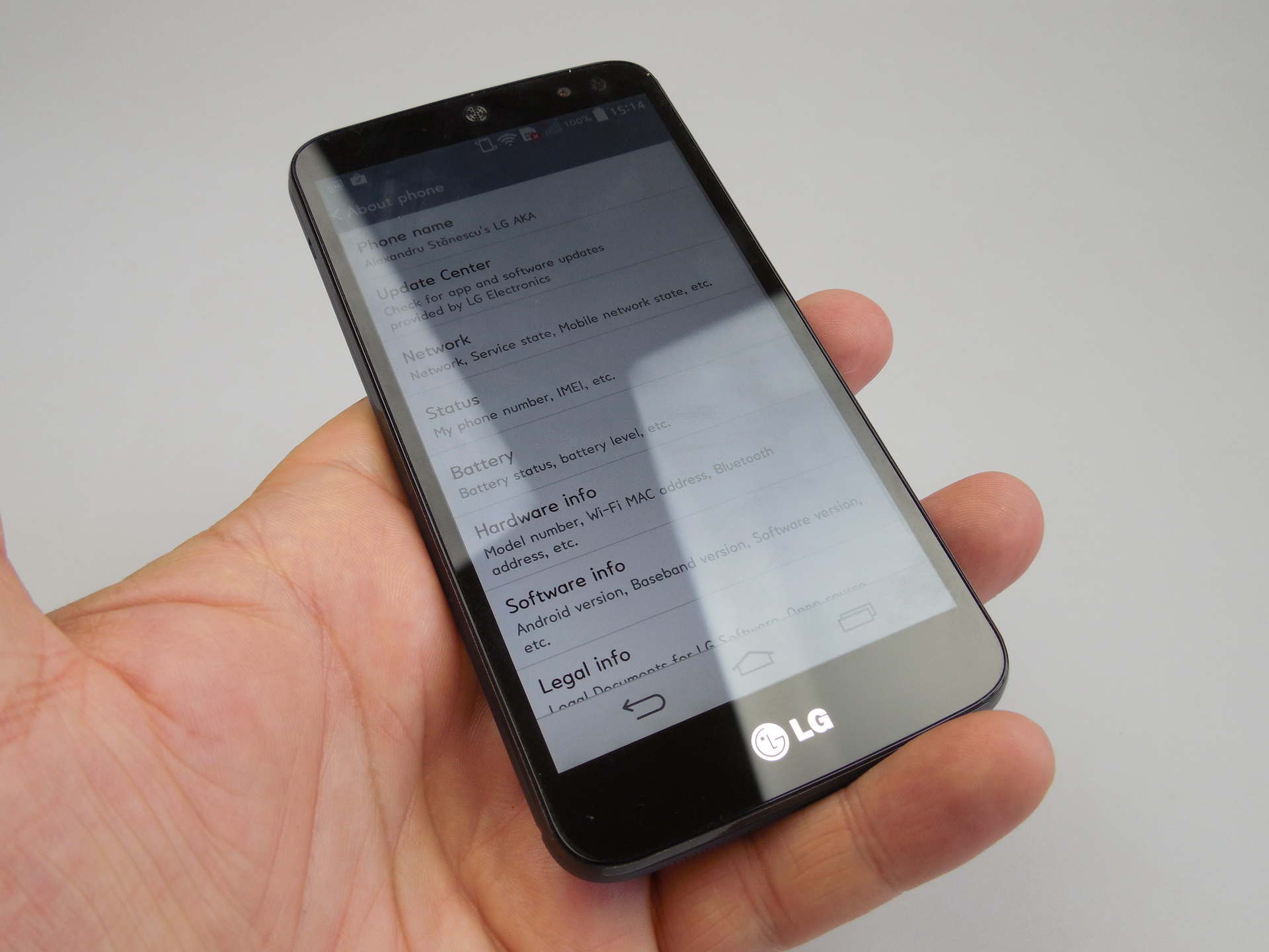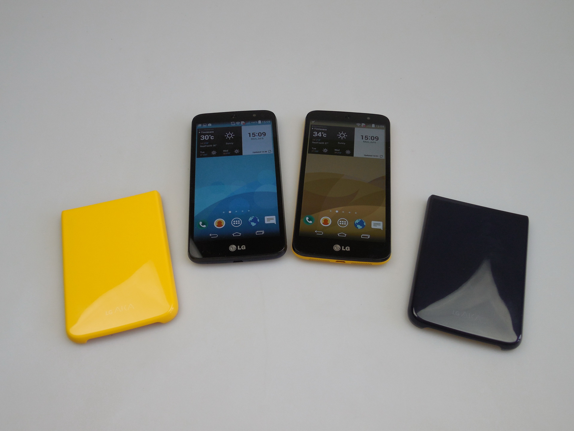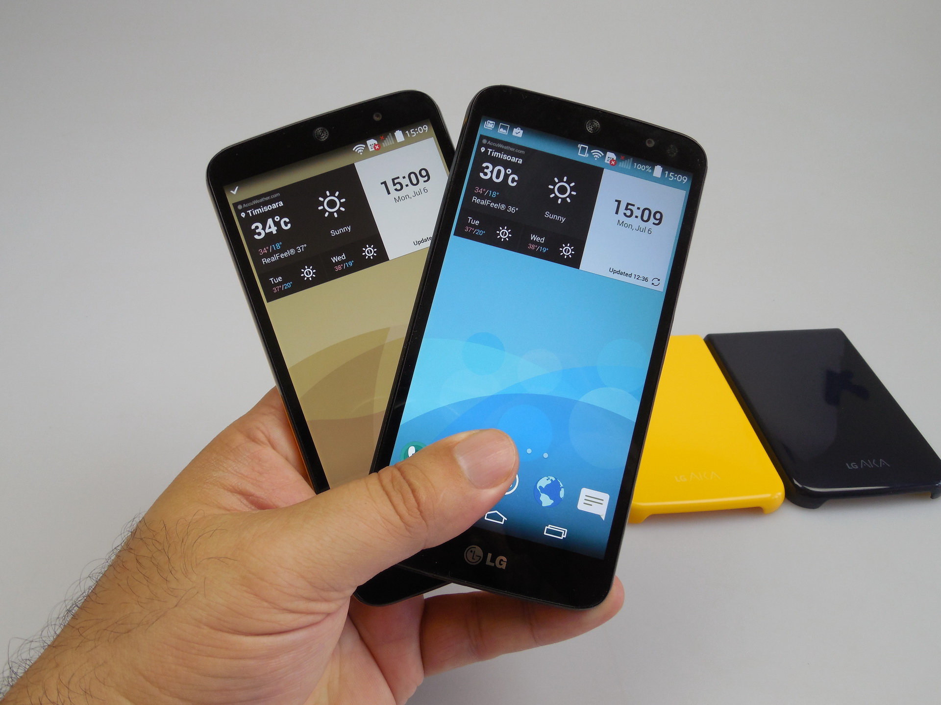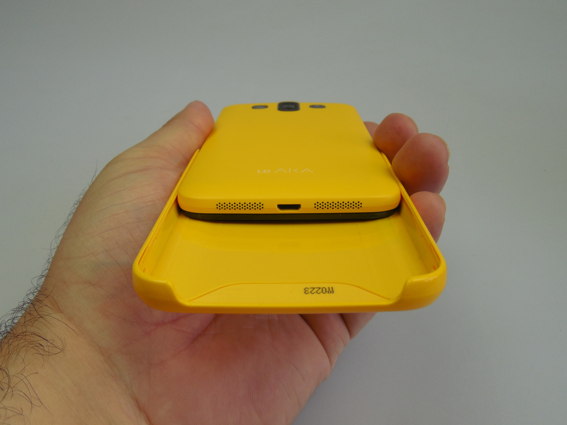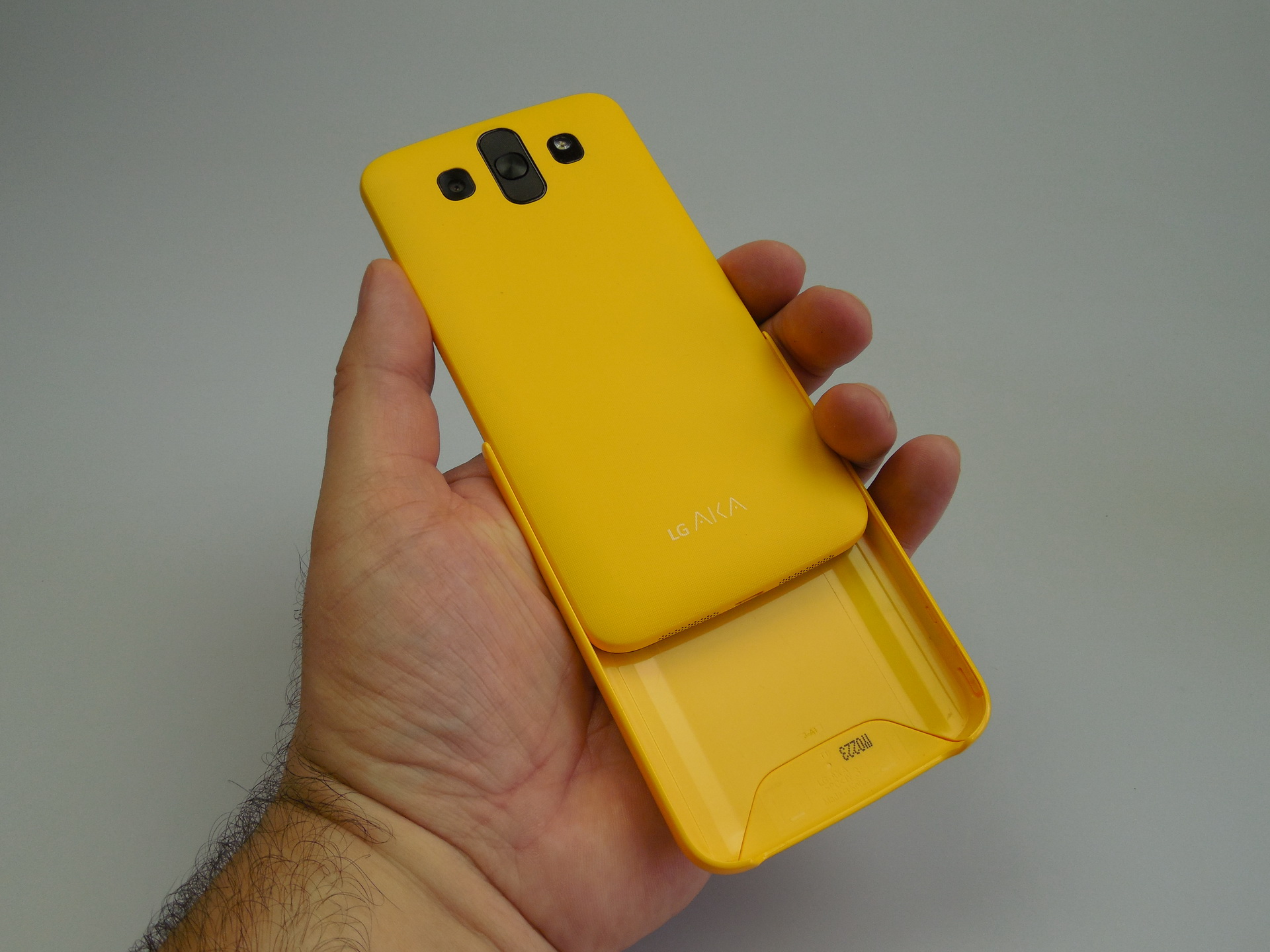 LG encourages placing stickers on the outer shell, by the way. Moving to the actual design analysis here, the device sports a small, round earpiece upfront, a front camera, sensors, status LED and a flossy facade. It also has big bezels and it’s a bit of a fingerprint magnet. The back side creaks when you touch it and holds the main camera, LED flash, laser autofocus mechanism, as well as the Power and volume buttons.