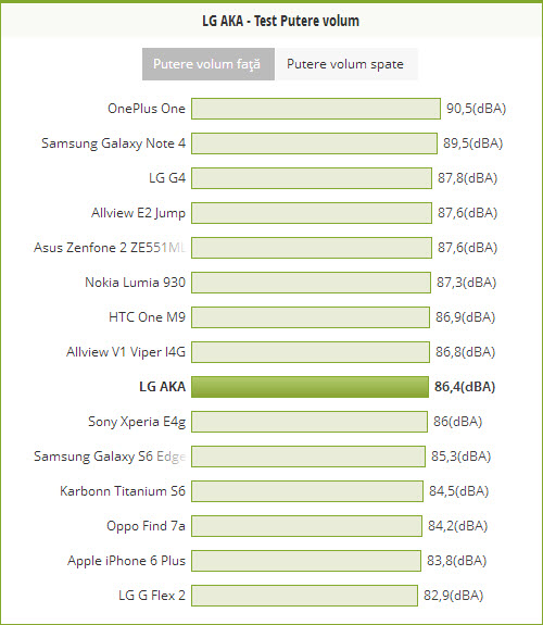 Since we are using headphones, the EQ is available and offers options like Normal, Bass Boost, Treble Boost or Vocal Boost. 7 custom channels are included and there’s no FM radio here. We did a decibelmeter test and achieved a value of 86.4 dBA for the LG AKA, which is good and it beats the LG G Flex 2 and its 82.9 dBA, plus the iPhone 6 Plus and its 83.8 dBA.